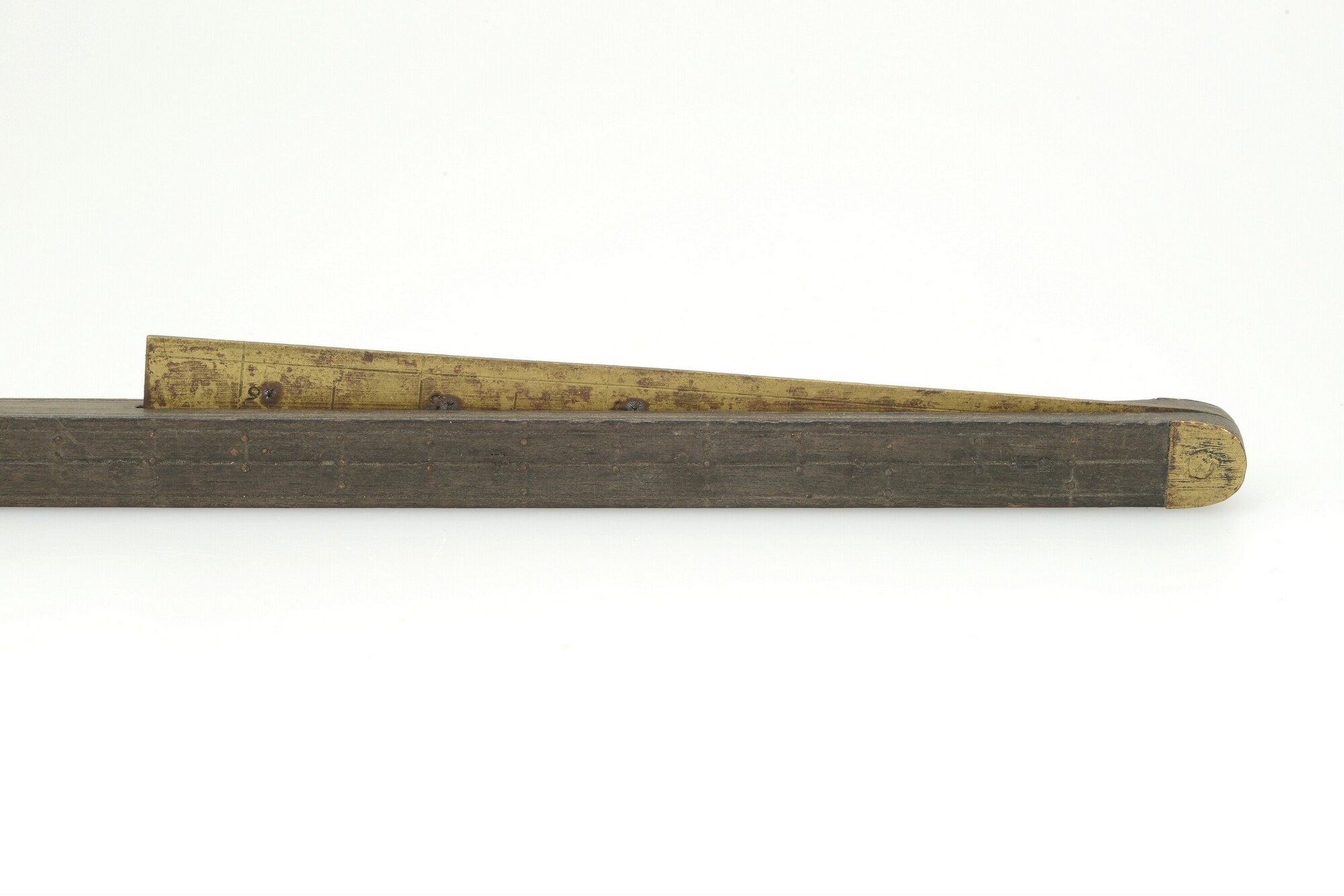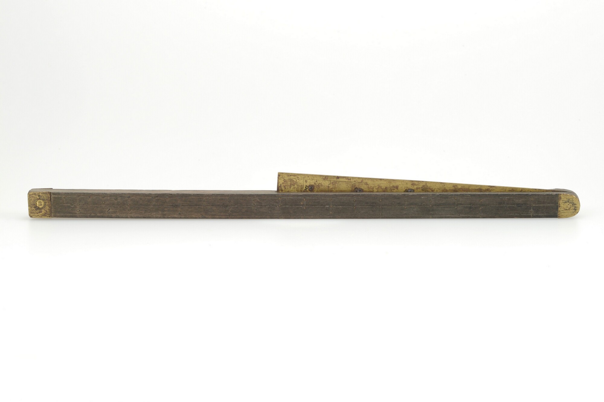 Duimstok of zwaaihaak; ebbenhout met koperlegering beslag en pennen. Op het uitklapbare deel loopt de schaalverdeling door tot en met 16. De afstand tussen de lijnen op de schaalverdeling is niet overal hetzelfde en varieert van 2.5 tot 2.65 cm.