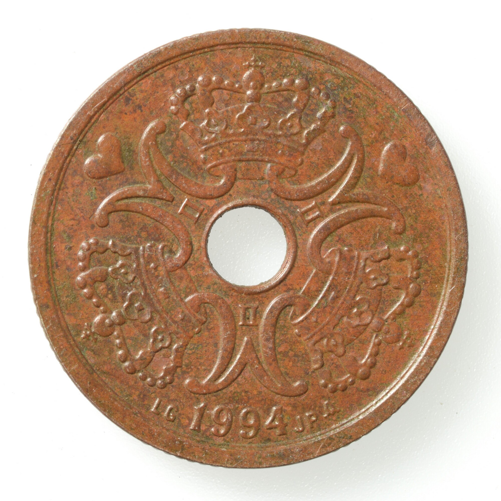 2 Kroner; Koninkrijk Denemarken (965-heden); Margerethe II (1972-2024); vz.: gekroond wapen van Denemarken en jaartal 1994; kz.: 2 KRONER DANMARK; centraal gat; gewicht: 5.89 gram