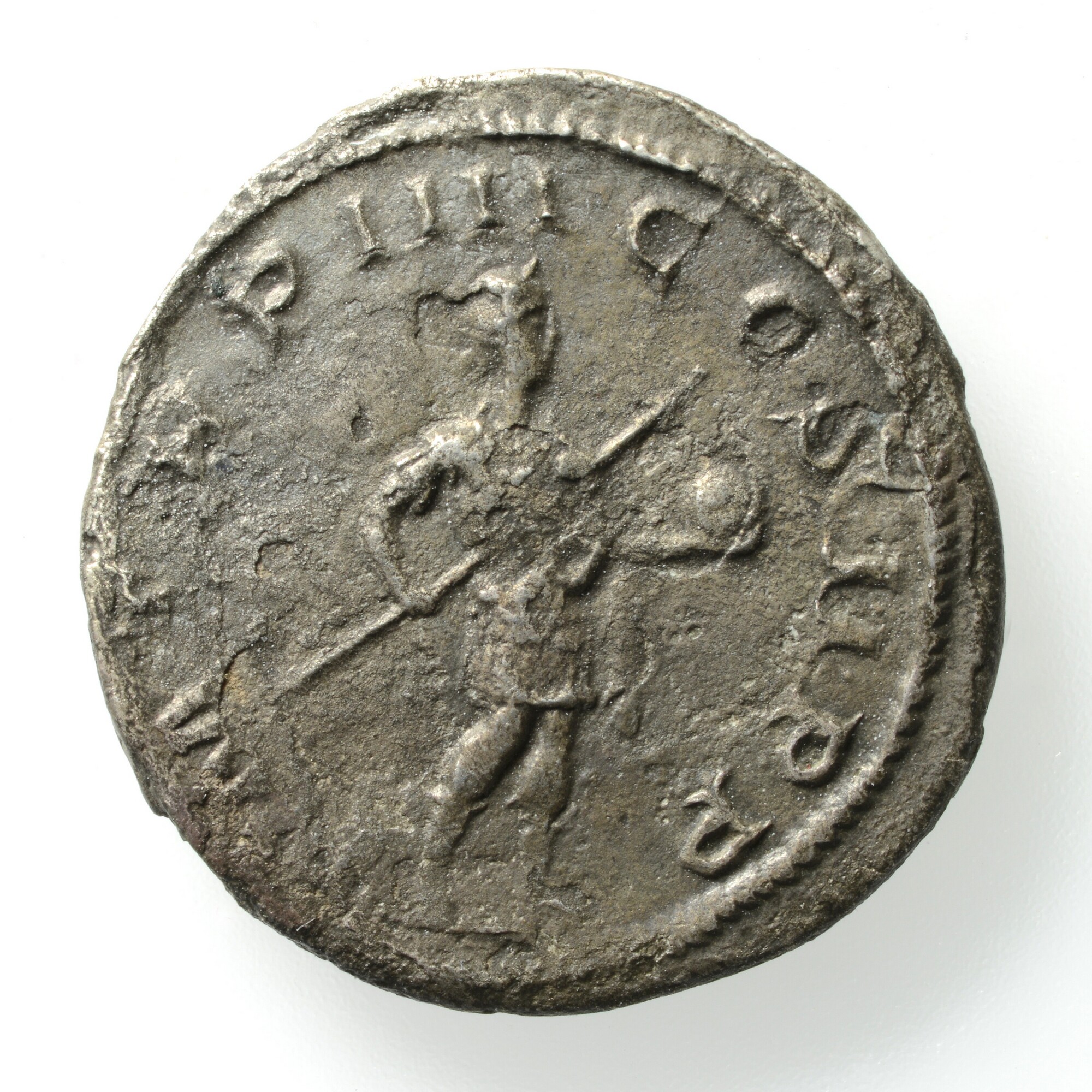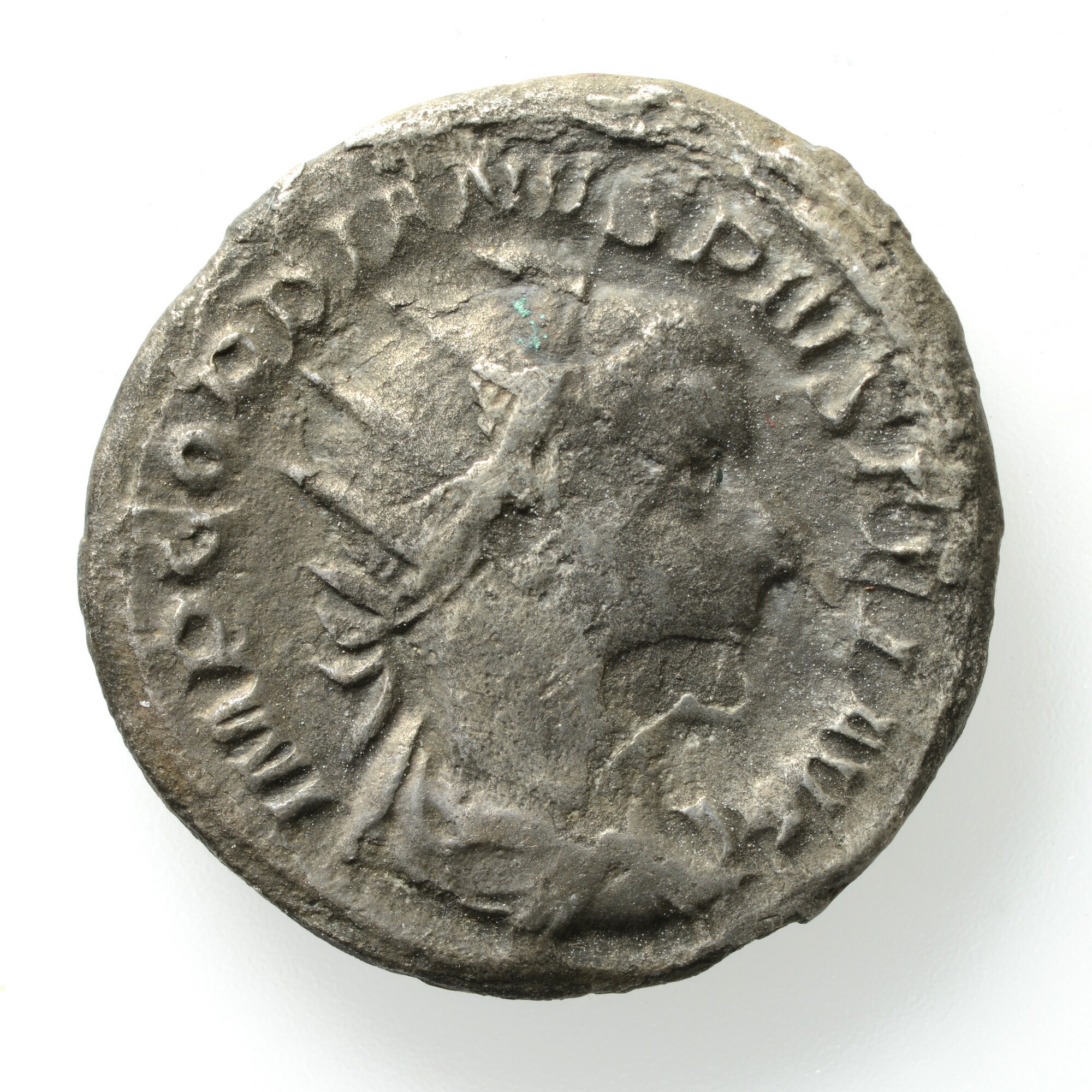 Antoninianus; Romeinse Keizerrijk; Gordianus III (238-244); vz.: IMP GORDIANVS PIVS FEL AVG, gedrapeerde buste met kuras en stralenkroon van Gordianus III naar rechts van achteren gezien; kz.: PM TR P IIII COS II PP, Keizer als soldaat staand naar rechts met speer en globe; gewicht: 3.24 gram