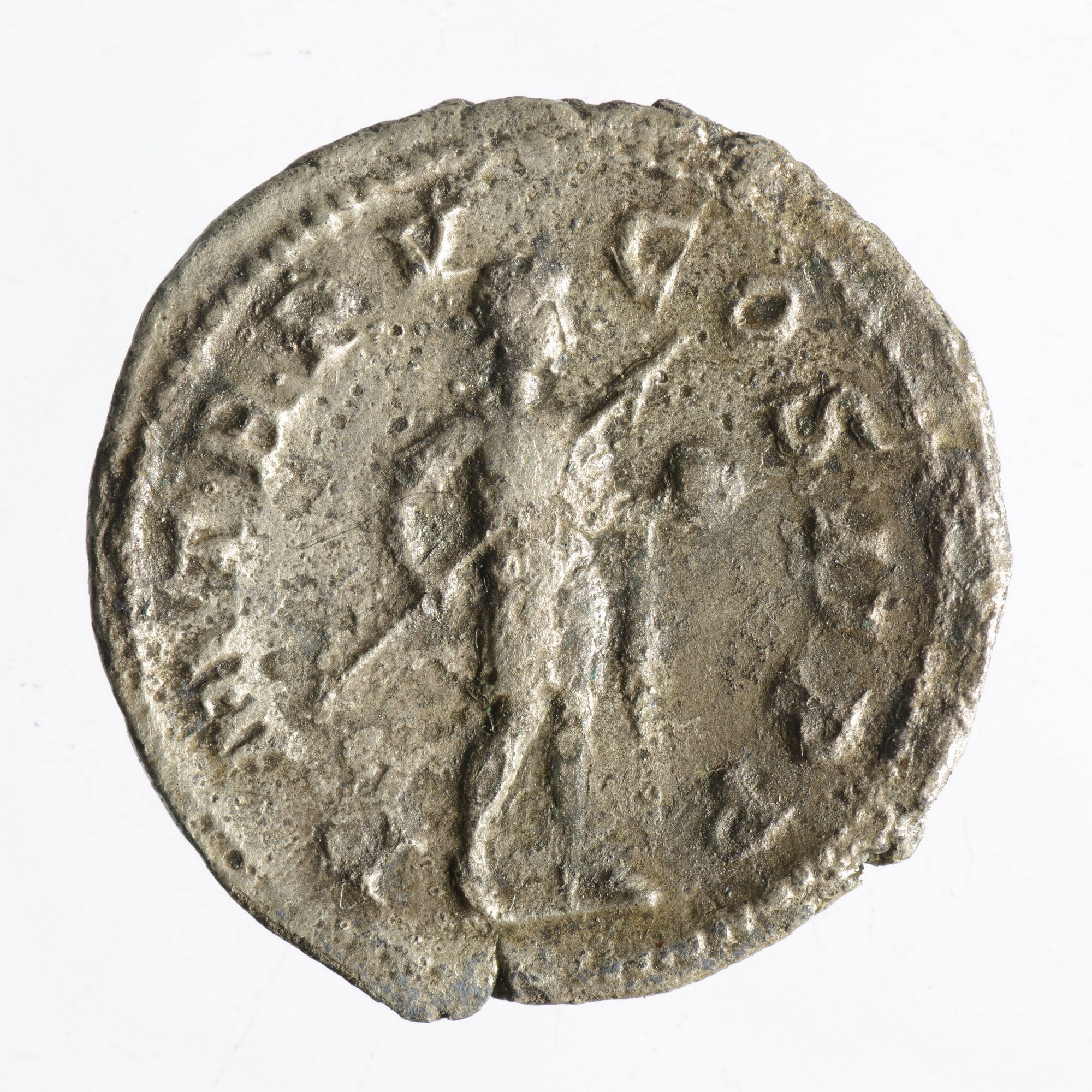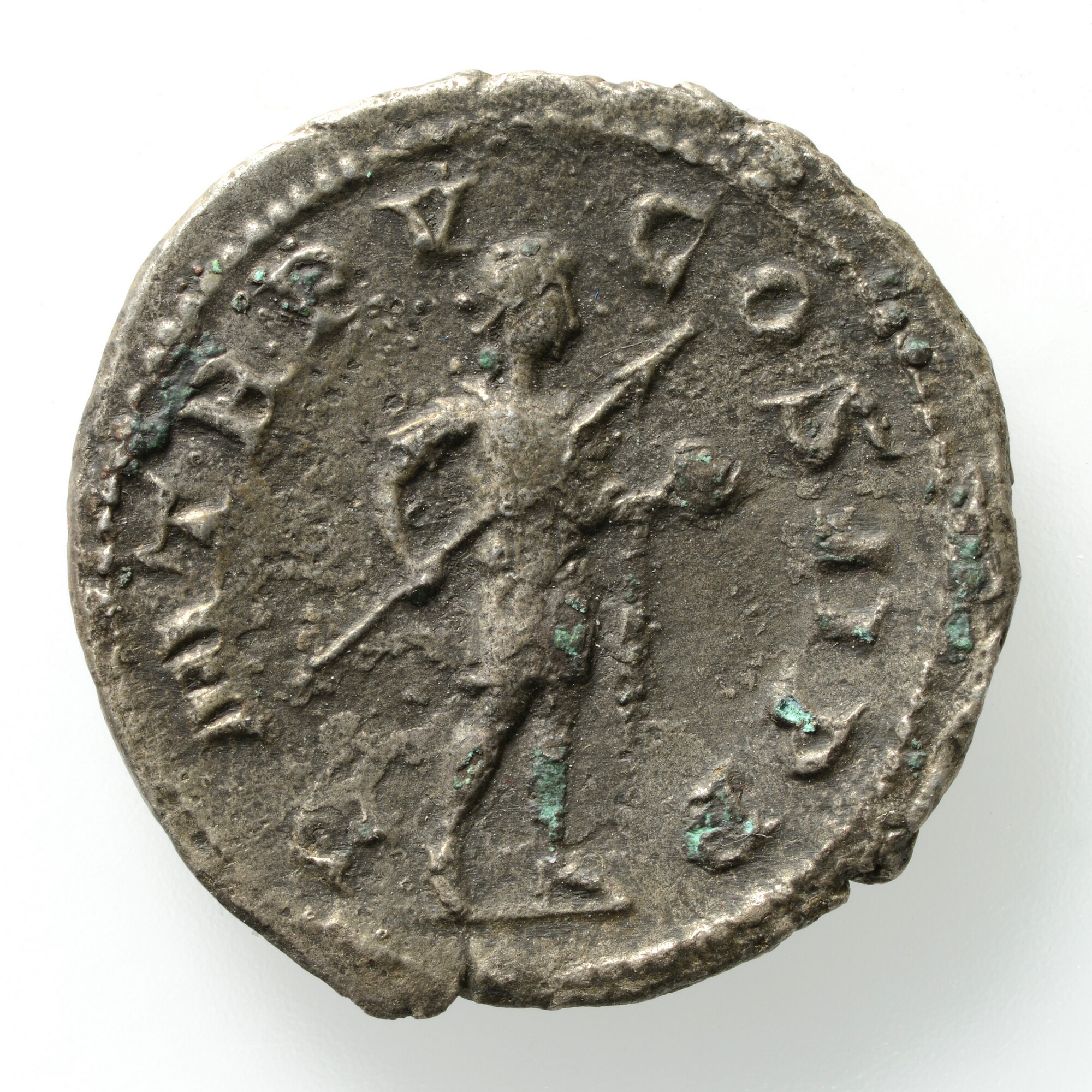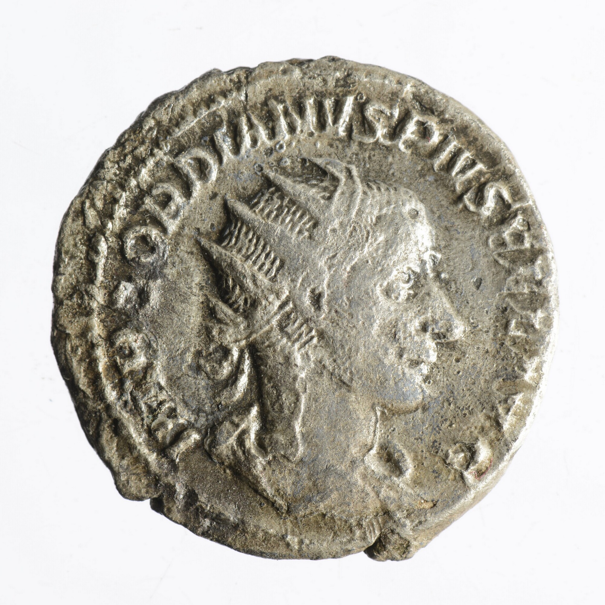 Antoninianus; Romeinse Keizerrijk; Gordianus III (238-244); vz.: IMP GORDIANVS PIVS FEL AVG, gedrapeerde buste met kuras en stralenkroon van Gordianus III naar rechts van achteren gezien; kz.: PM TR P III COS II PP, Keizer als soldaat staand naar rechts met speer en globe; gewicht: 3.68 gram
