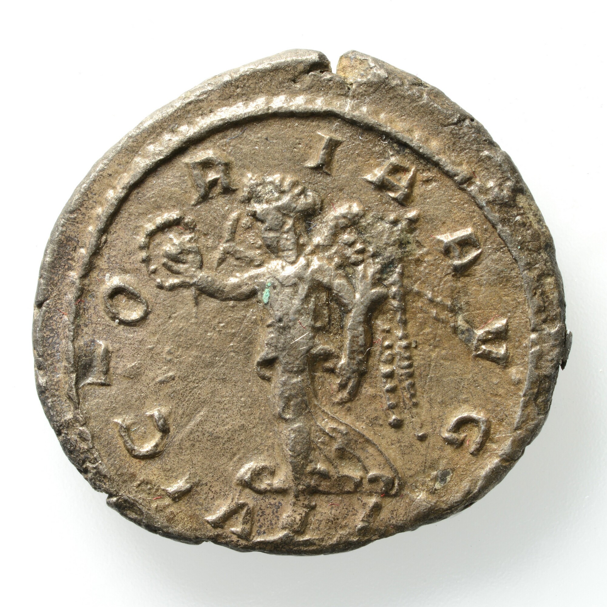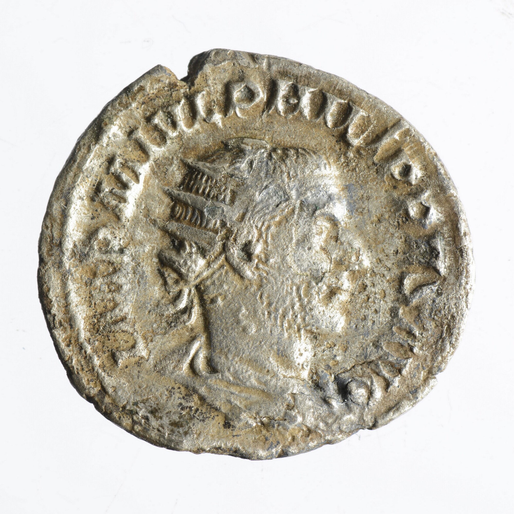 Antoninianus; Romeinse Keizerrijk; Philippus I (244-249); vz.: IMP M IVL PHILIPPVS AVG, gedrapeerde buste met kuras en stralenkroon van Philippus I naar rechts van achteren gezien; kz.: VICTORIA AVG, Victoria lopend naar links met krans en palmtak; gewicht: 3.35 gram