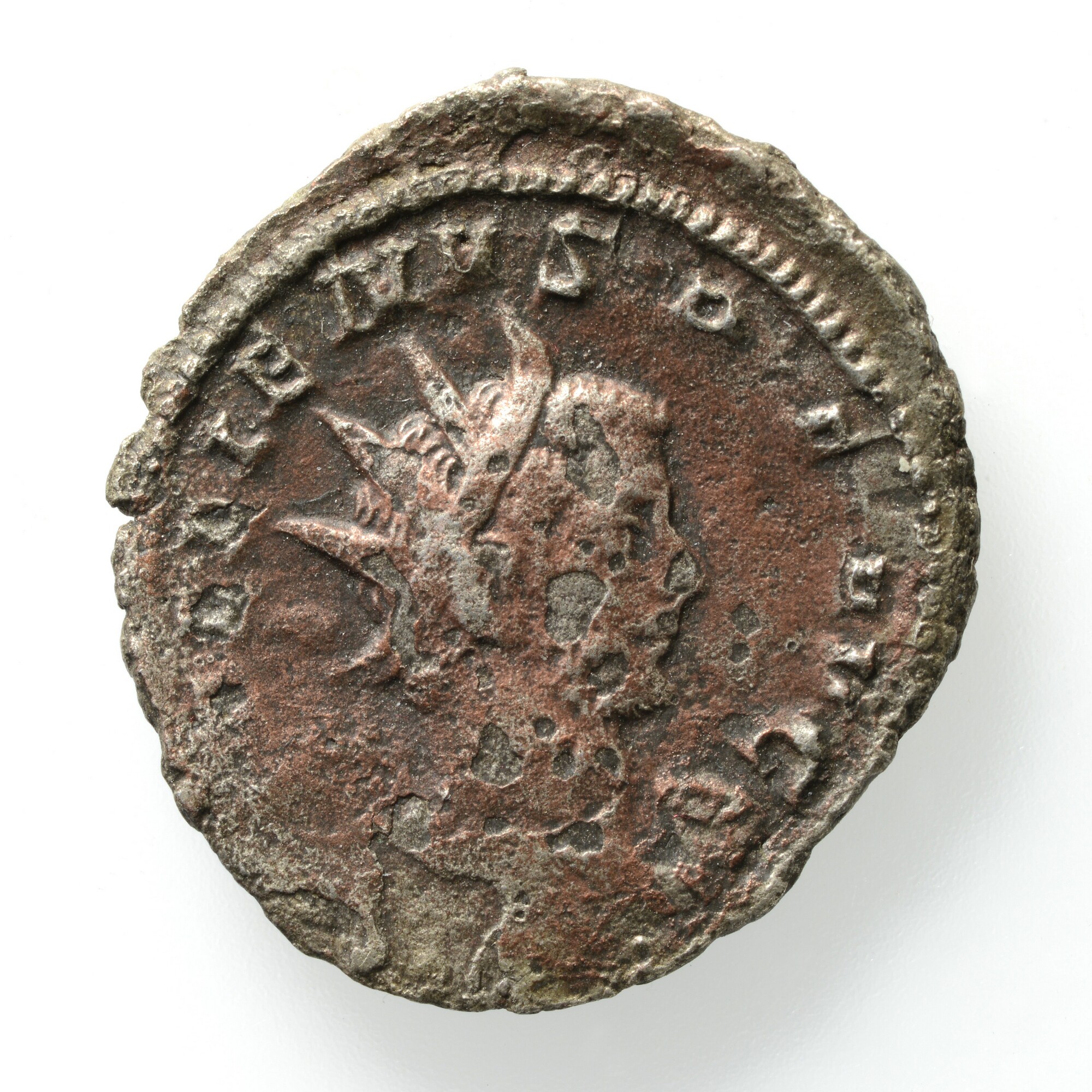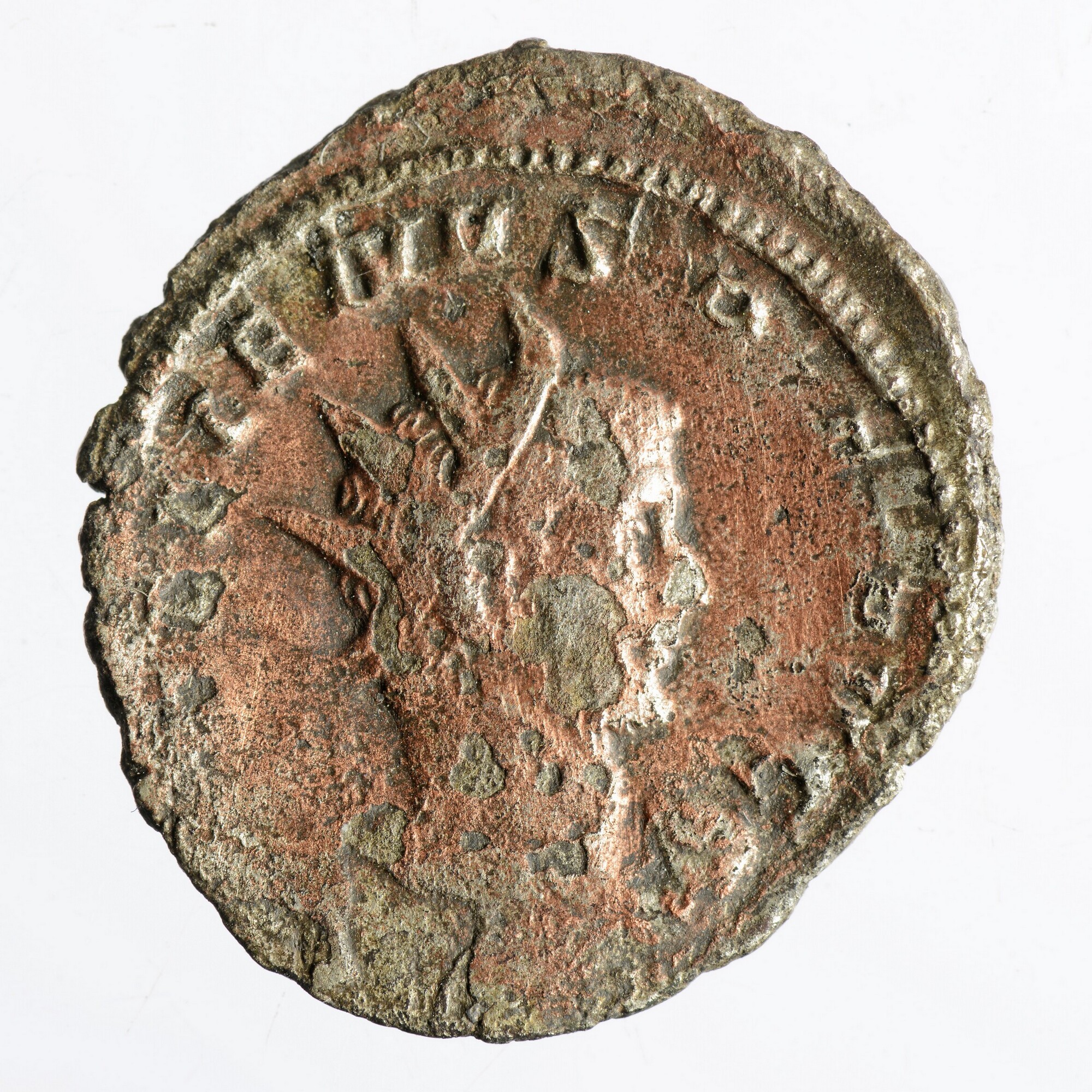 Antoninianus; Romeinse Keizerrijk; Gallienus (253-268); vz.: IMP GALLIENVS P.F. AVG, gedrapeerde buste met kuras en stralenkroon van Gallienus met speer links; kz.: GERMANICVS MAX V, trofee met gevangenen; gewicht: 3.07 gram; referentie: Göbl 8721