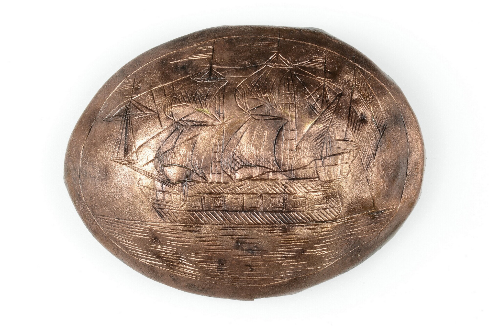 Deksel tabaksdoos; ovaal; afbeelding van een driemaster