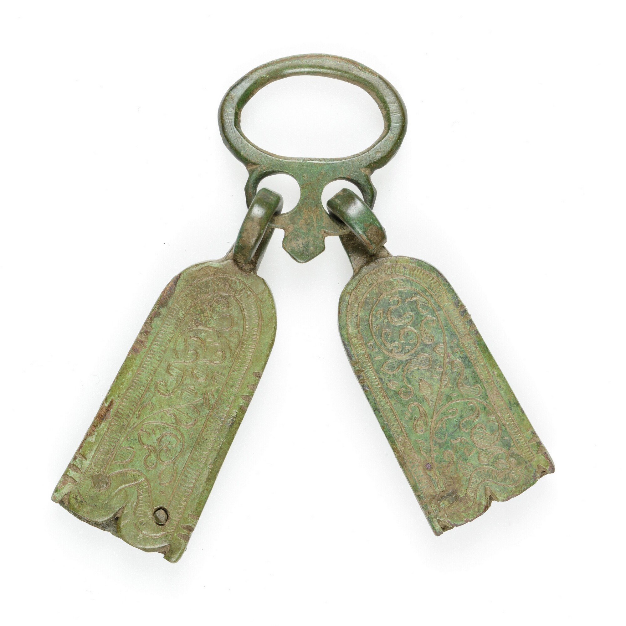 Riemverdeler; twee riemtongen met verdeler; versierd met florale motieven