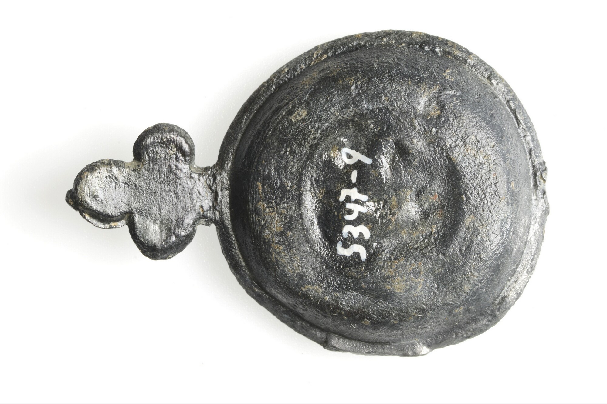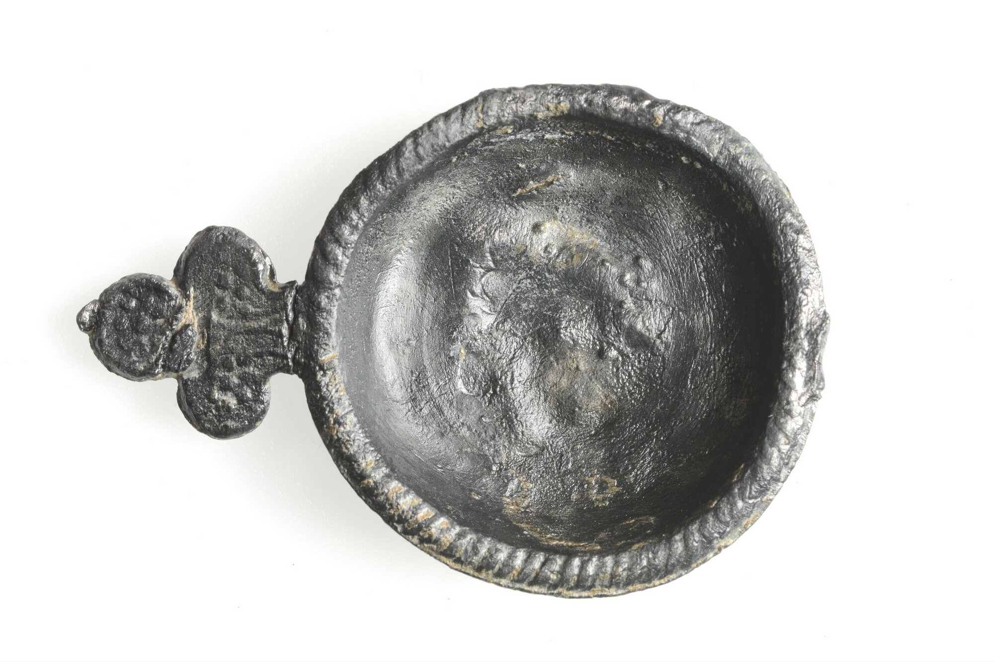 Brandewijnkom; sn-min-; miniatuur speelgoed oorkom met drielobbig oor op standvlak. De rand is versierd met een kartelmotief