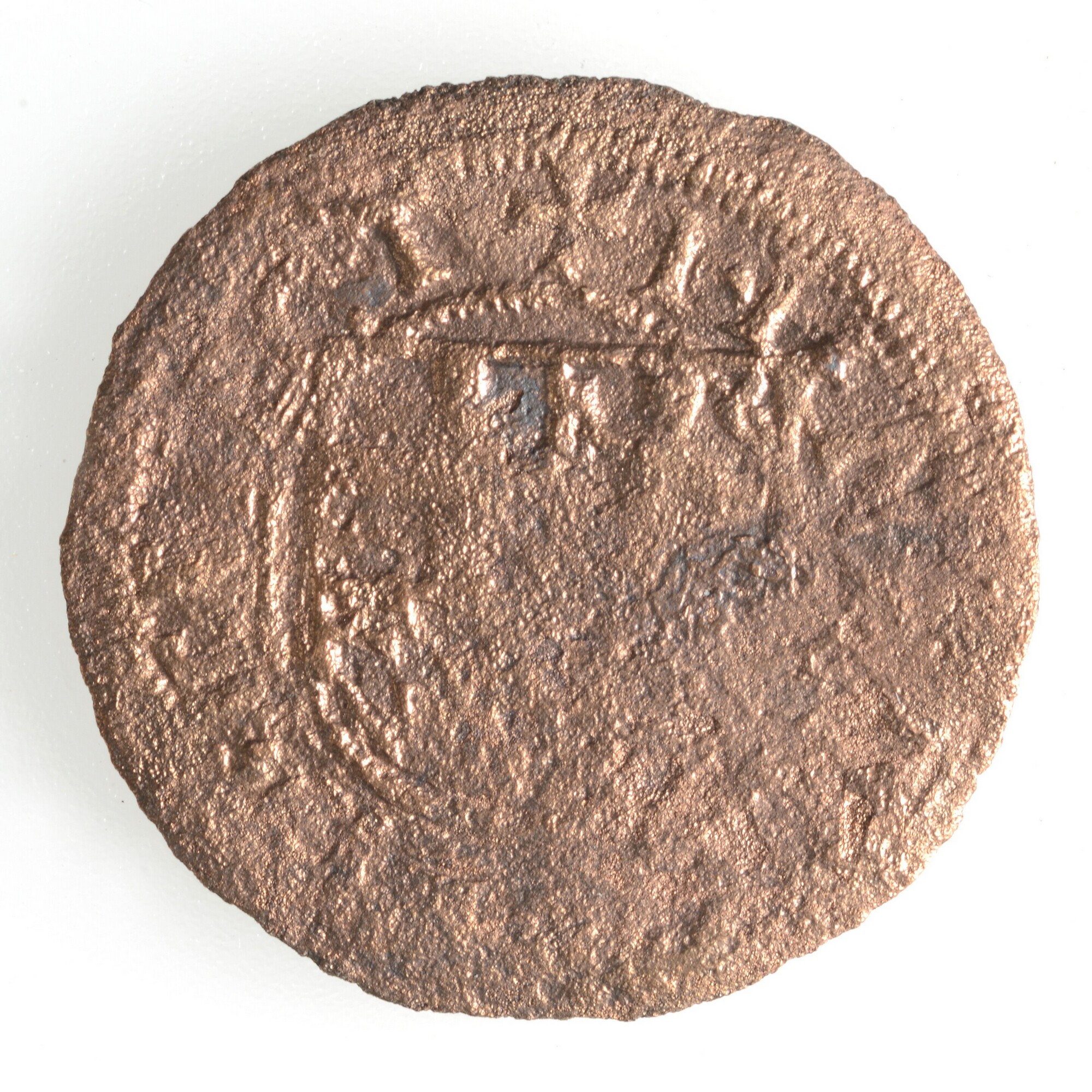 Duit; Stad Utrecht (1581-1795); vz.: bisschoppelijk wapenschild met vier kwartieren en randtekst + HENRICVS EPS TRIECT; kz.: gevoet en versierd kruis welke de tekst en de binnen cirkel doorbreekt, in de vlakken van het kruis staan leeuwtjes afgebeeld en randtekst ANN O.DO MINI.; gewicht: 1.17 gram