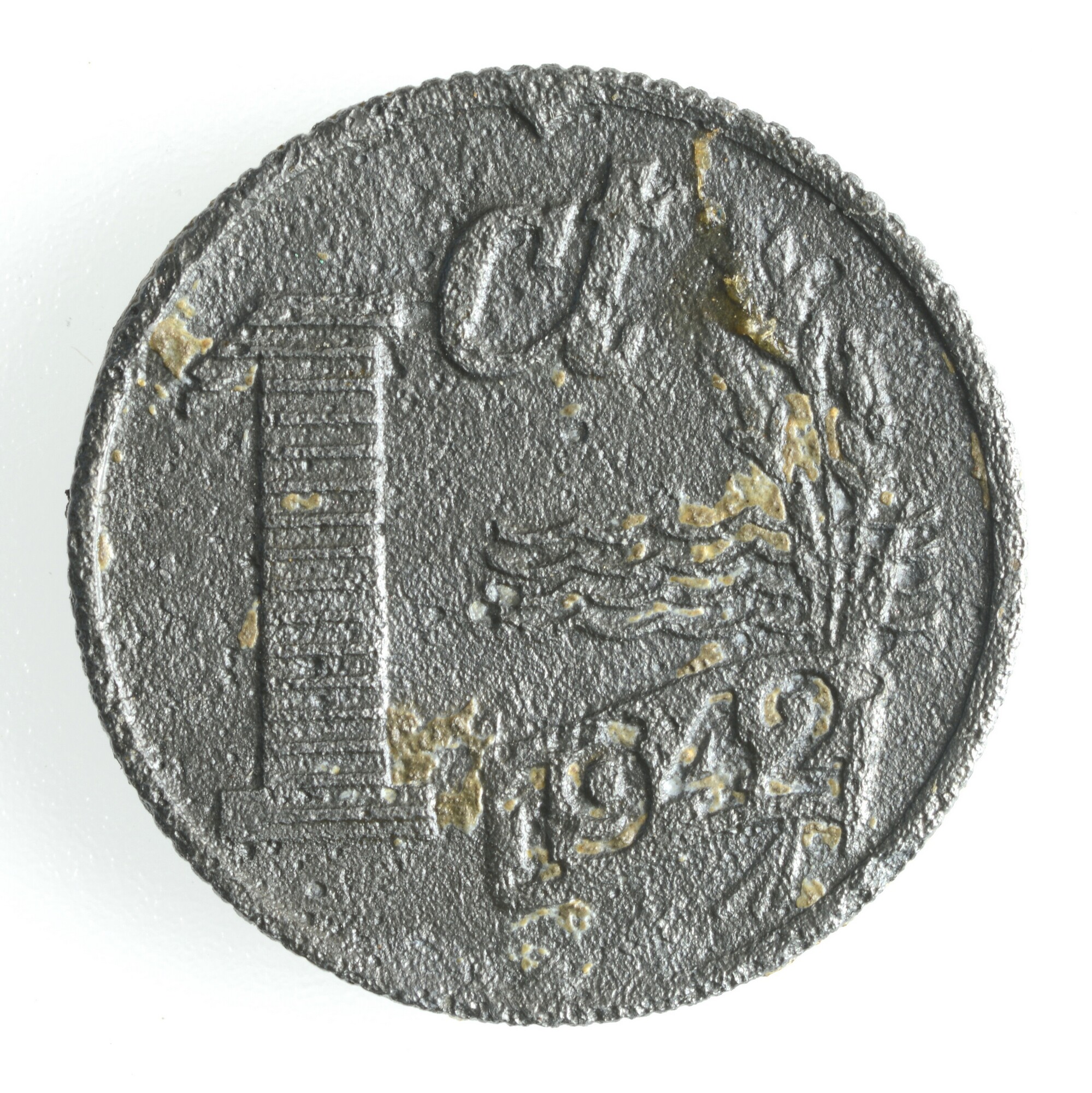 Cent; Nederland Koninkrijk (1813-heden); Wilhelmina (1890-1948); vz.: recht kruis met onderaan de tekst NEDERLAND; kz.: 1 ct met vier golven en drie korenaren en het jaartal 1942; muntplaats: Utrecht; gewicht: 1.84 gram