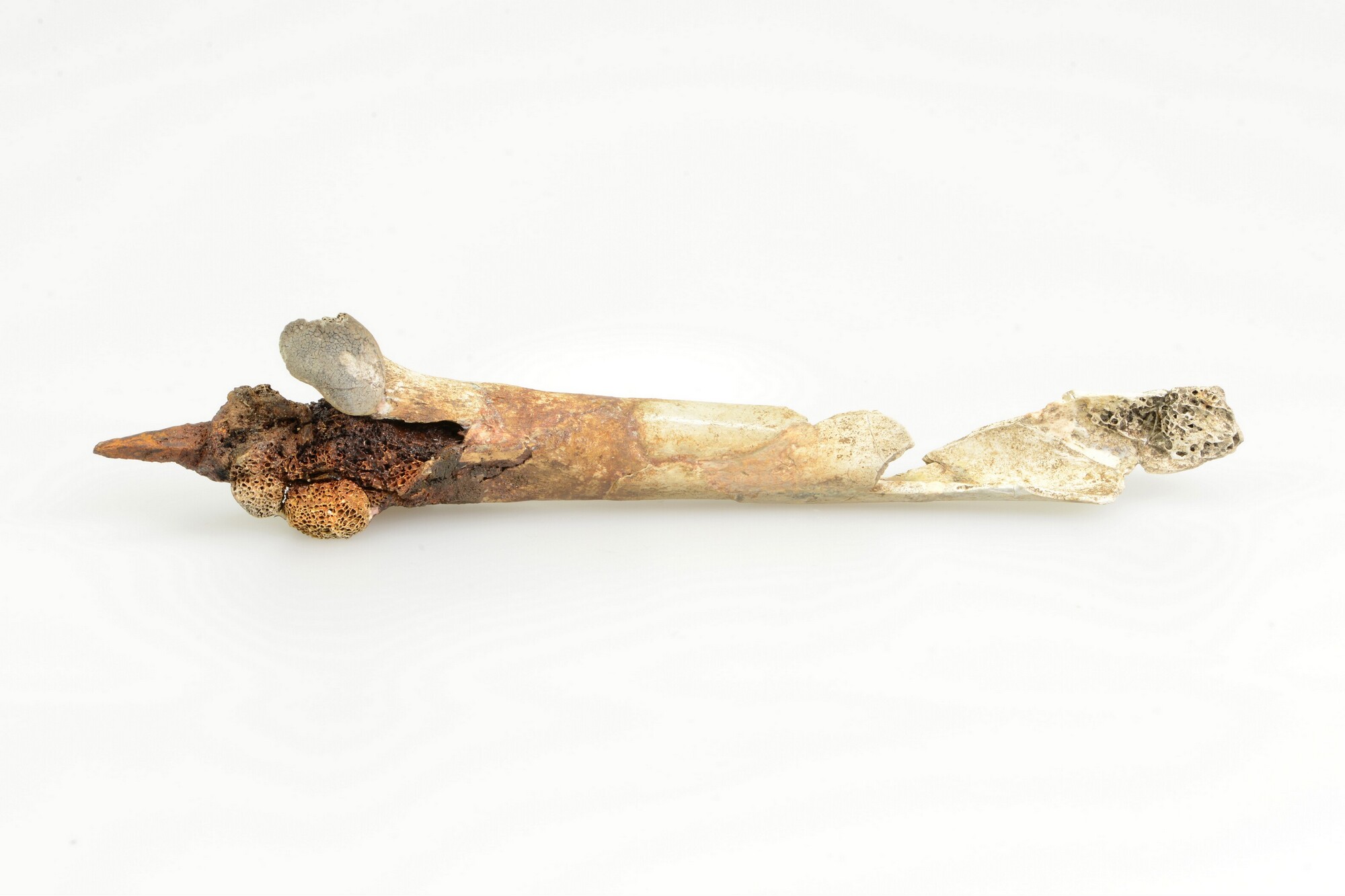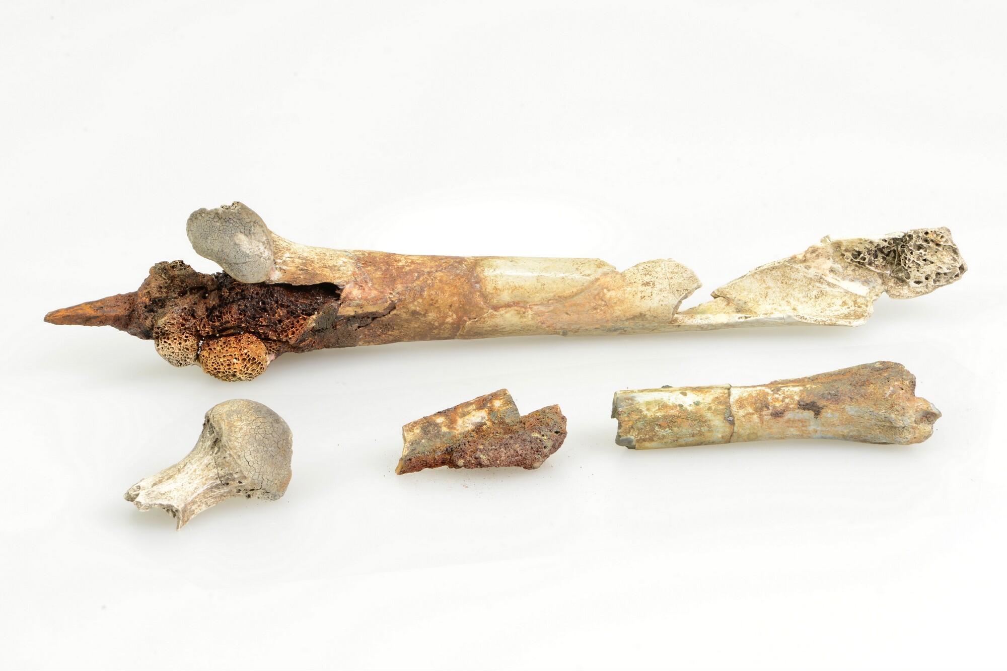 Priem; verbrand bot met punt van ijzer; meerdere niet bijbehorende fragmenten verbrand bot