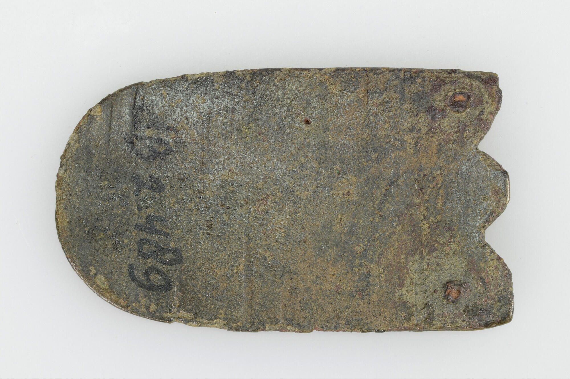 Riemtong; punt-cirkelversiering. Vastgeklonken met twee nageltjes