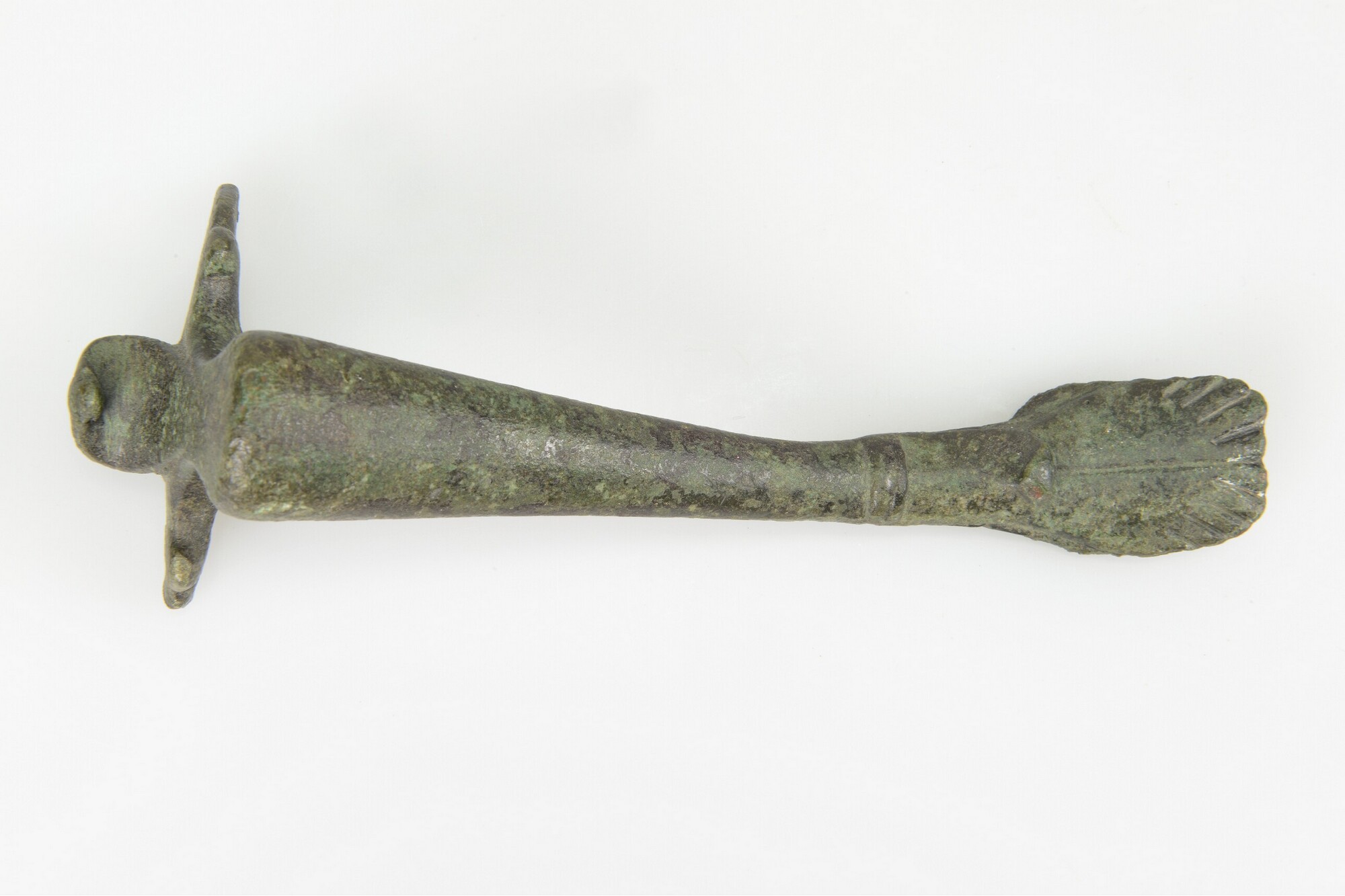 Handvat kan; type Den Boesterd 288; het handvat loopt uit in twee voeten en aan de bovenzijde is een deel van een vogel te zien