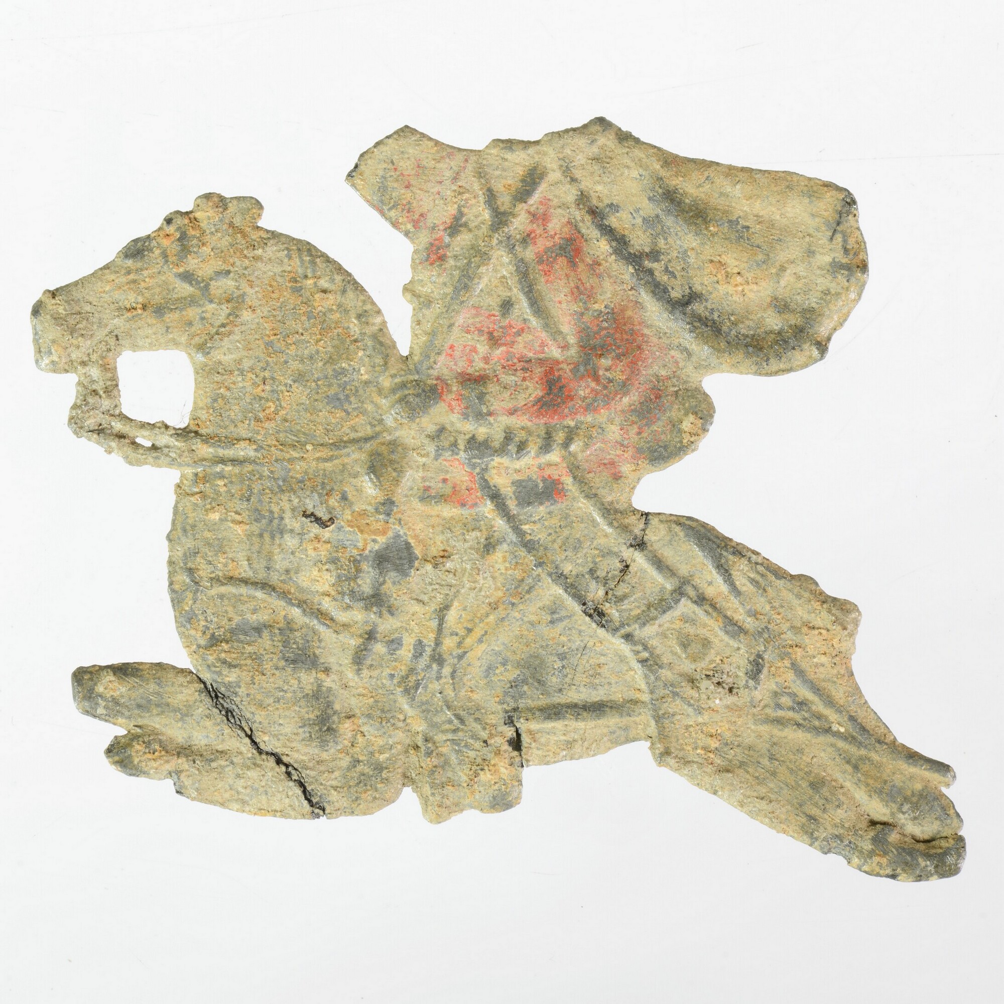 Tinnen soldaat; fragment; ruiter; Hongaarse huzaar te paard; rood gekleurde uniformjas herkomst: Neurenberg of Fürth