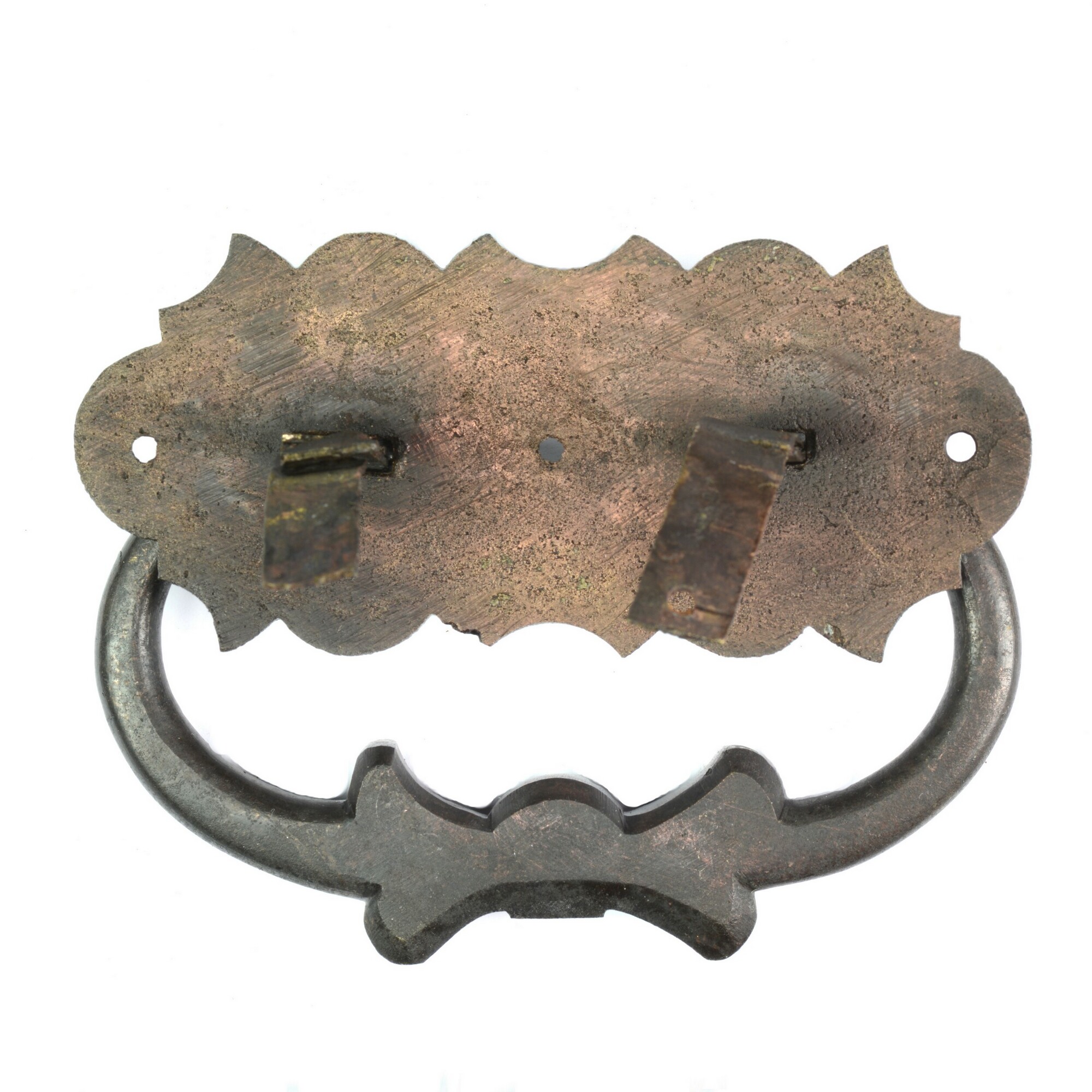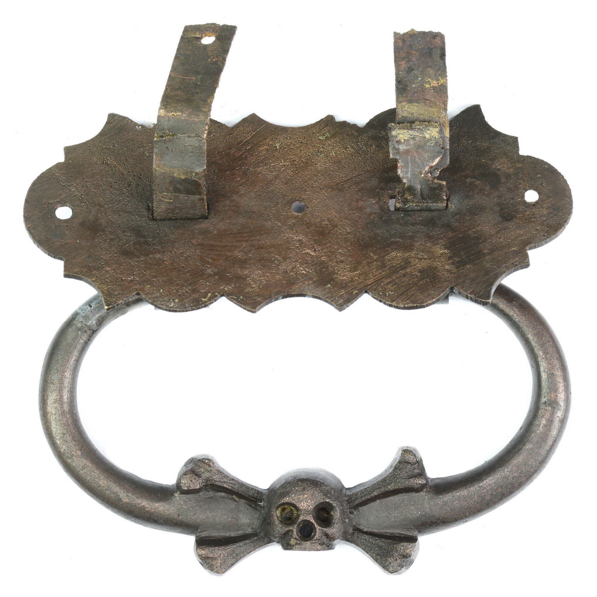 Handgreep met beslagplaat van een doodskist; handvat in de vorm van een liggende C waarvan de uiteindes zijn omgesmeed, voor het omgesmede deel bevind zich een bevestigingsoog dat met een pin aan de kistwand verbonden is; versierd met een schedel met gekruiste beenderen