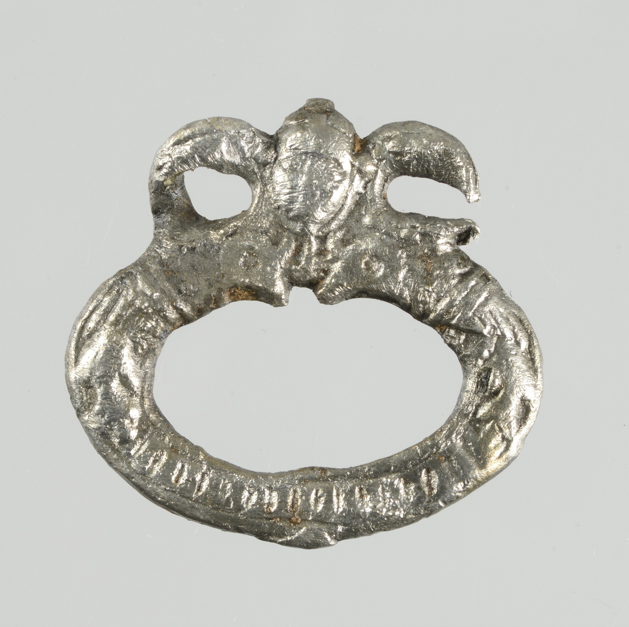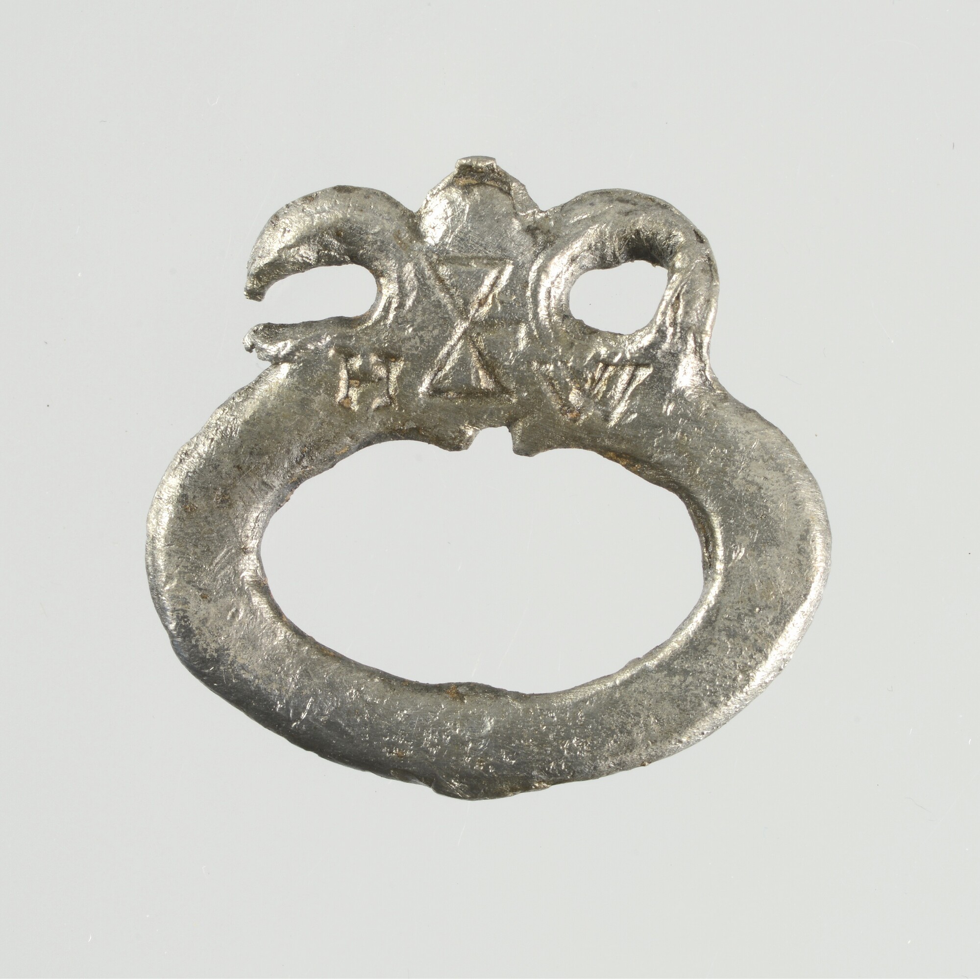 Gordelsluiting; middenstuk met op de voorzijde versierd met een vrouwen- of engelenkopje; op de achterzijde staat een huismerk (zandloper) met de initalen HW