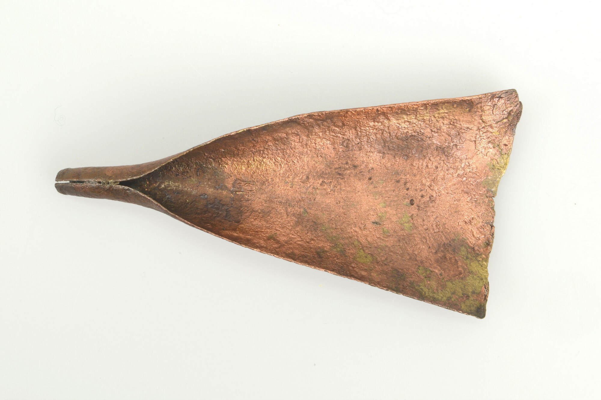 Trechter; medisch/scheikundig instrument?; schoenlepelvormig instrument dat eindigt in een buisje. Op de voorzijde is het object gemerkt met een lelie