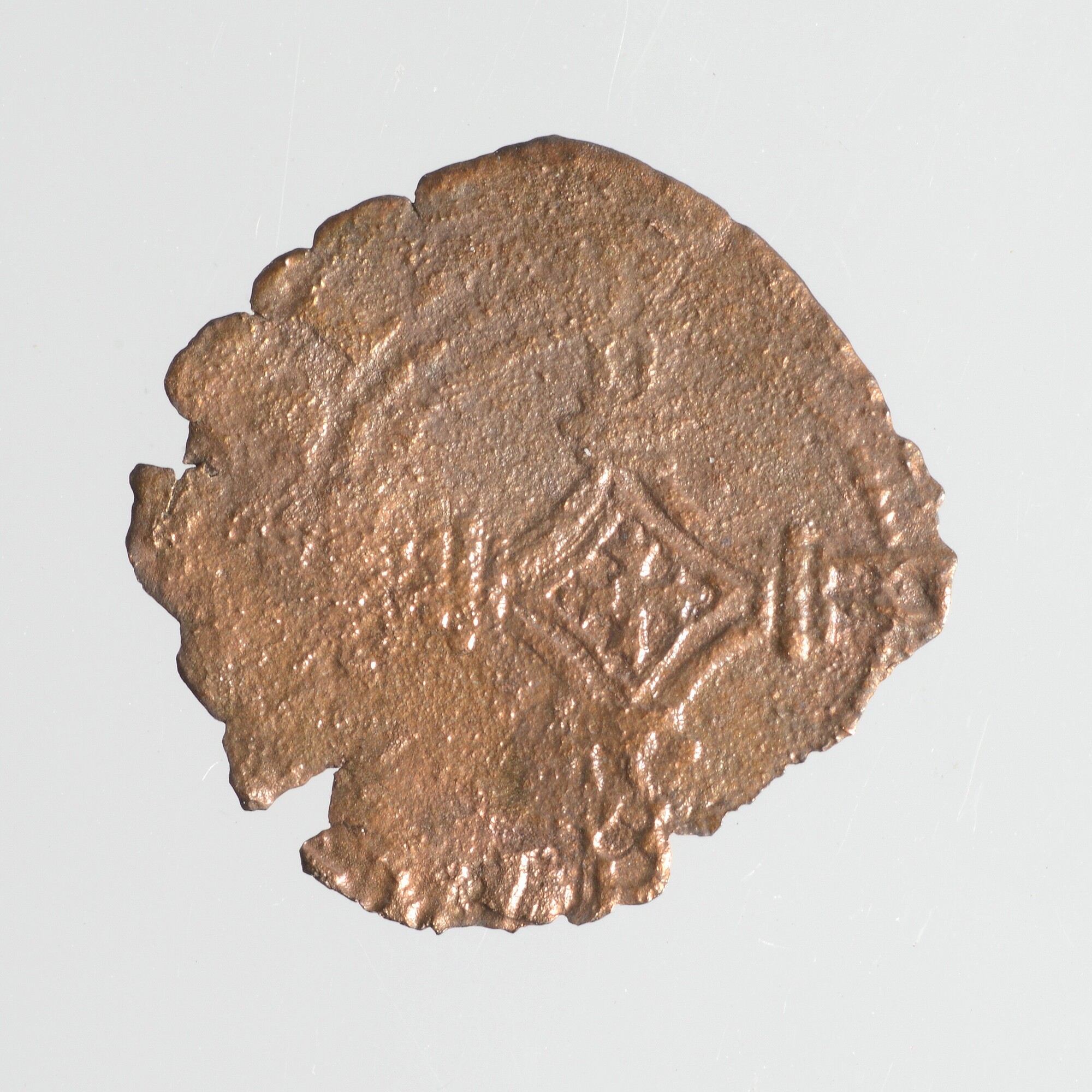 Muterken; Nijmegen stad; vz.: stadwapen van Nijmegen binnen parelcirkel, met omschrift +MON[E]TA.NOVA.NOV[IMAG[...]; kz.: lang versierd kruis, armen eindigend door de parelrand en roosje in het midden, met omschrift PAX / SIT / S[.].P / NOB; muntplaats: Nijmegen; gewicht: 0.26 gram