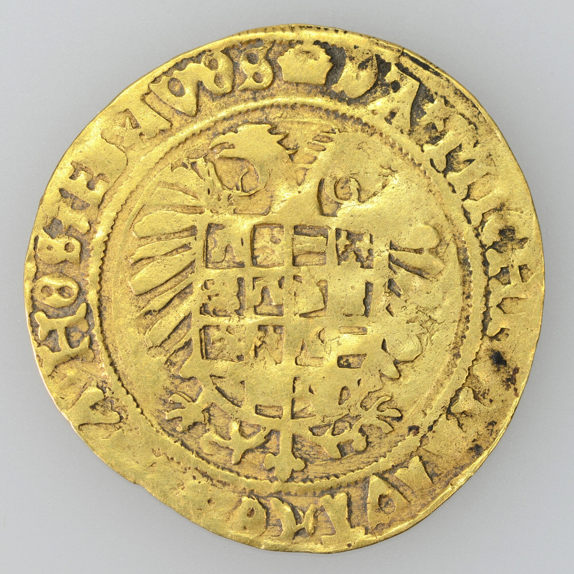 Karolusgulden; Maastricht, stad; Karel V (1506-1555); vz.: gekroonde vorst naar rechts met zwaard en rijksappel binnen parelcirkel met omschrift (ster)KAROLVS.D.G.ROM.IMP.Z.HISPA.REX; kz.: tweekoppige adelaar achter het wapen van o.a. Castilië, Leon, Oostenrijk en Bourgondië binnen parelcirkel met omschrift (kroon) DA.MICHI.VIRTVTEM.CONTRA.HOSTES.TVOS; muntplaats: Maastricht; zeer zeldzaam; gewicht: 2.88 gram; referentie: Gelder / Hoc 185-2a, Vanhoudt II 222.MA.var (kroon ...