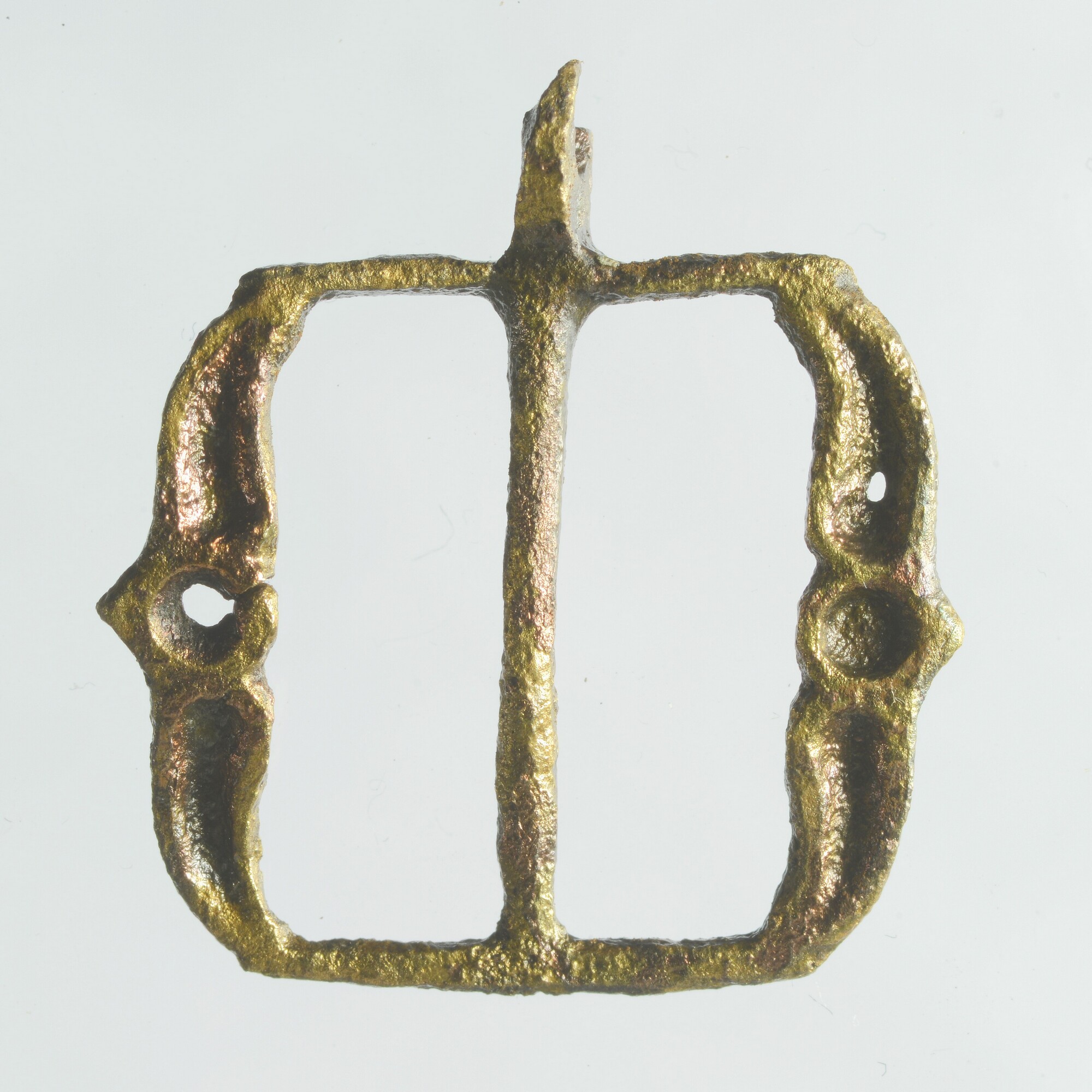Koppelpassant; beugel met opengewerkte accoladevormige zijden, rechthoekige basisvorm. Middenstijl met eronder een oog