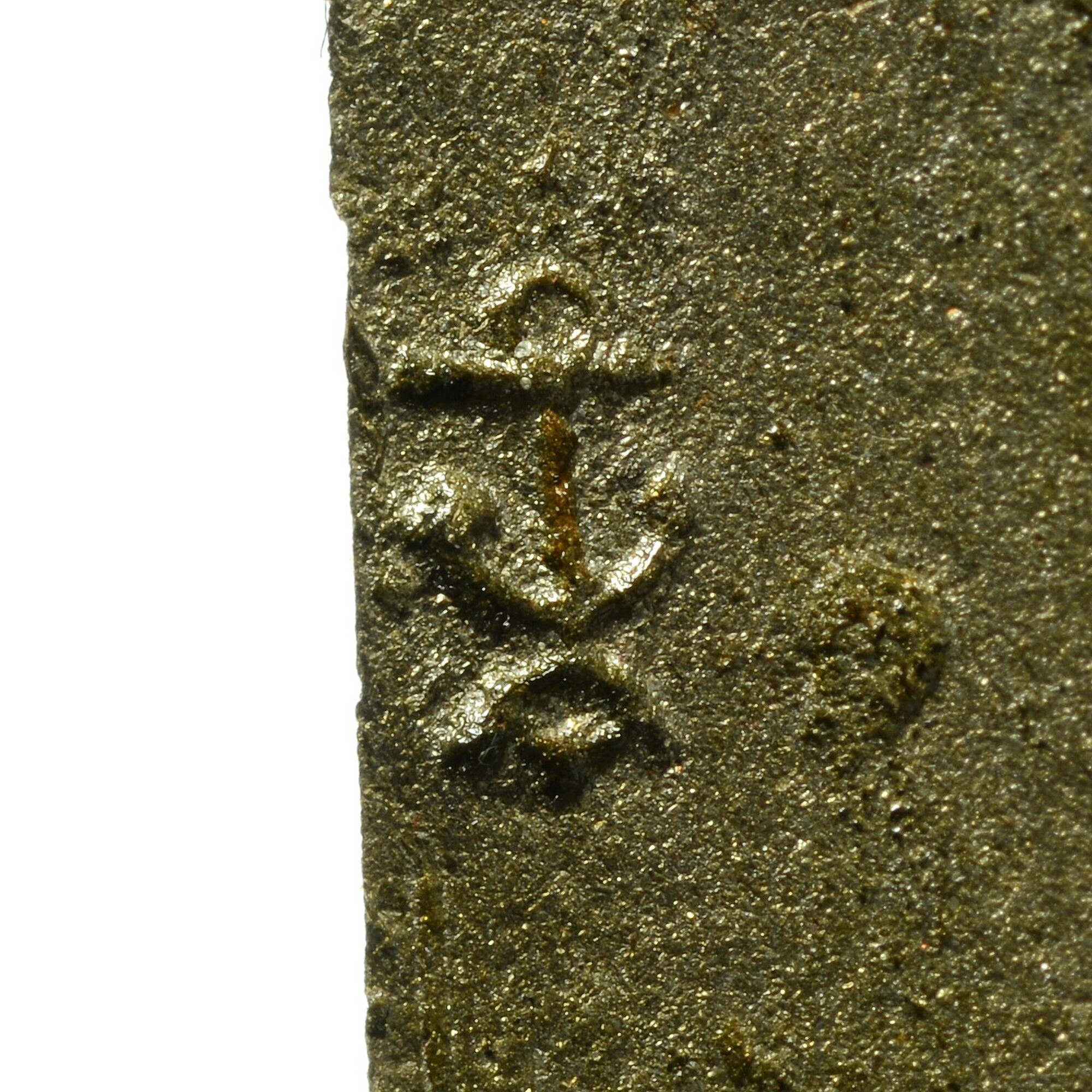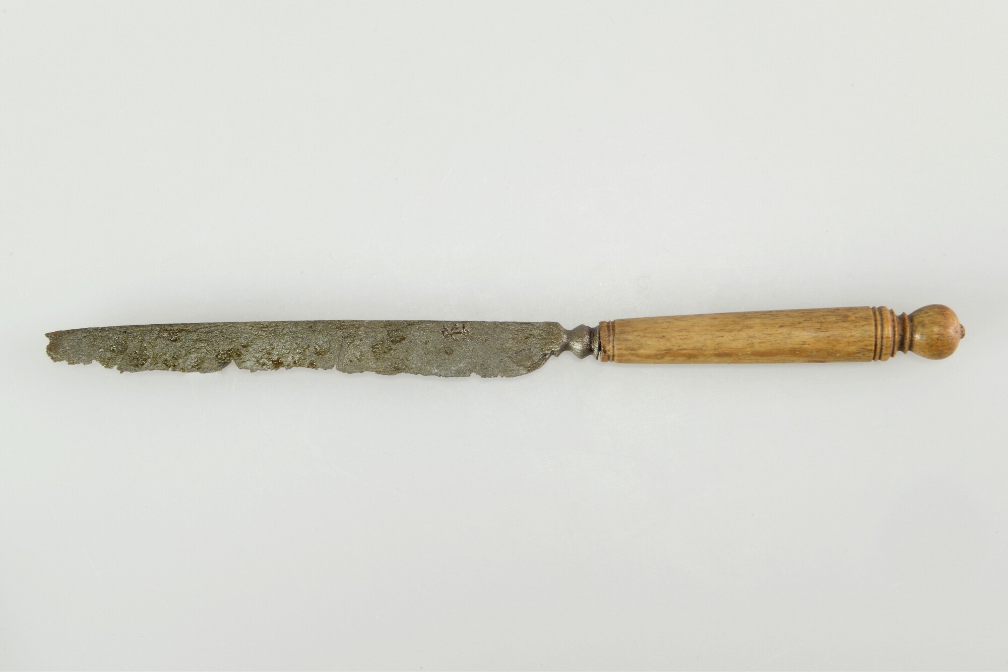 Mes; smal eensnijdend lemmet, driehoekig in doorsnede met merkteken; heft vervaardigd uit been met een bolvormige knop