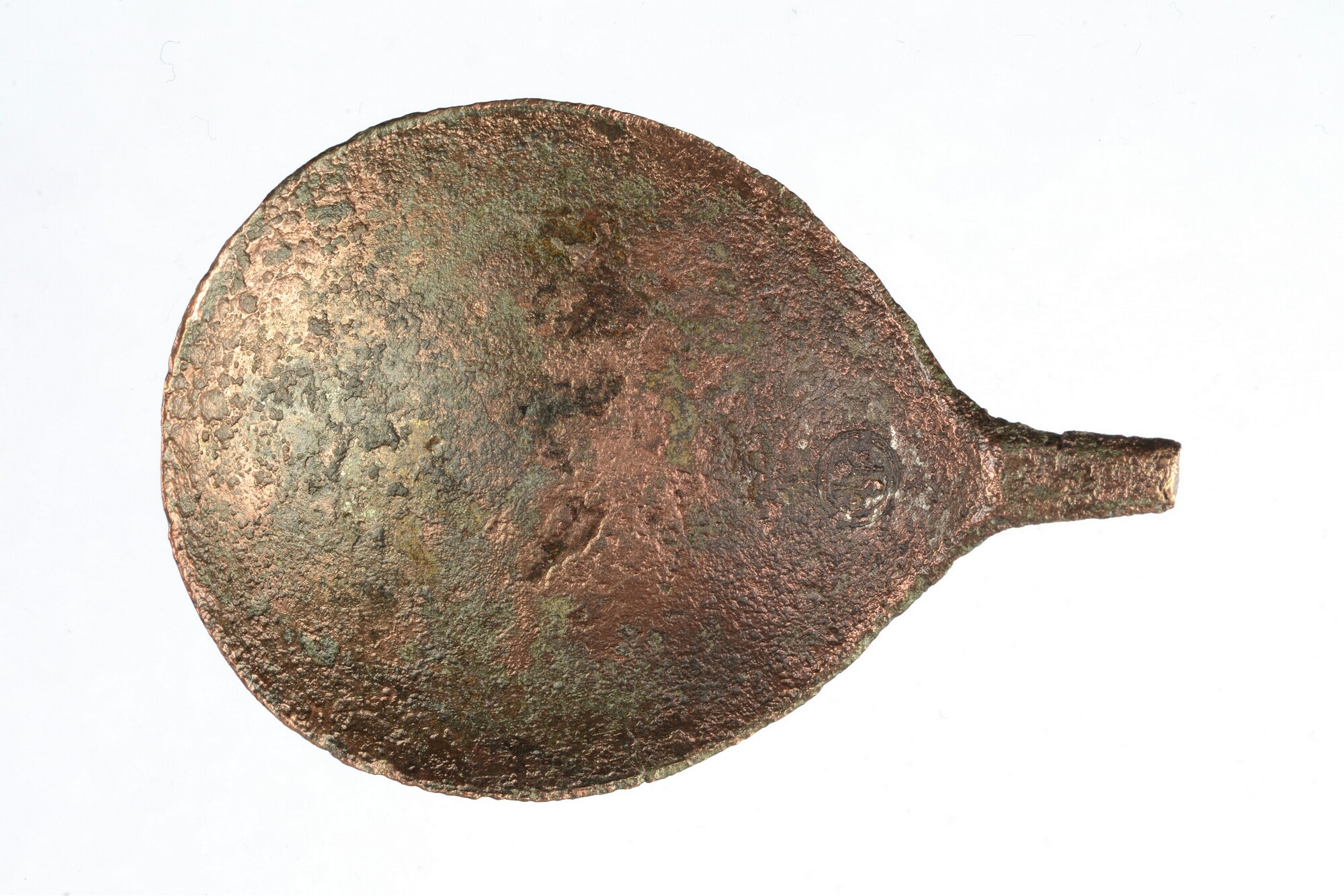 Lepel; vijgvormige bak en fragment steel. Steel is zeshoekig in doorsnede; merkteken binnenzijde bak; herkomst: Engeland