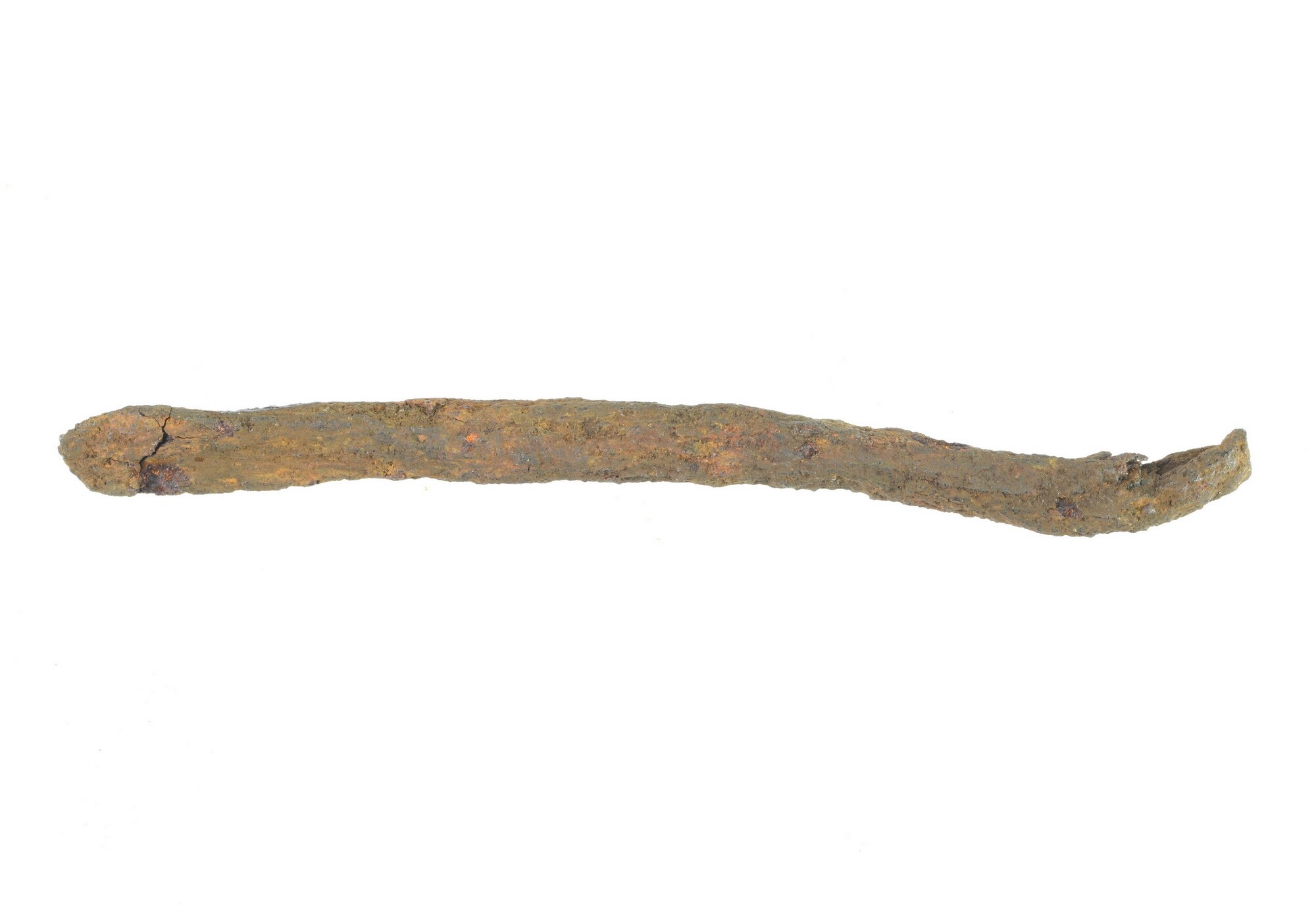 Staaf; staafje is aan een zijde plat in doorsnede en aan de andere zijde rond in doorsnede en enigszins gebogen
