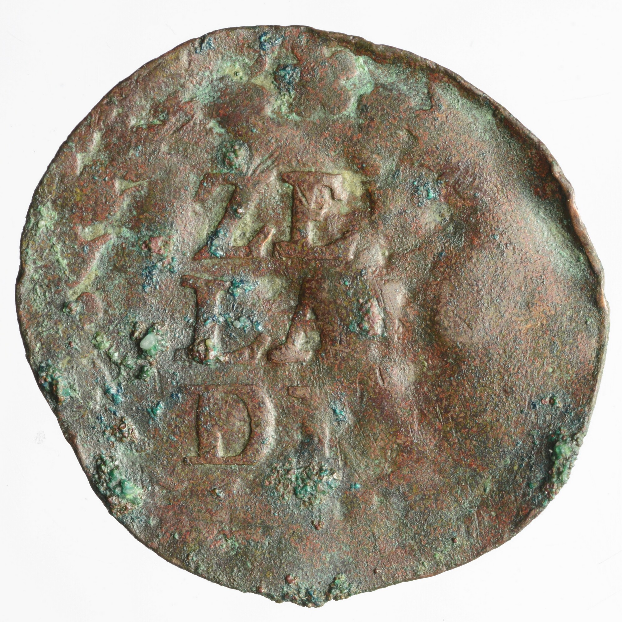 Duit; Provincie Zeeland (1581-1795); vz.: in drie regels ZEE / LAN / DIA binnen bladerkrans kz.: Hollandse maagd in tuin, aan het hek van de tuin het wapenschild van Zeeland, omschrift onleesbaar; gewicht: 1.04 gram