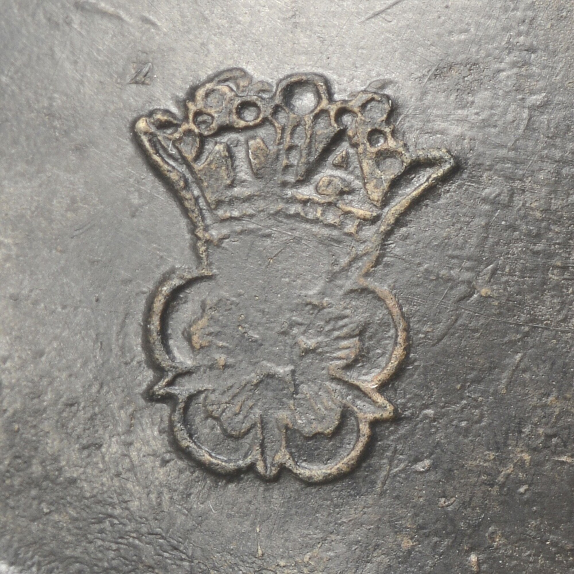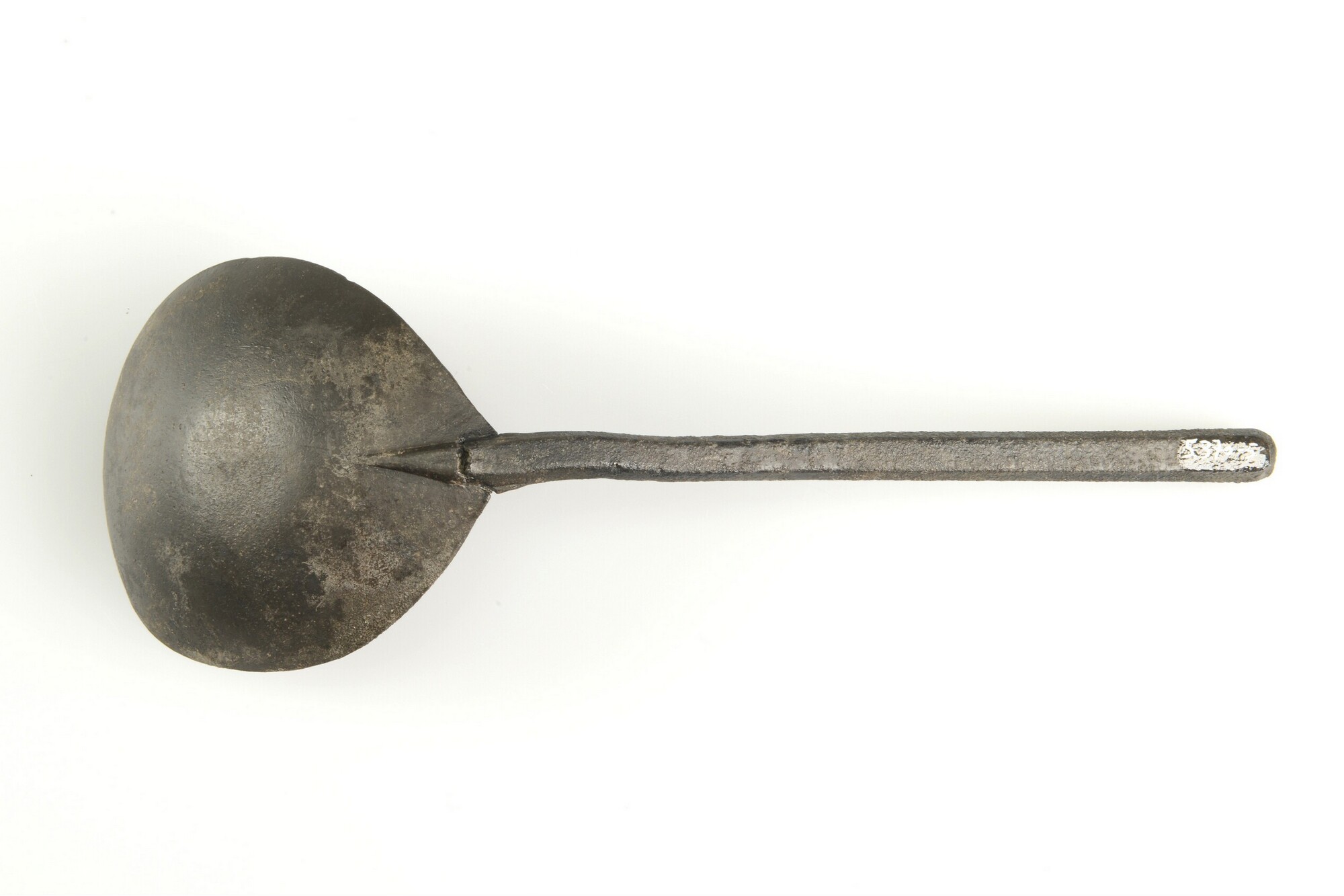 Lepel; sn-lep; ovale bak en zeskantige steel; merkteken in bak: gekroonde roos en initialen IA