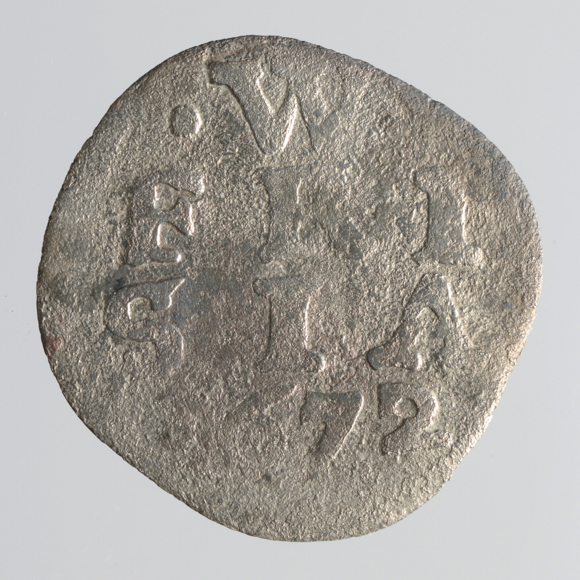 Dubbele stuiver; West Friesland provincie (1581-1795); vz.: in vier regels: punt W punt / FRI / • / SIA / 1672; kz.: naar links klimmende generaliteitsleeuw met 2 – S ter weerszijden; gewicht: 0.95 gram