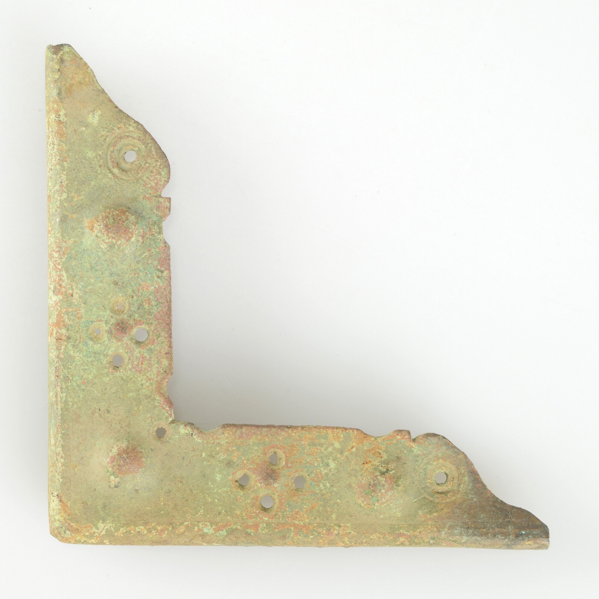Boekbeslag; hoeksluiting met punt-cirkel versiering en drie knoppen; afgeschuinde randen; L-vormig