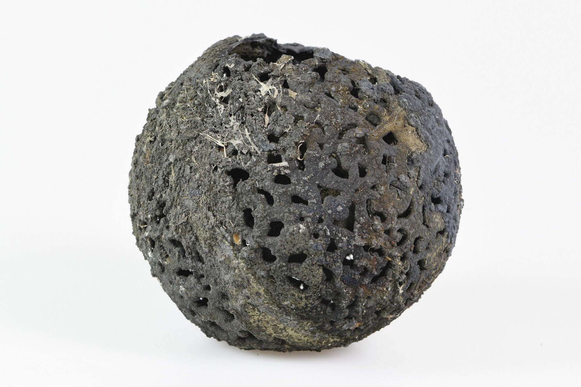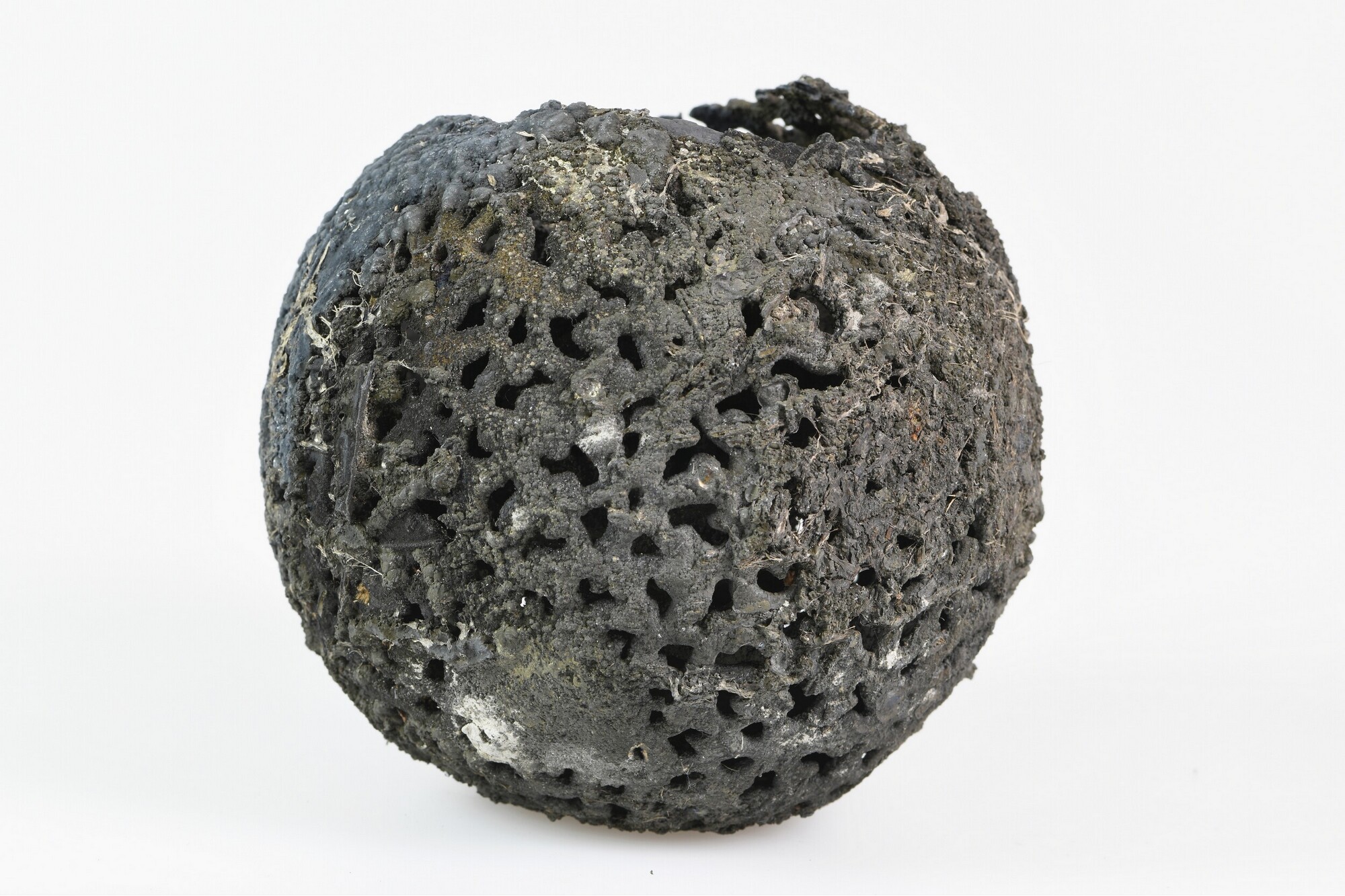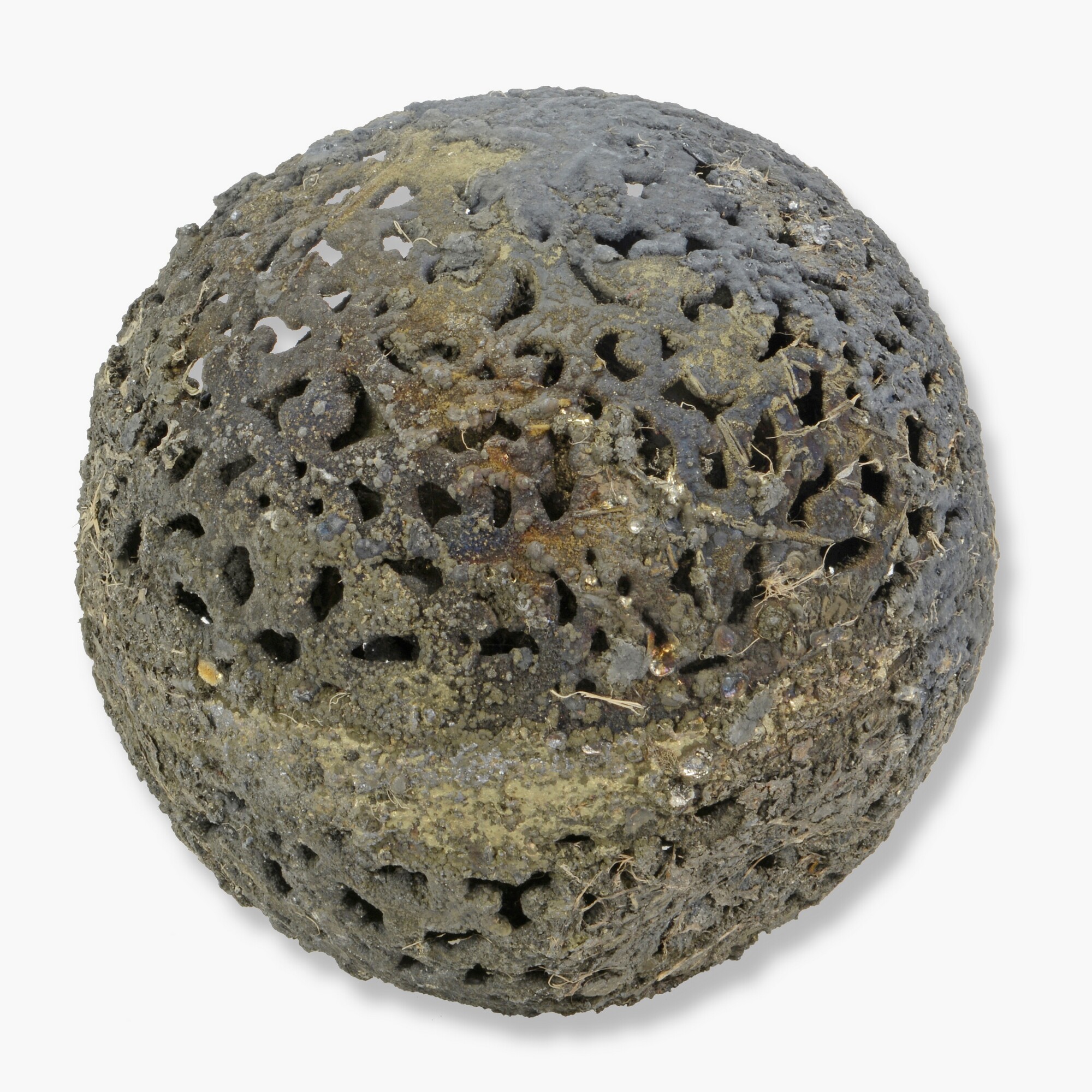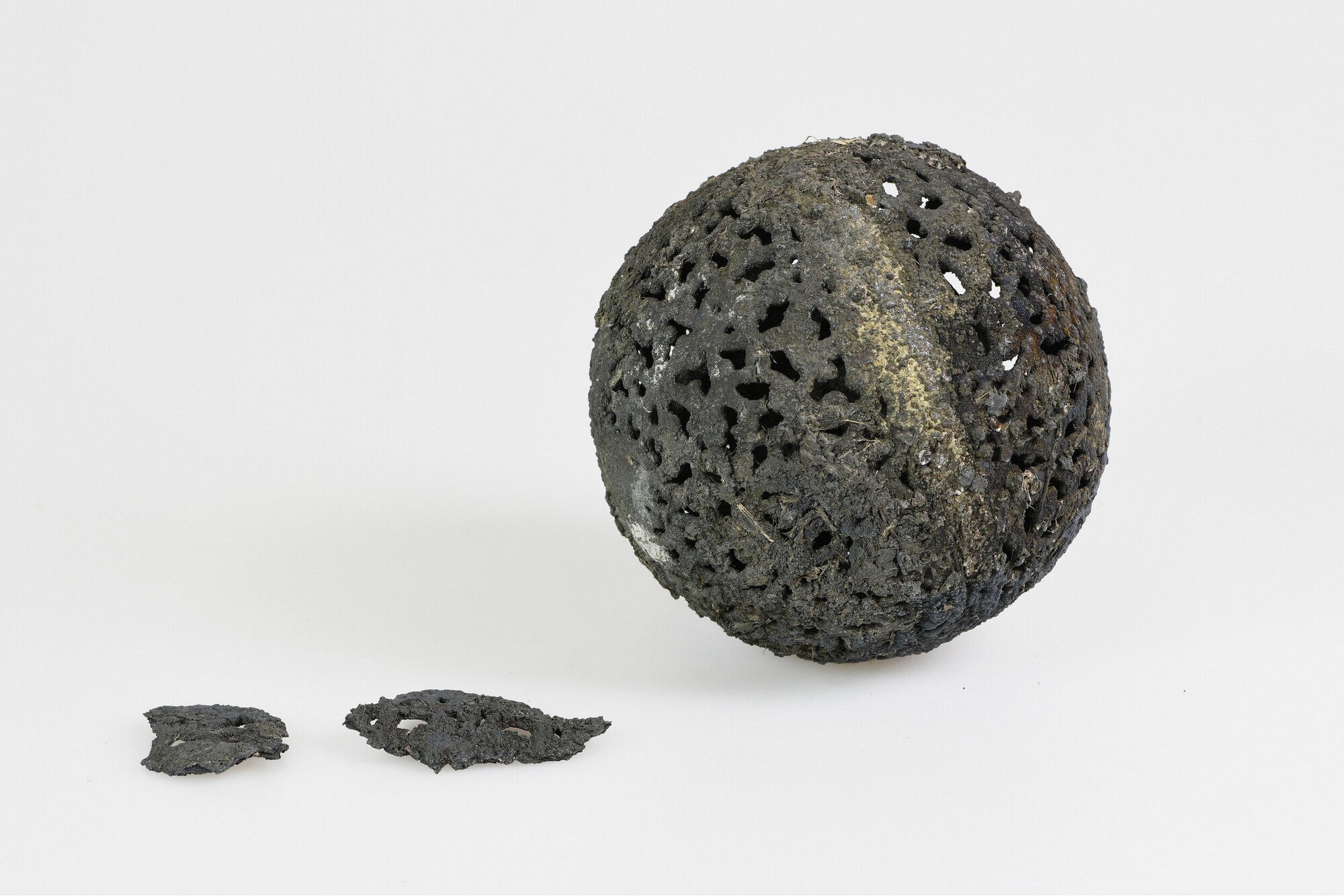 Geurbol of handwarmer; opengewerkte bol met florale decoraties; binnenwerk container in een cardanische ophanging; gecorrodeerd; gemineraliseerde vezels; gewicht: 823 gram; twee losse fragmenten zie 5373-057