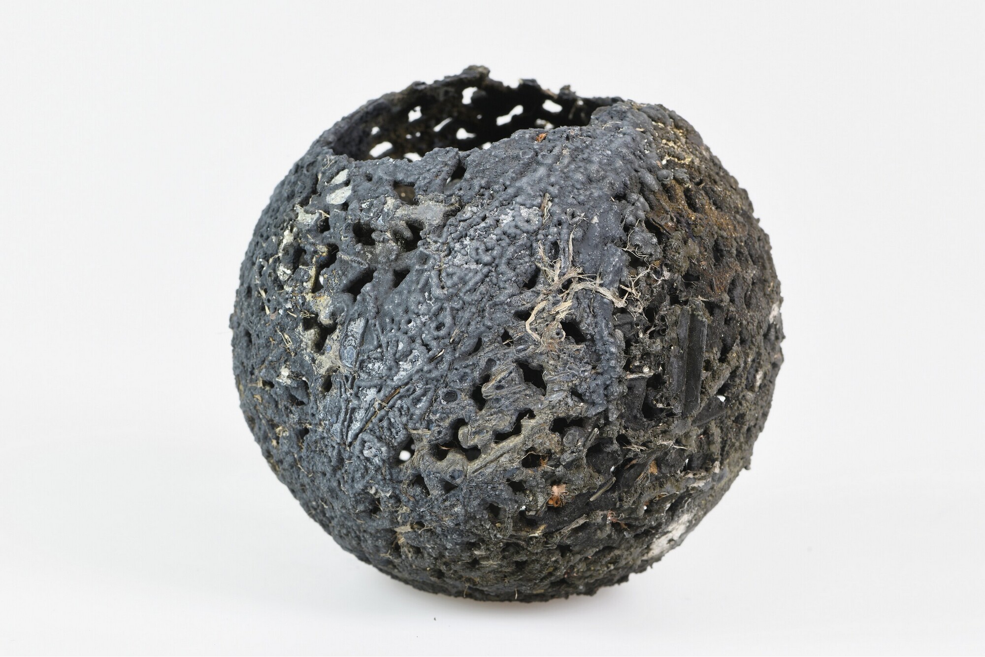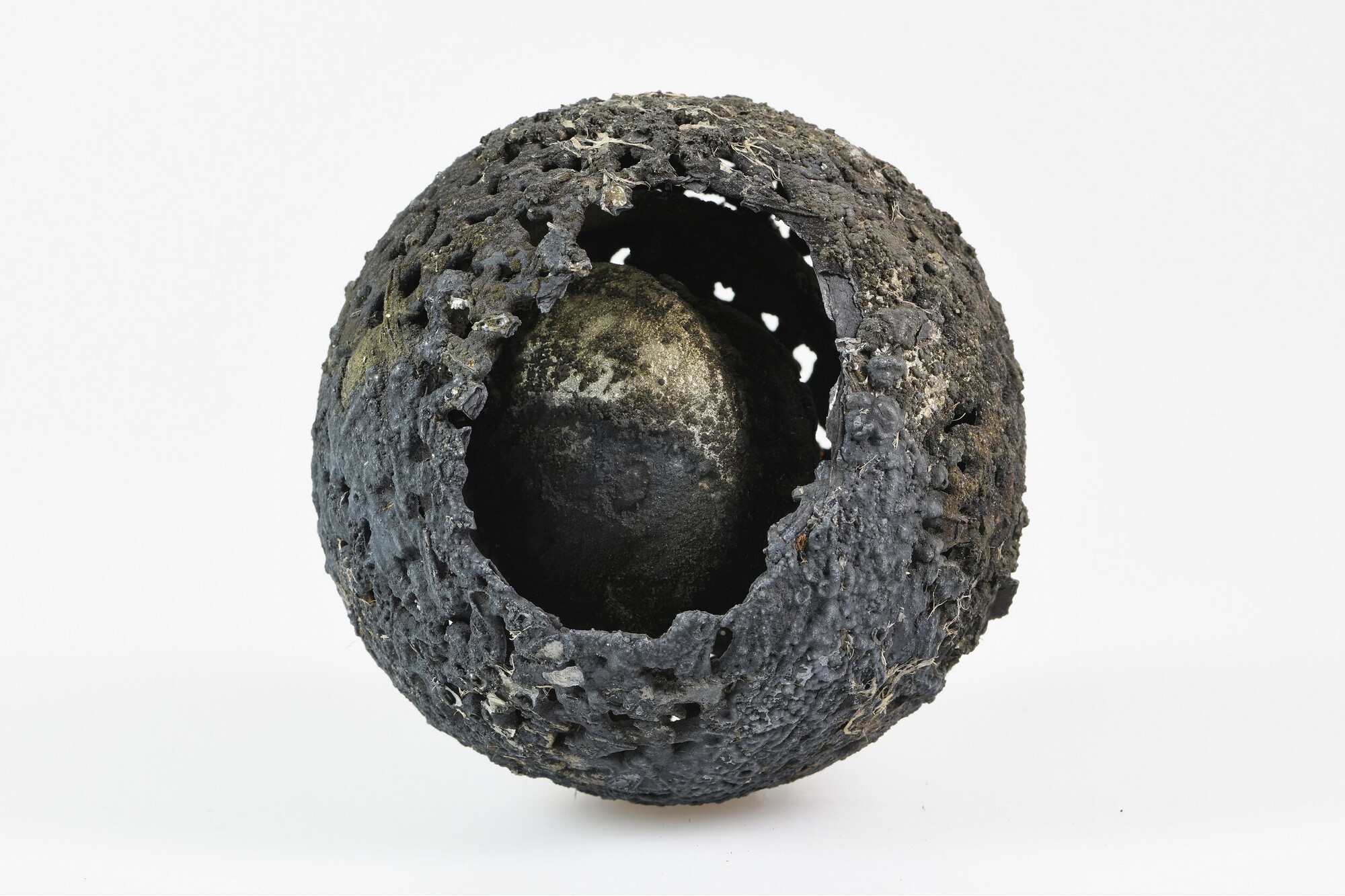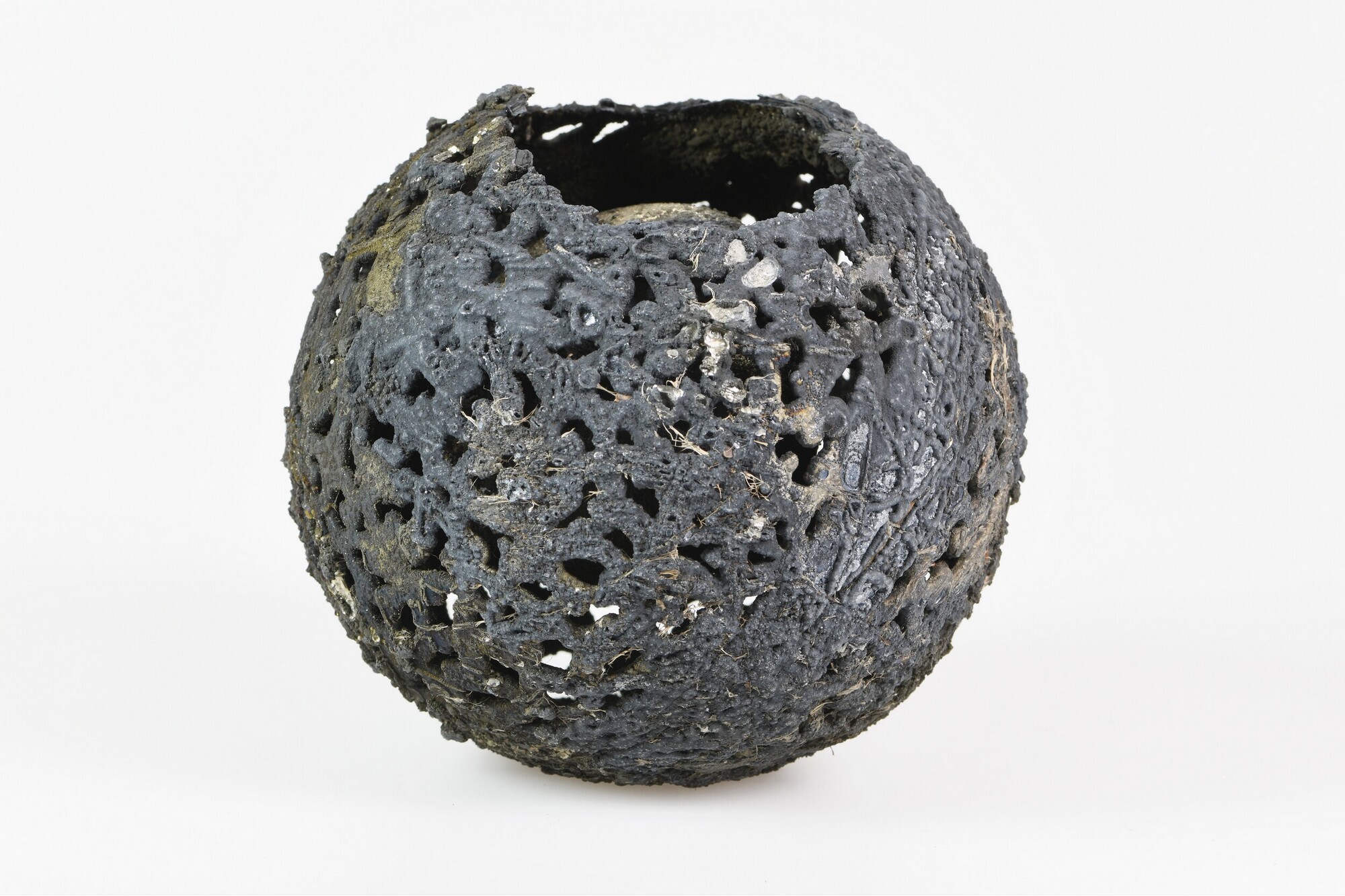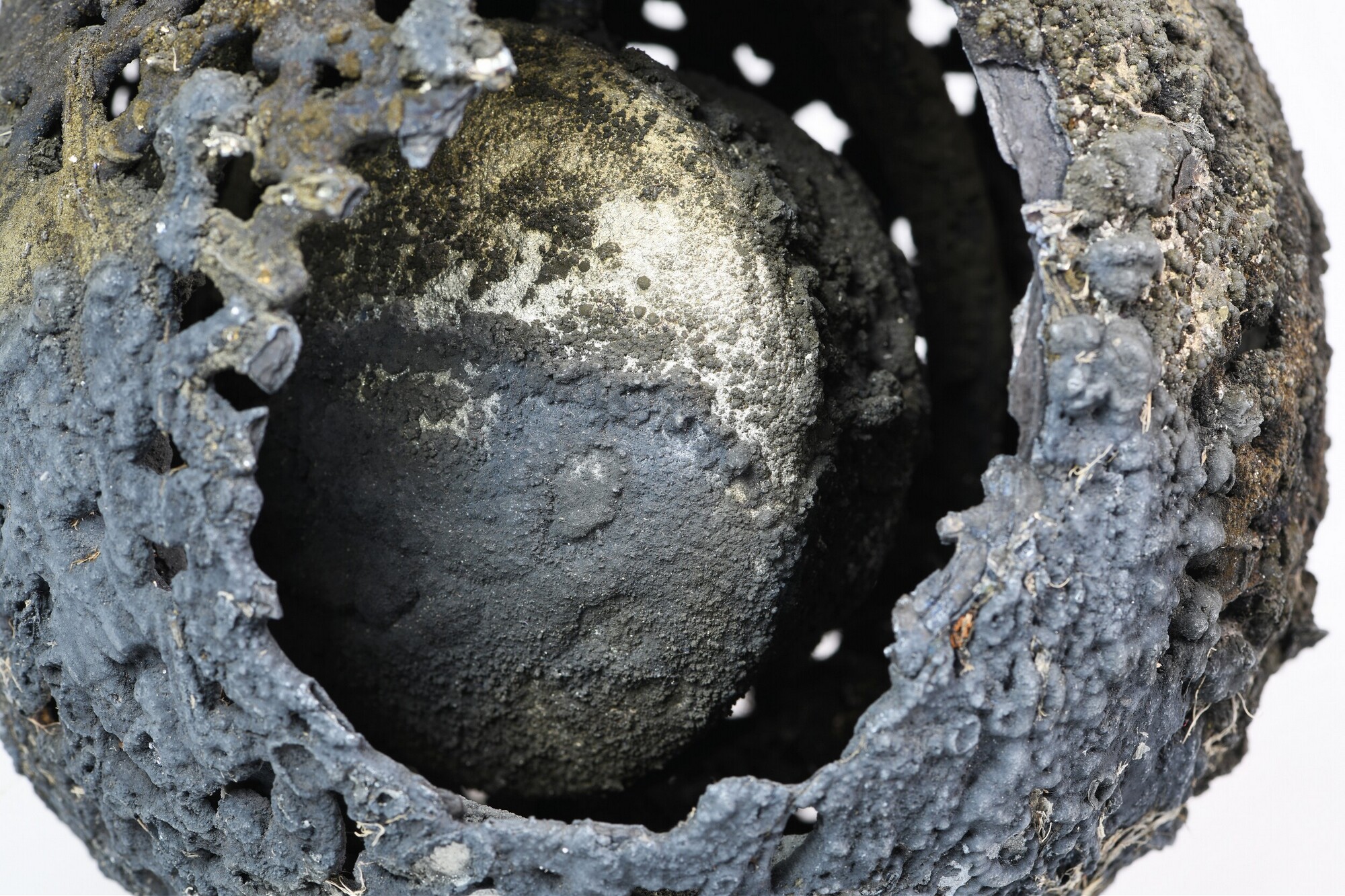 Geurbol of handwarmer; opengewerkte bol met florale decoraties; binnenwerk container in een cardanische ophanging; gecorrodeerd; gemineraliseerde vezels; gewicht: 823 gram; twee losse fragmenten zie 5373-057