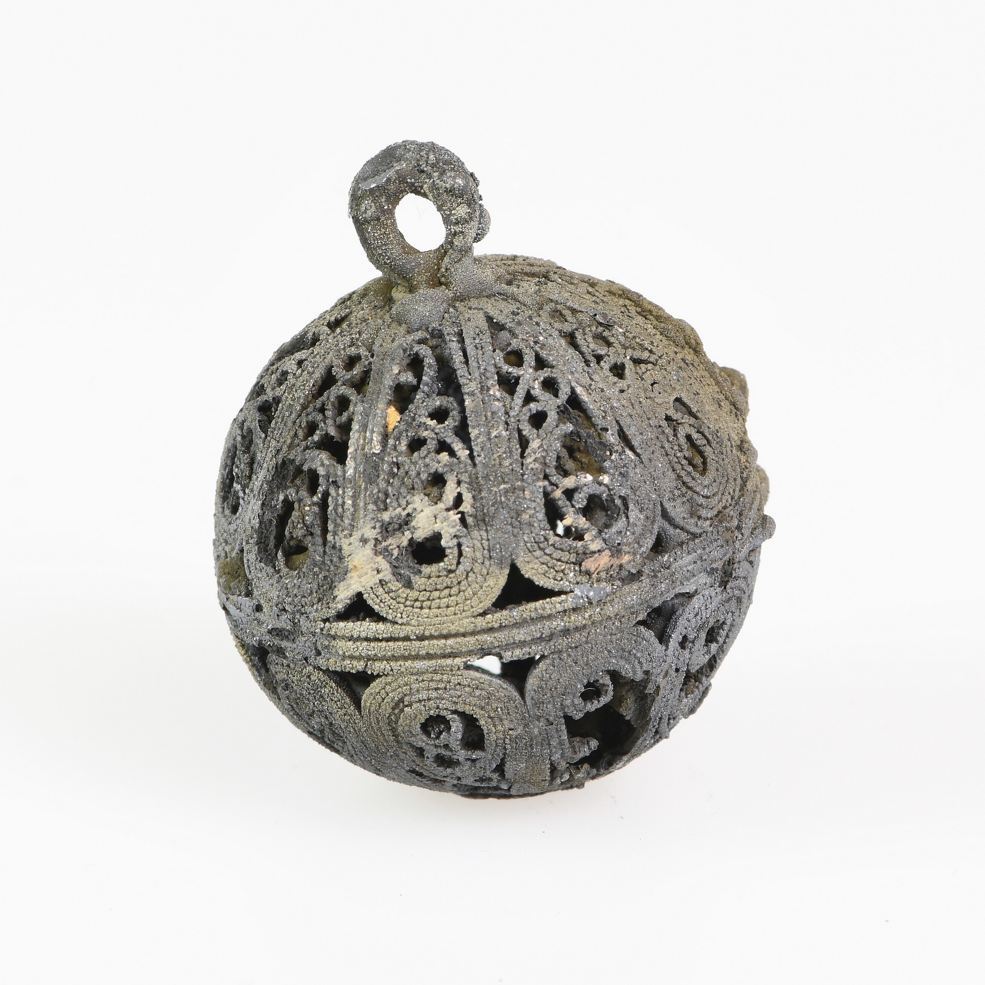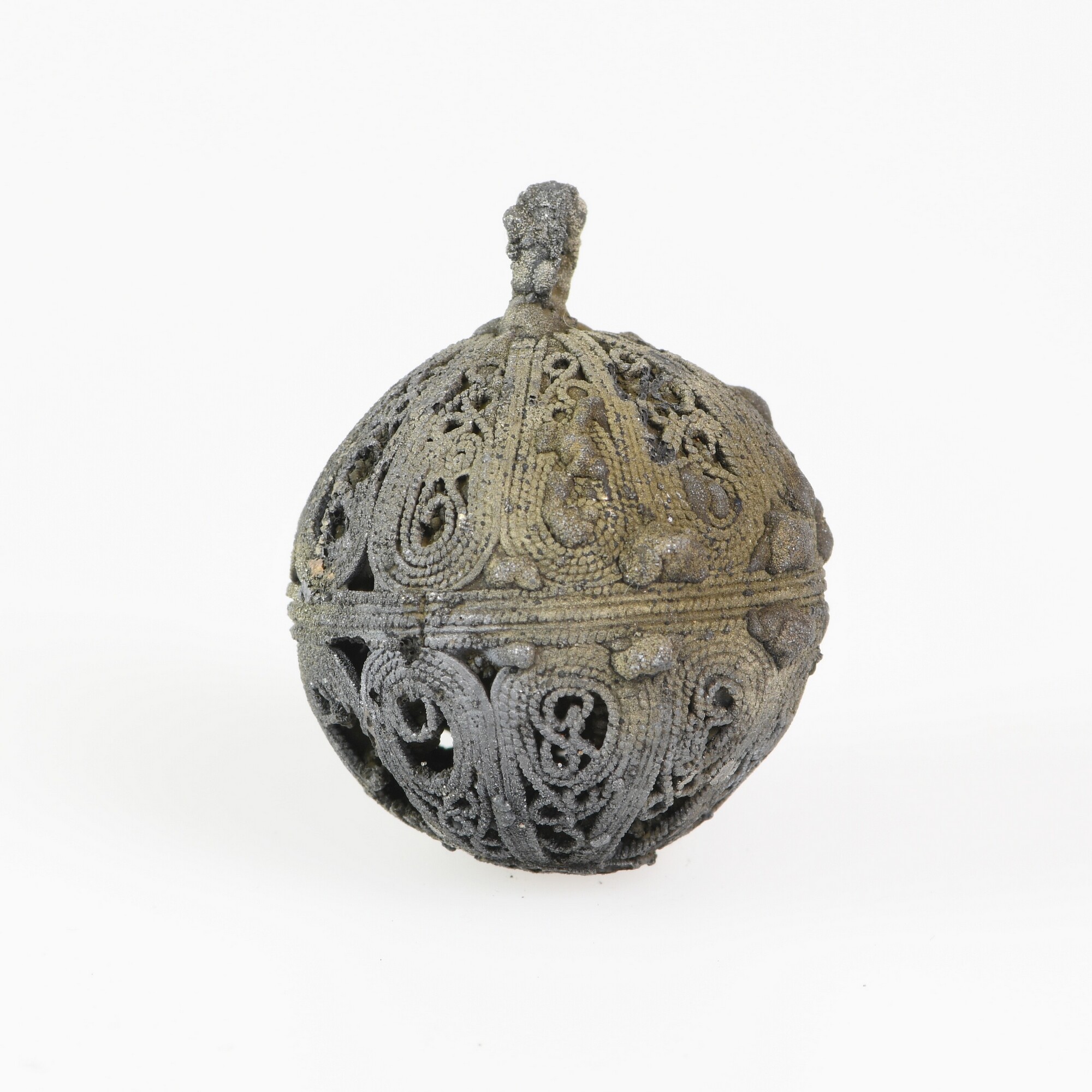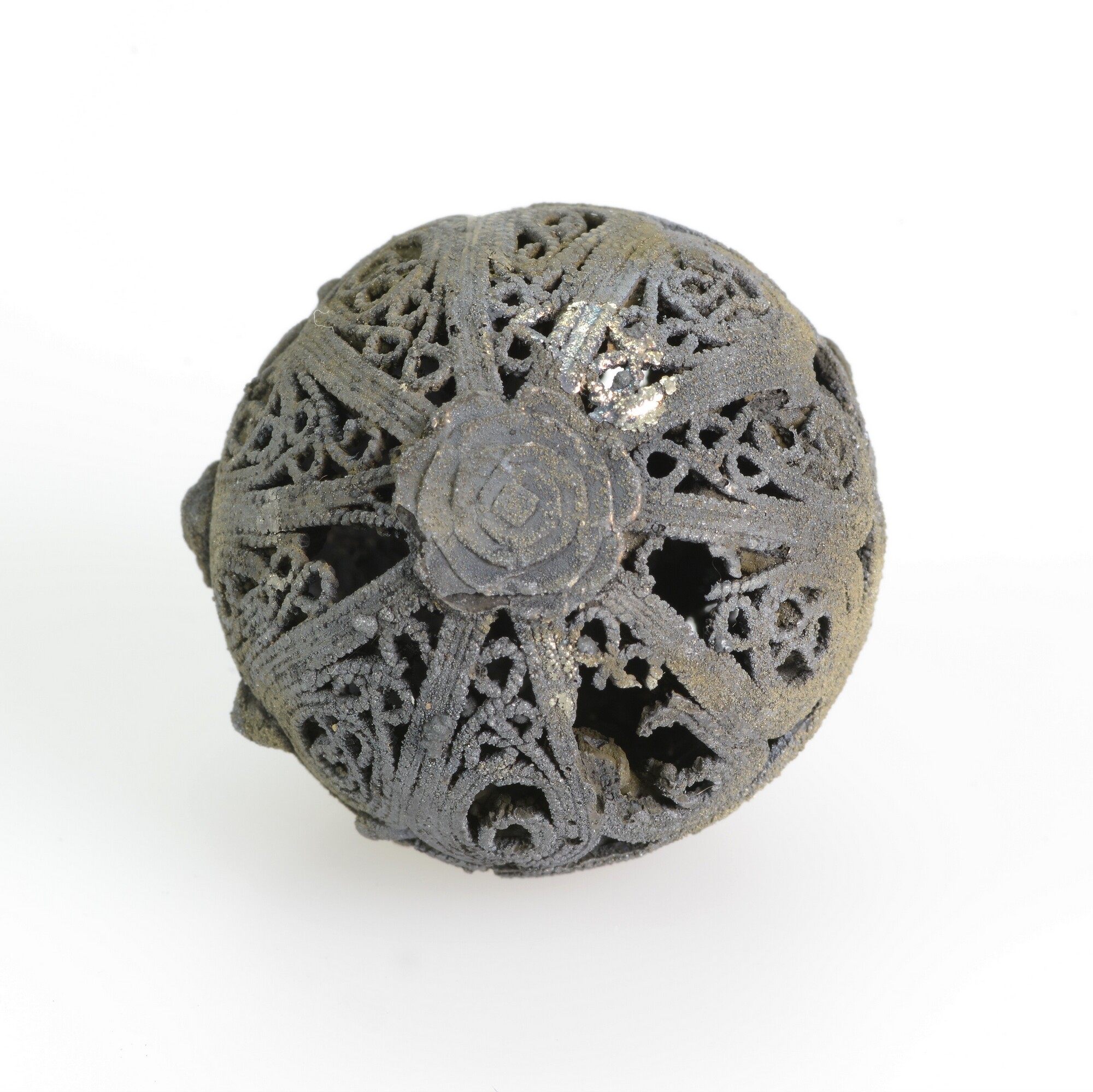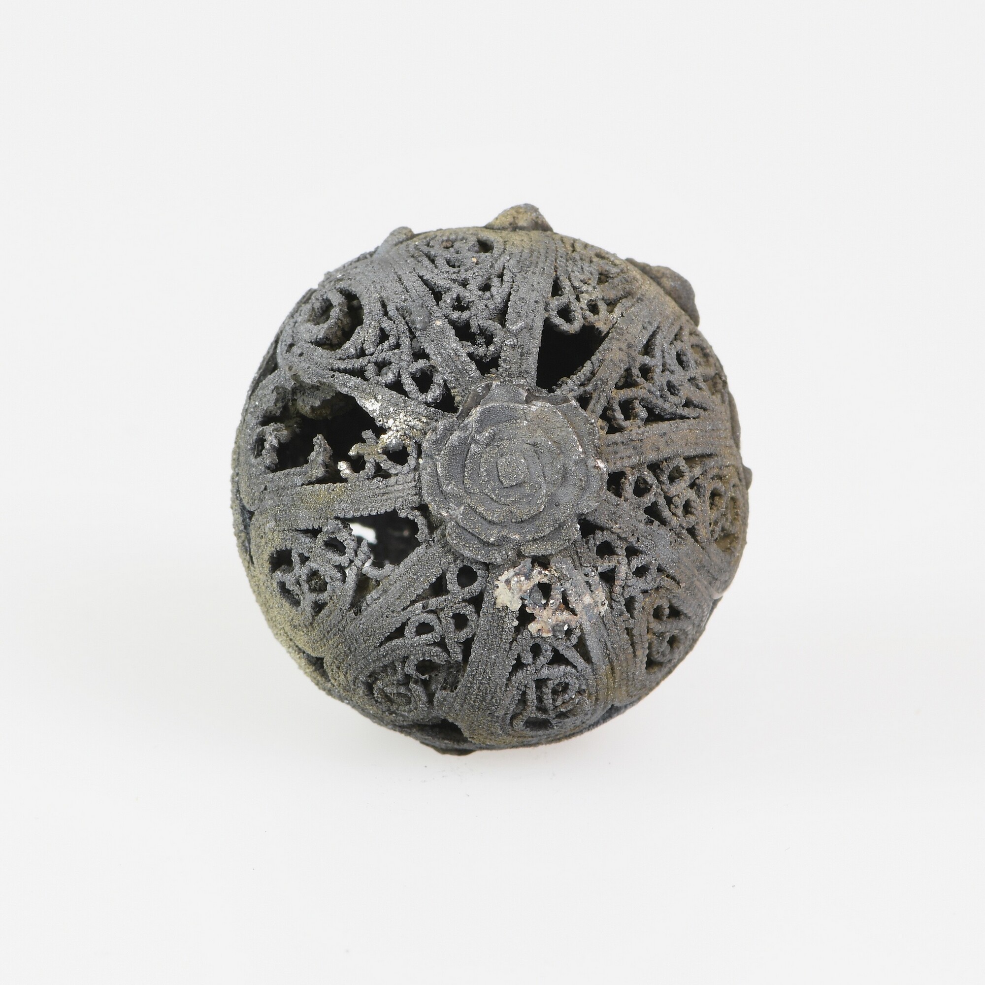 Knoop; filigraandraad; bloemachtige applique op de onderzijde; bevestigingslus; gewicht: 14 gram