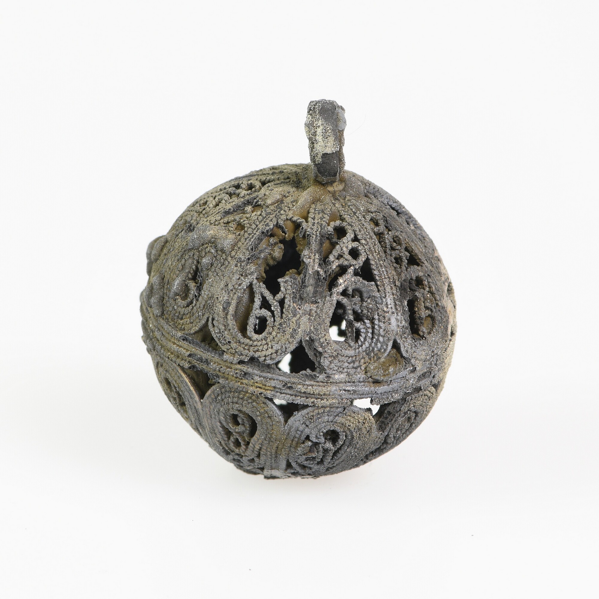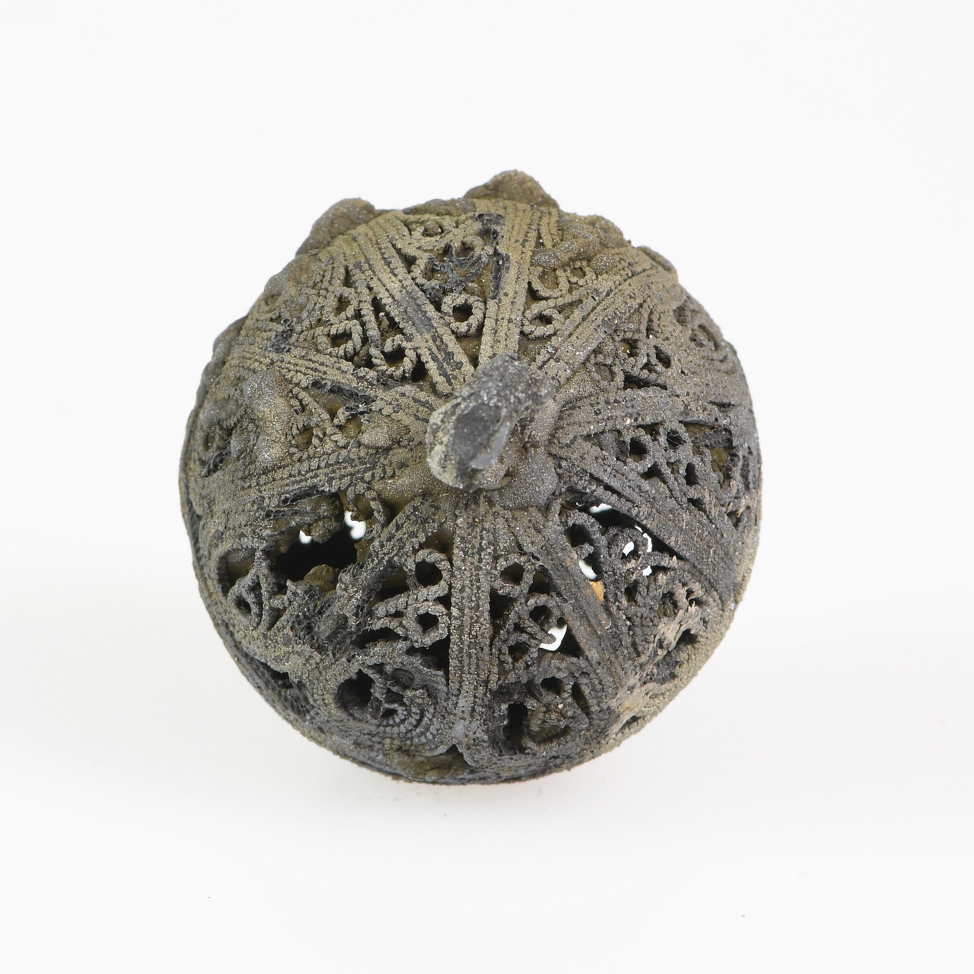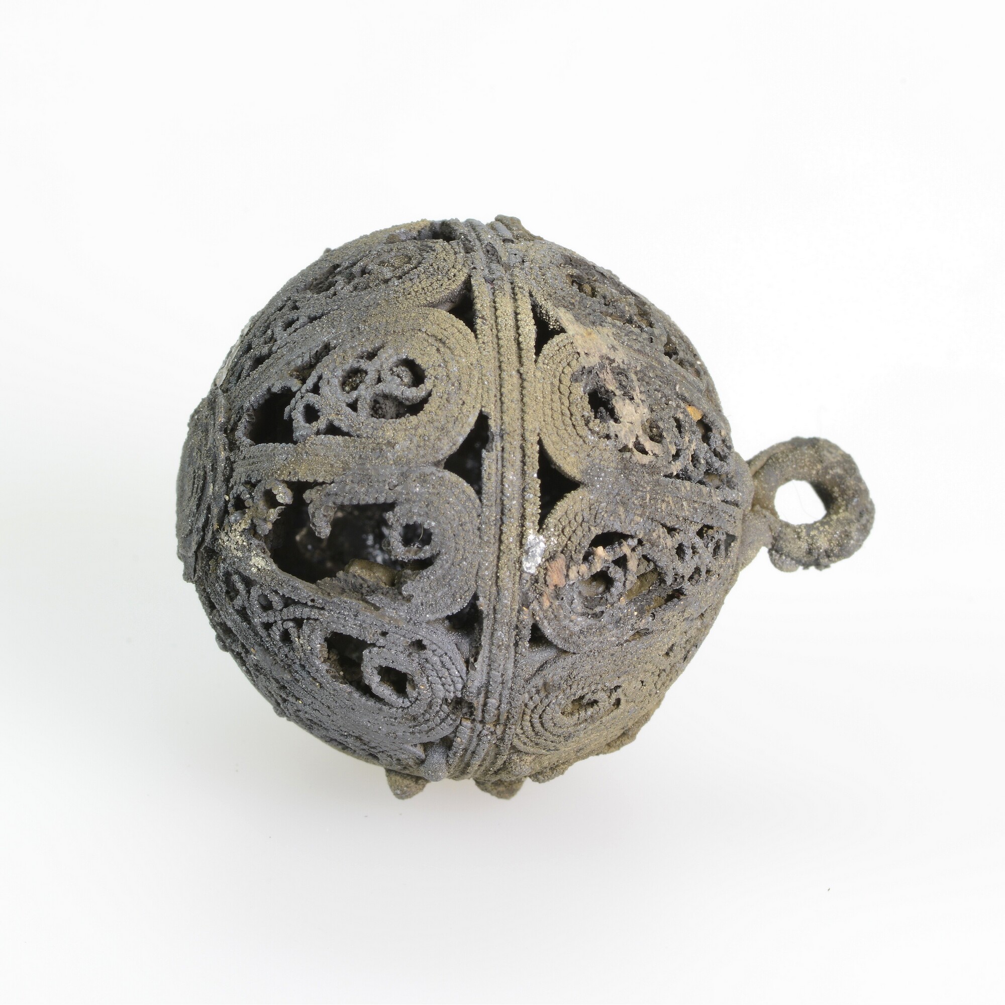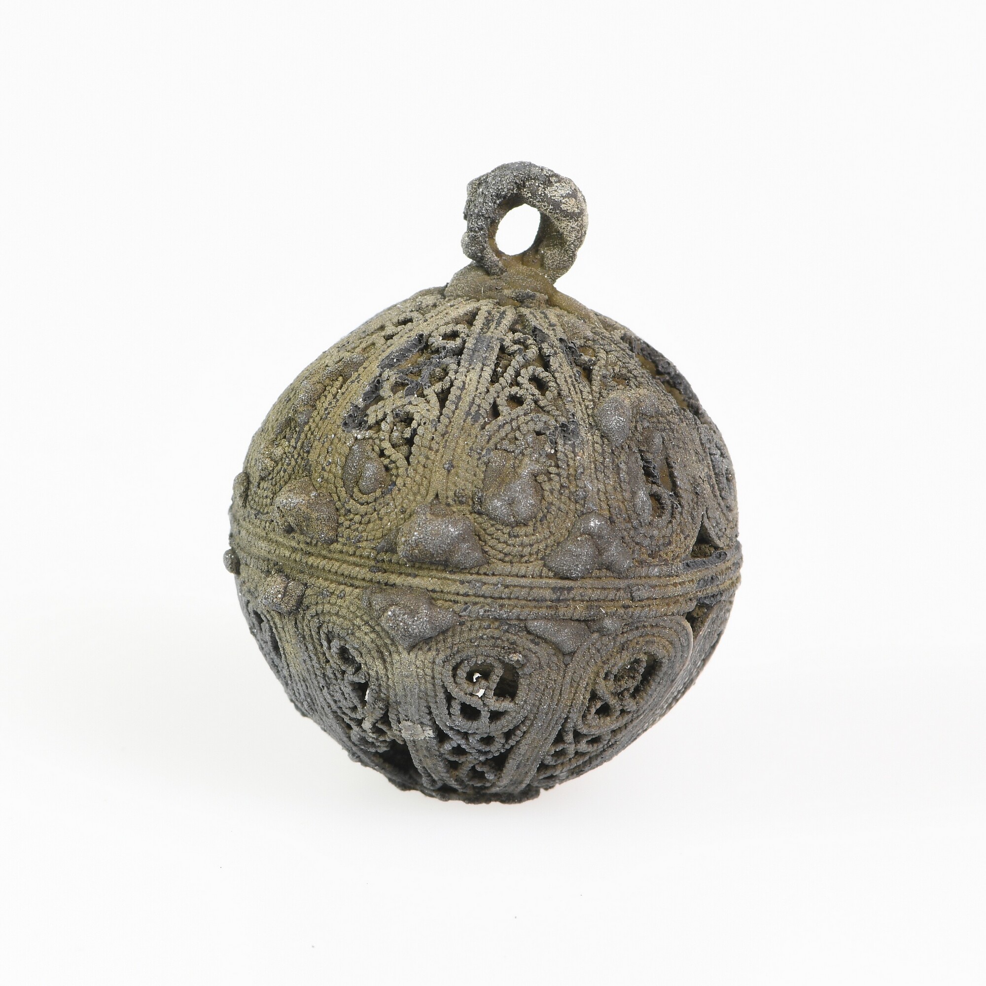 Knoop; filigraandraad; bloemachtige applique op de onderzijde; bevestigingslus; gewicht: 14 gram