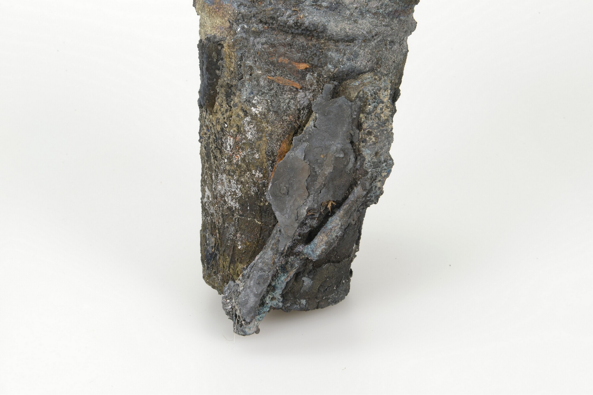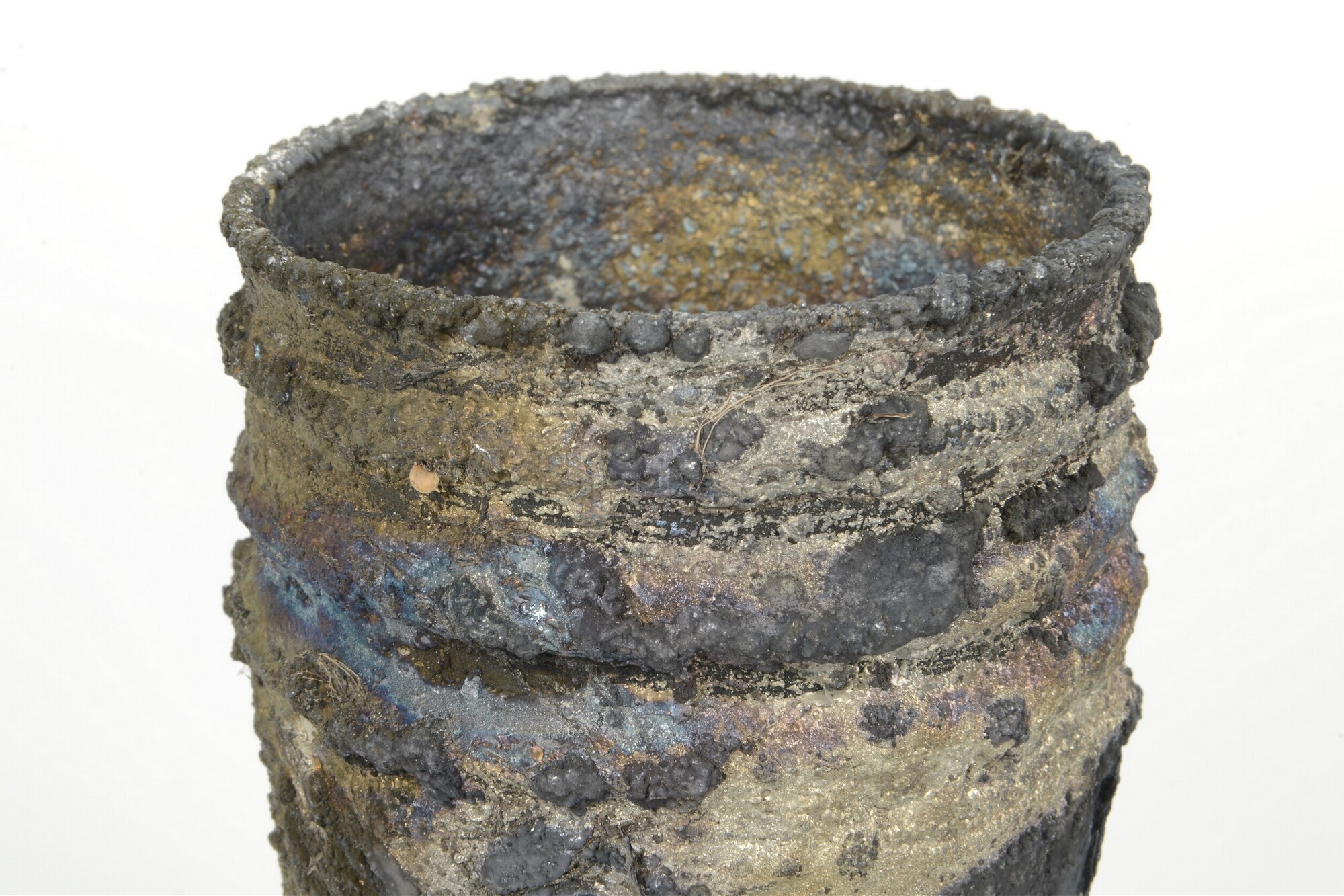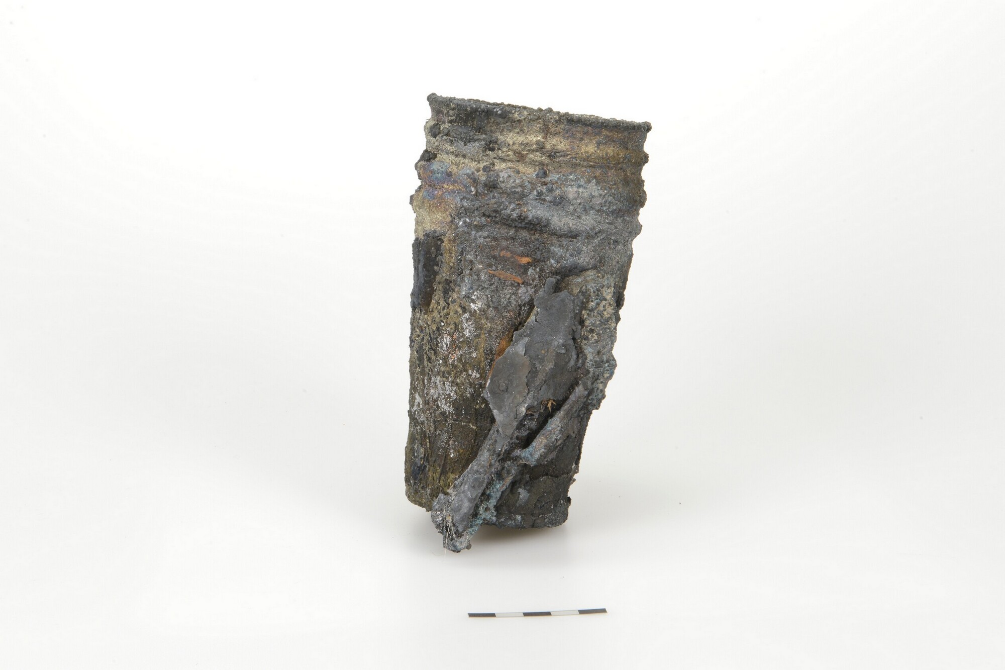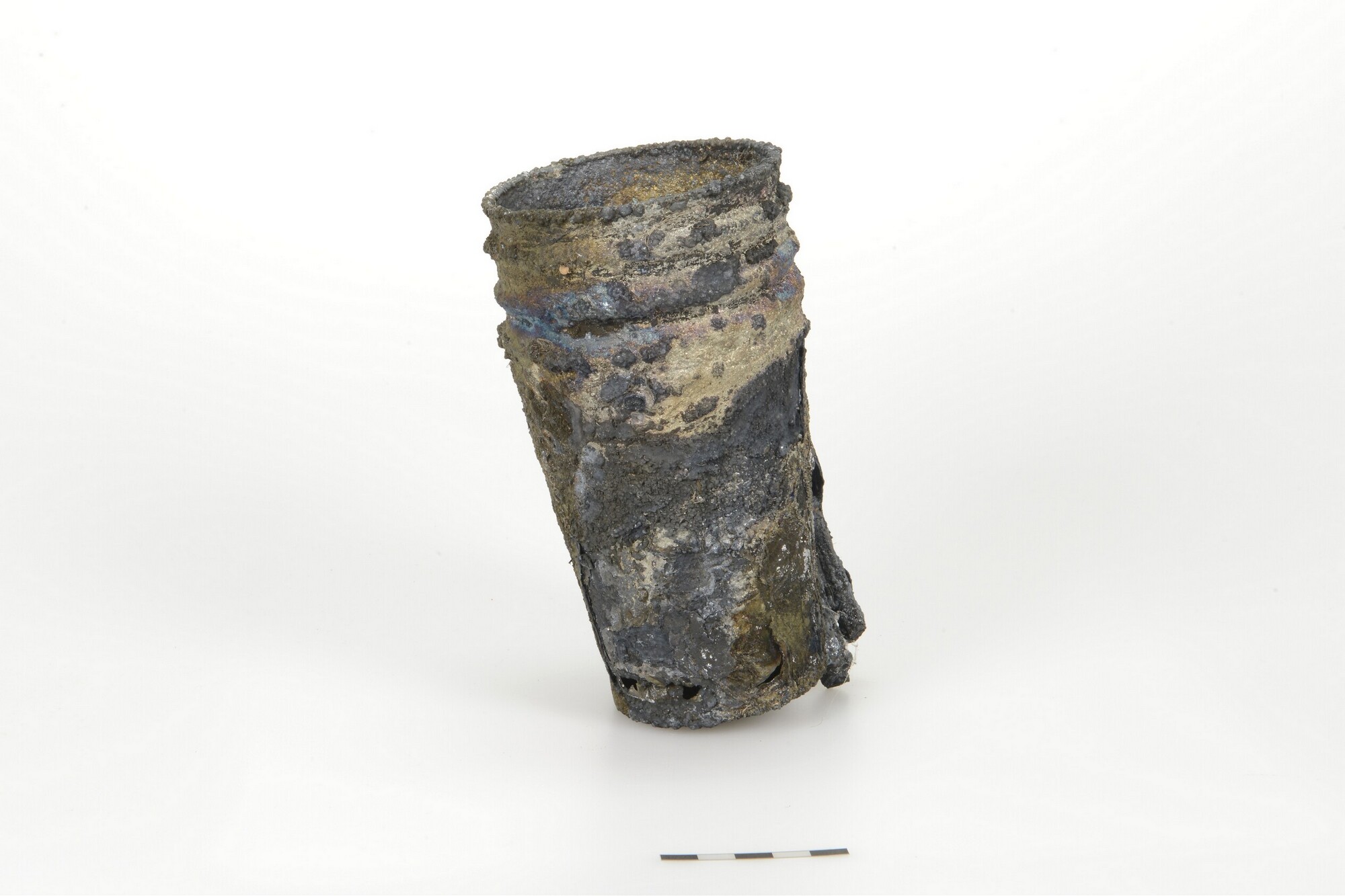 Bekers, stapel van vier gecorrodeerd met fragmenten bestek (vork + lepel + …), gedeelte wand buitenste beker ontbreekt; onderdeel van 5372-148
