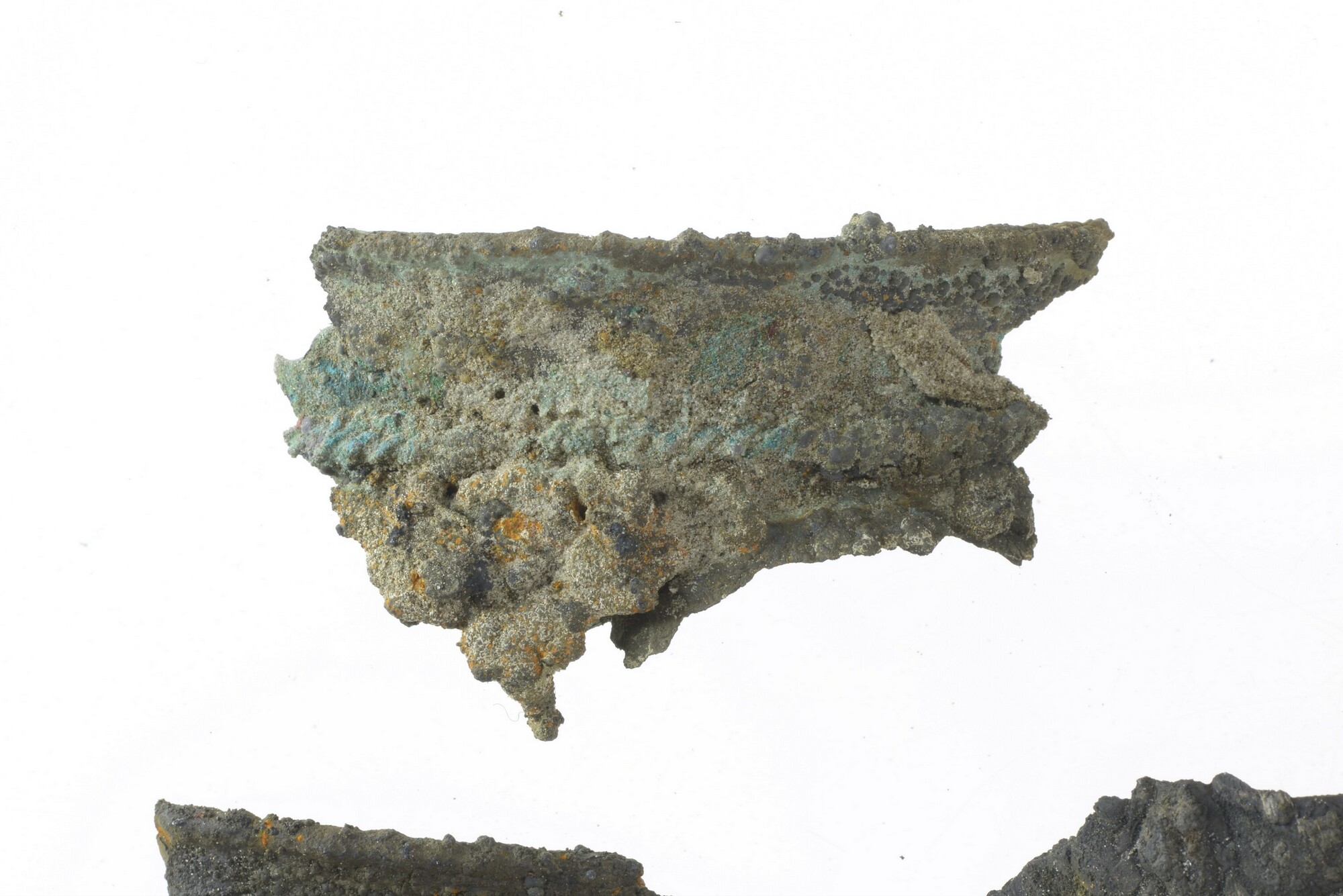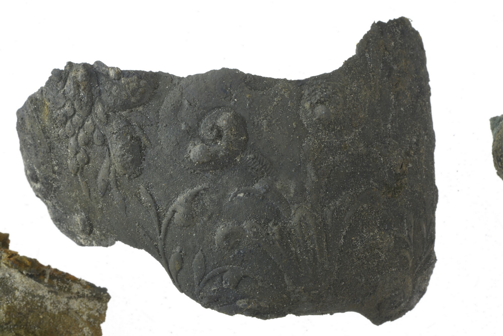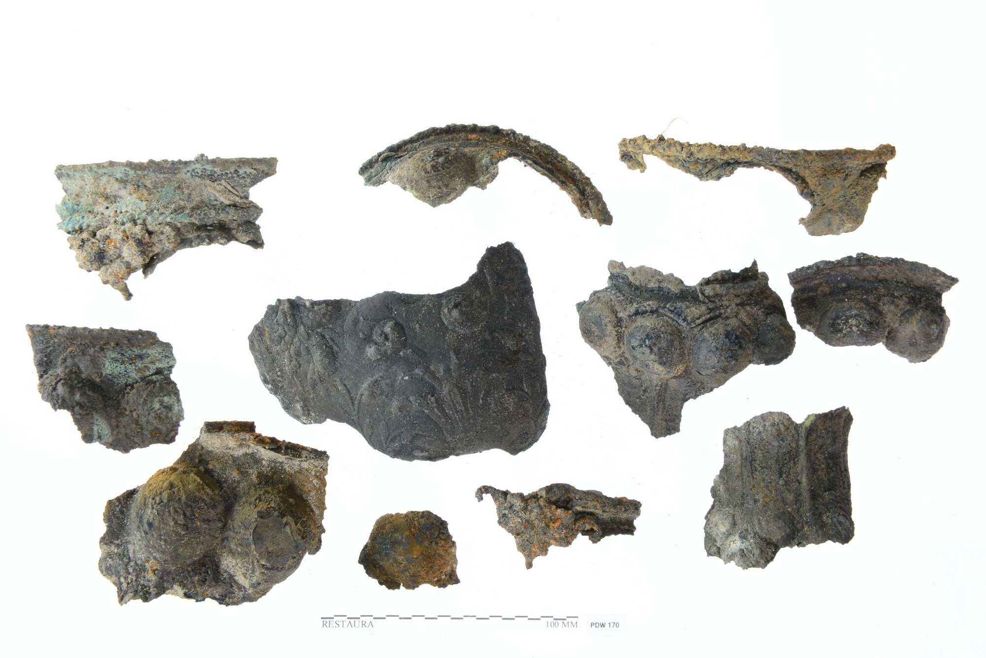 Akeleibeker; pronkbeker, 11 fragmenten: kan, fragment wand, reliëf met bloemmotief, verguld (onderdeel van 5372-150); fragment pronkbekers acht maal, grote noppen (onderdeel van 5372-179, 5372-180, 5372-181, 5372-183); fragment ornamenten twee maal (onderdeel van 5372-185)