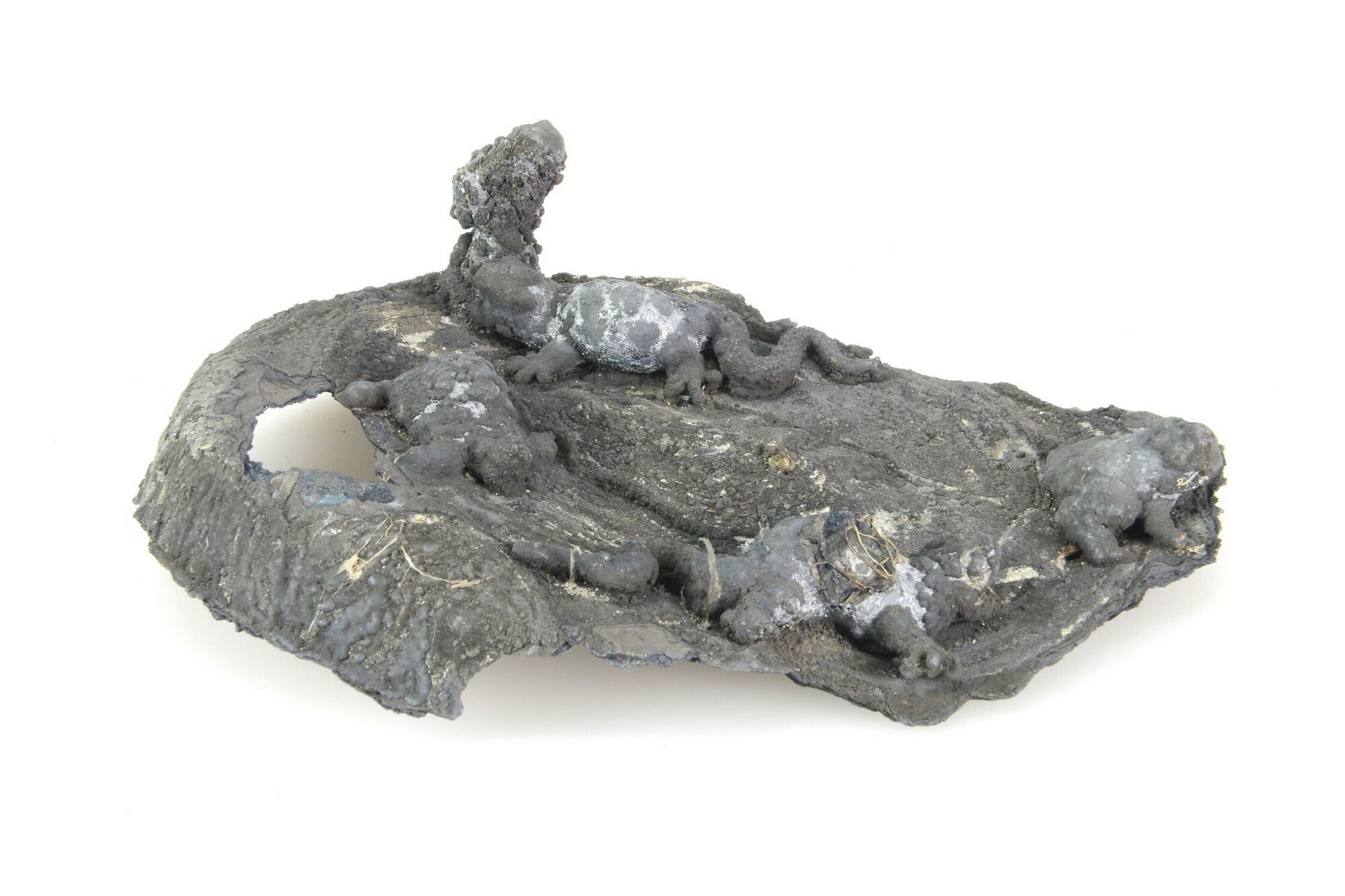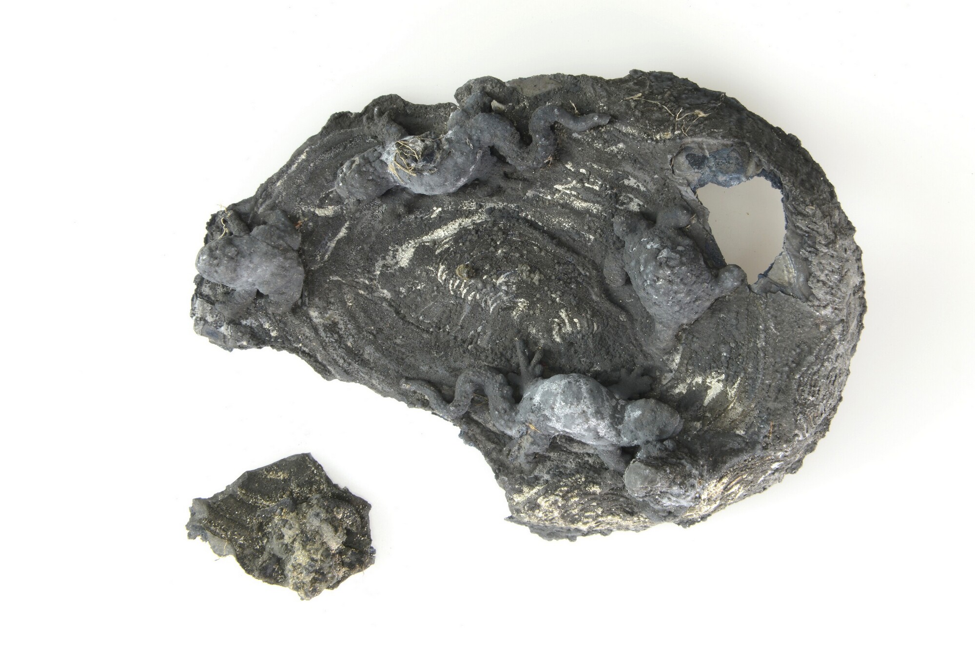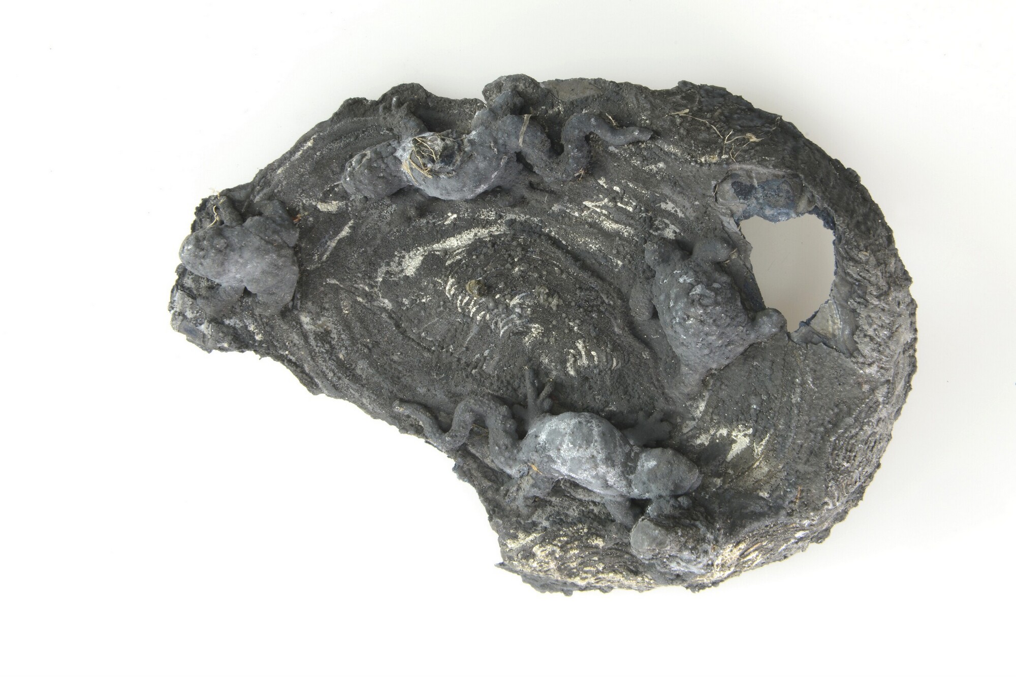 Pronkbeker; fragment; ovaal voetstuk, met gemonteerde kikkers, hagedissen en schildpad, gebroken, diverse delen ontbreken