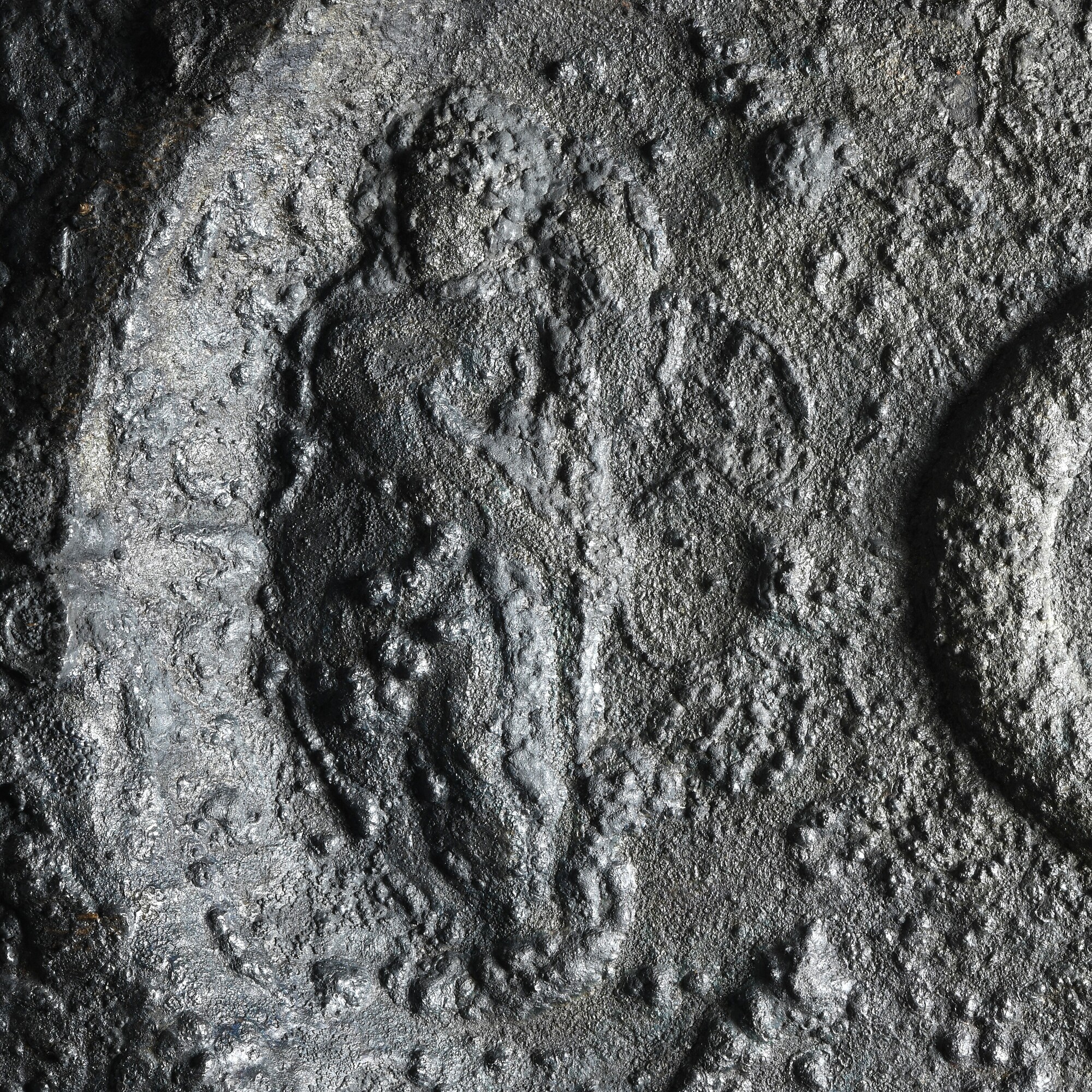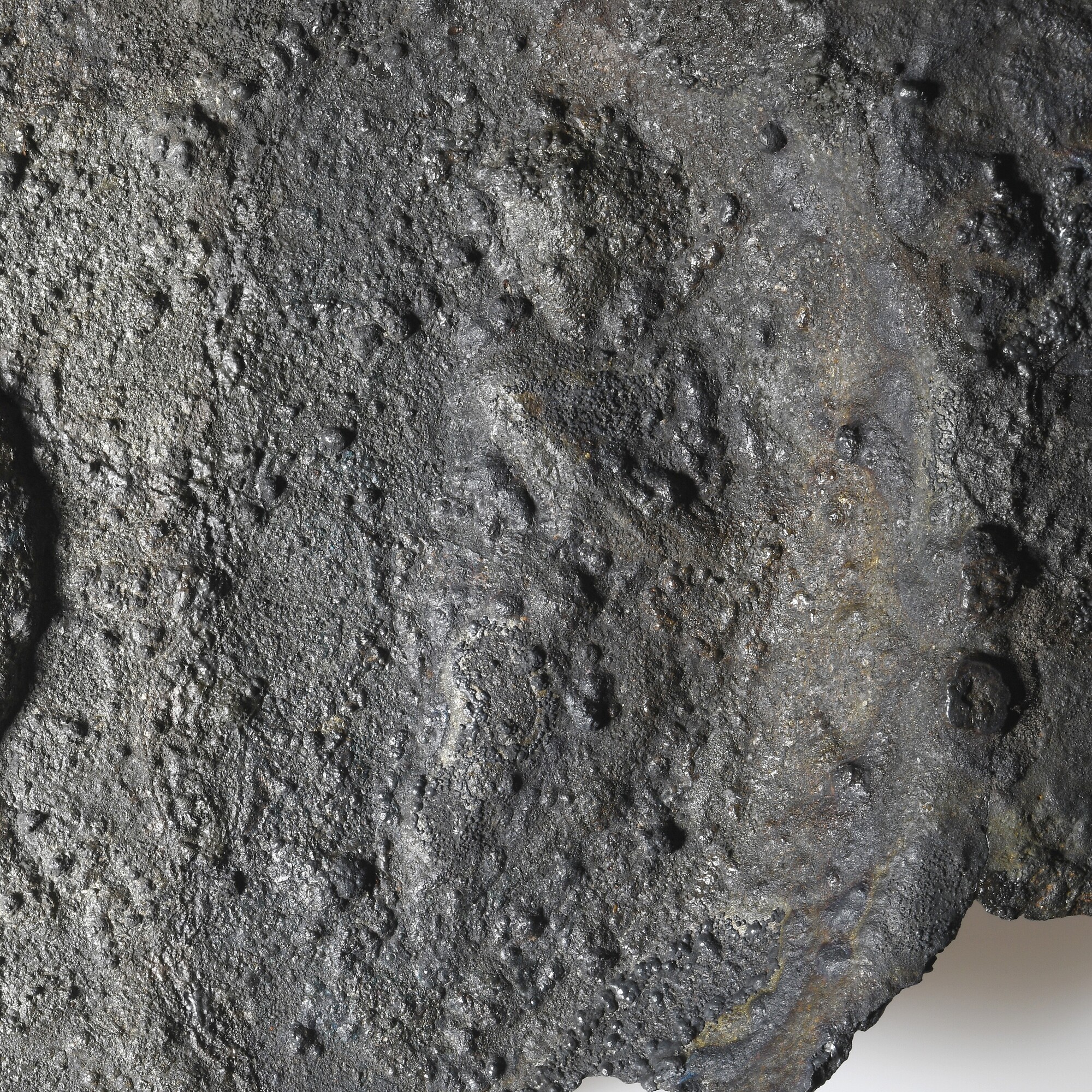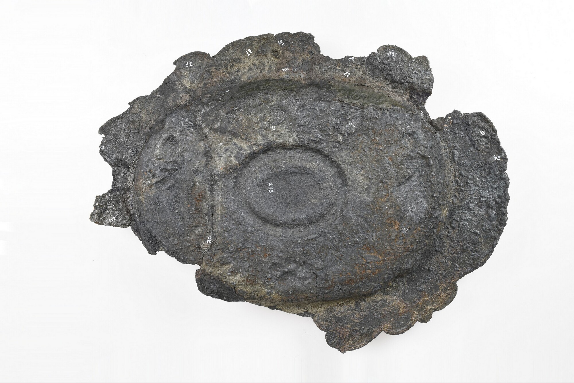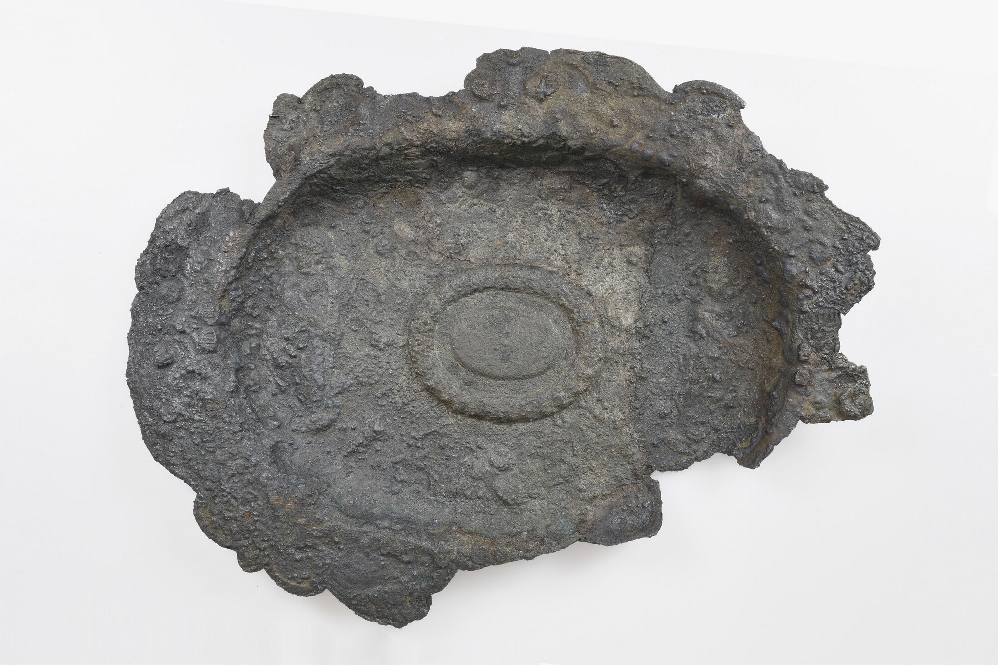 Schaal / lampetschaal; ovaal; reliëfversiering, in het midden een ovale umbo met aan weerszijde een menselijk figuur; geschulpte rand; resten van hout/verpakkingsmateriaal op het oppervlak; is hoogstwaarschijnlijk een set geweest met kan 5372-150