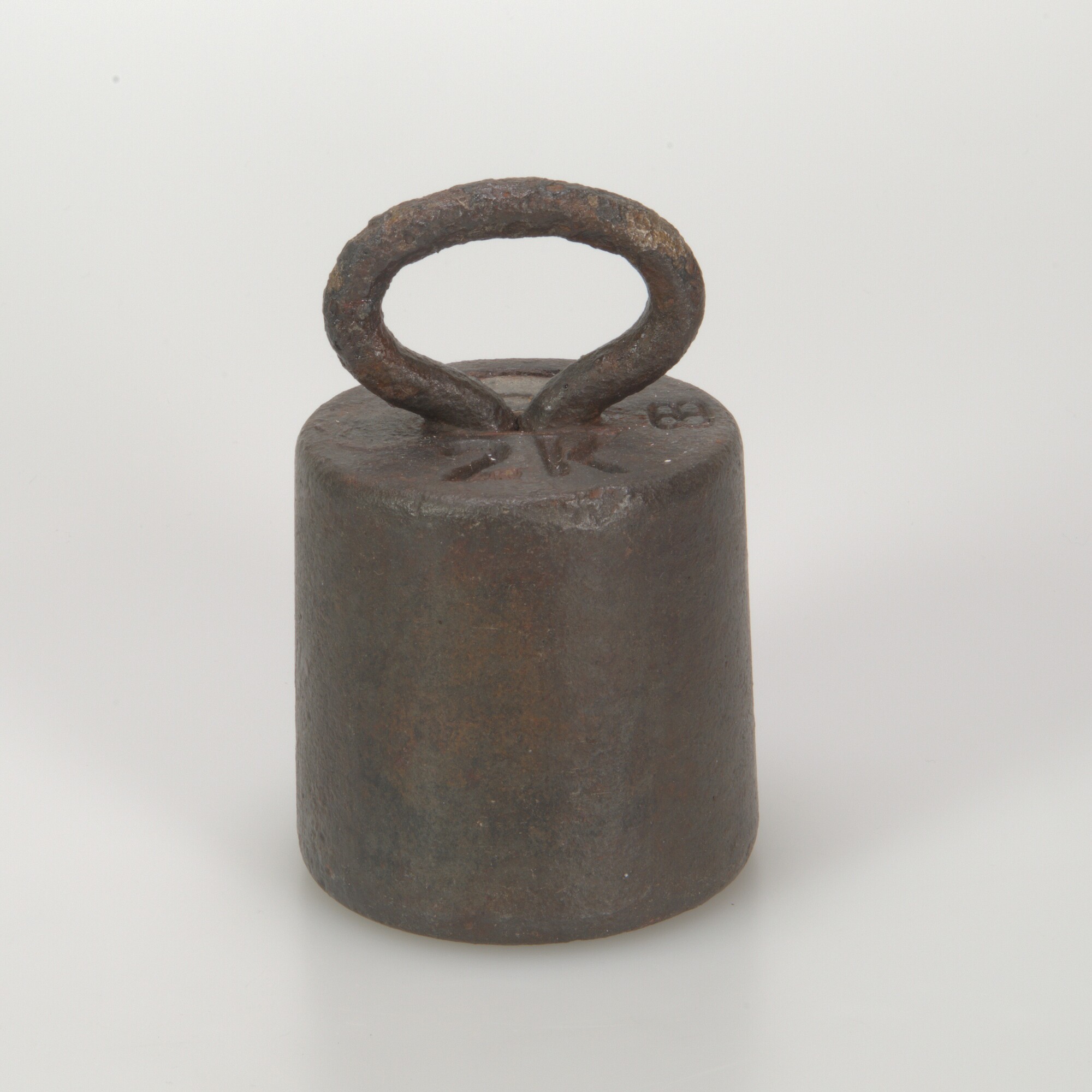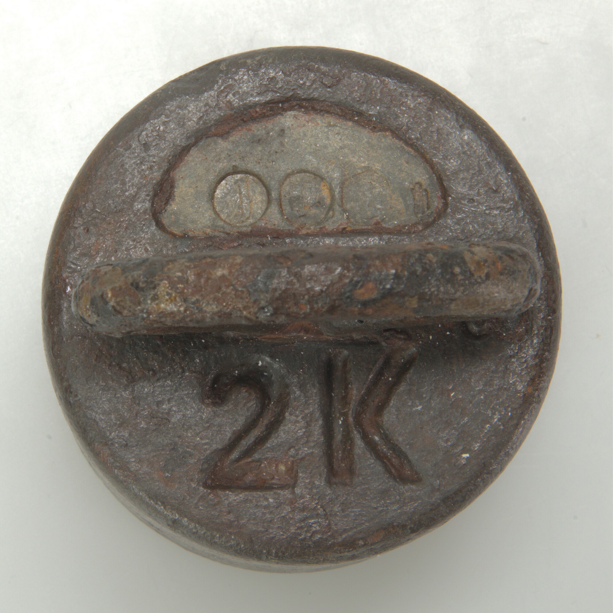 Krukgewicht; kegelvormig met loden vulling; opschrift: 2 K; drie ijkmerken: D (1967-1968) en twee onleesbaar; gewicht: 1972 gram