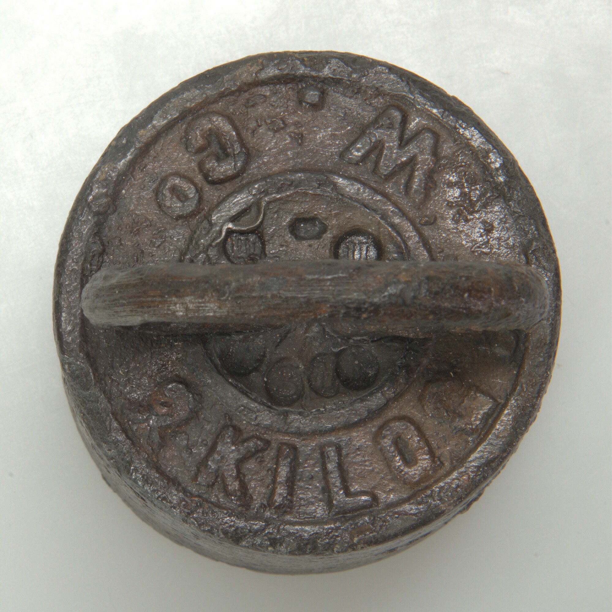 Krukgewicht; kegelvormig met loden vulling; opschrift: 2 kilog. W. co; twee ijkmerken: m (1938-1939), n (1940-1941) en vier onleesbare ijkmerken; gewicht: 1925 gram