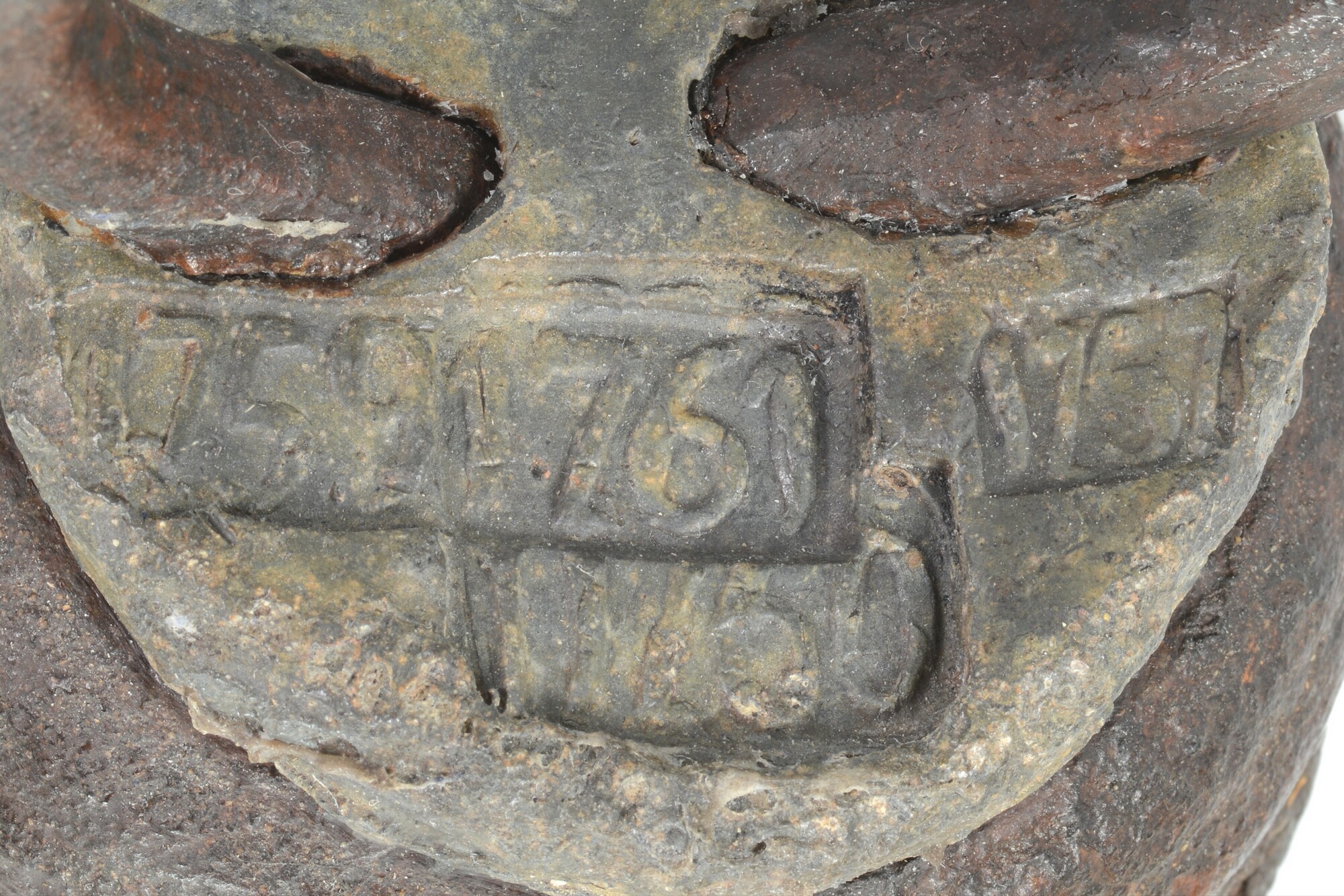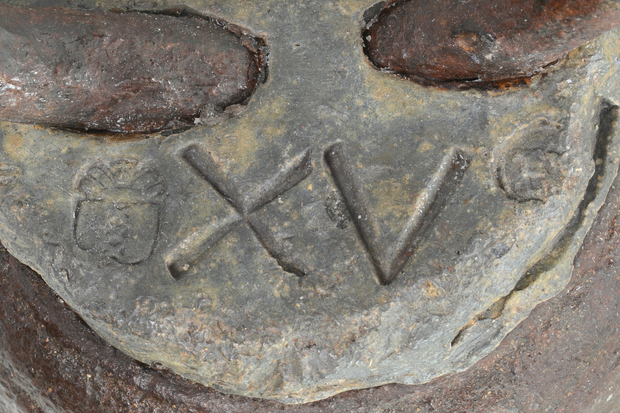 Loodkopgewicht; kegelvormig met loden vulling; op de bovenzijde is het stadswapen van Amsterdam ingeslagen, het romeinse cijfer XV en de ijkjaren: 1757-1759-1760-1761; gewicht: 7,3 kg