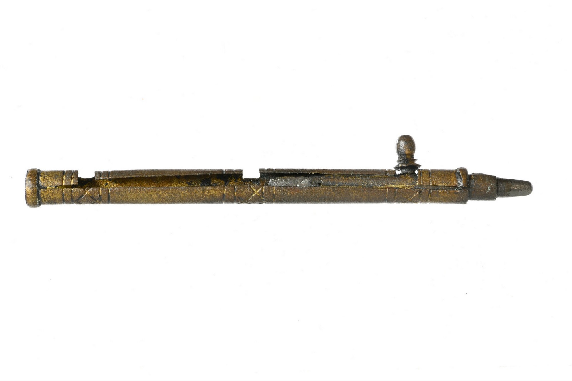 Grafiethouder; houder met een grafietstaafje. Drie met kruisjes gemarkeerde uitsparingen voor het vergrendelen van de stelknop