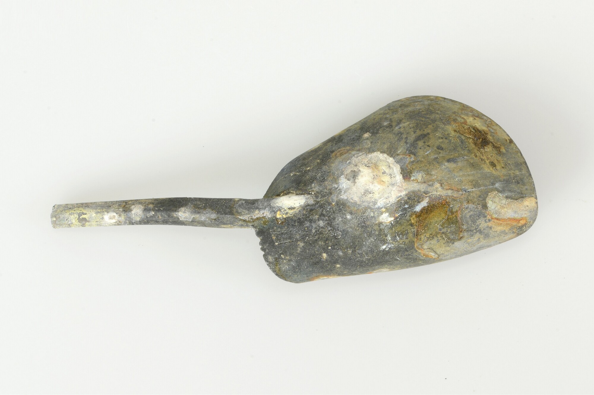 Lepel; ronde bak; platte zeskantige steel; merkteken in de bak: gekroonde Tudorroos