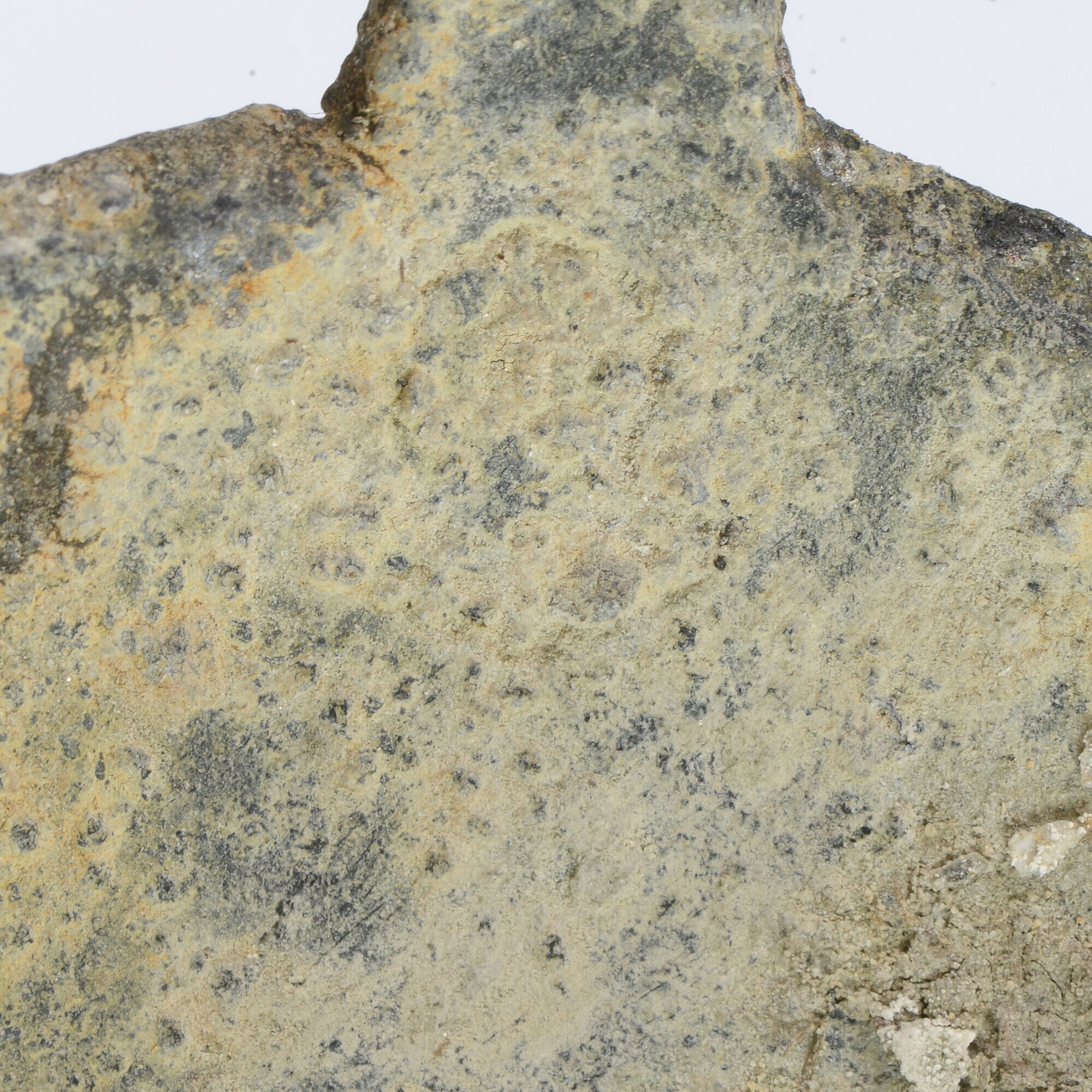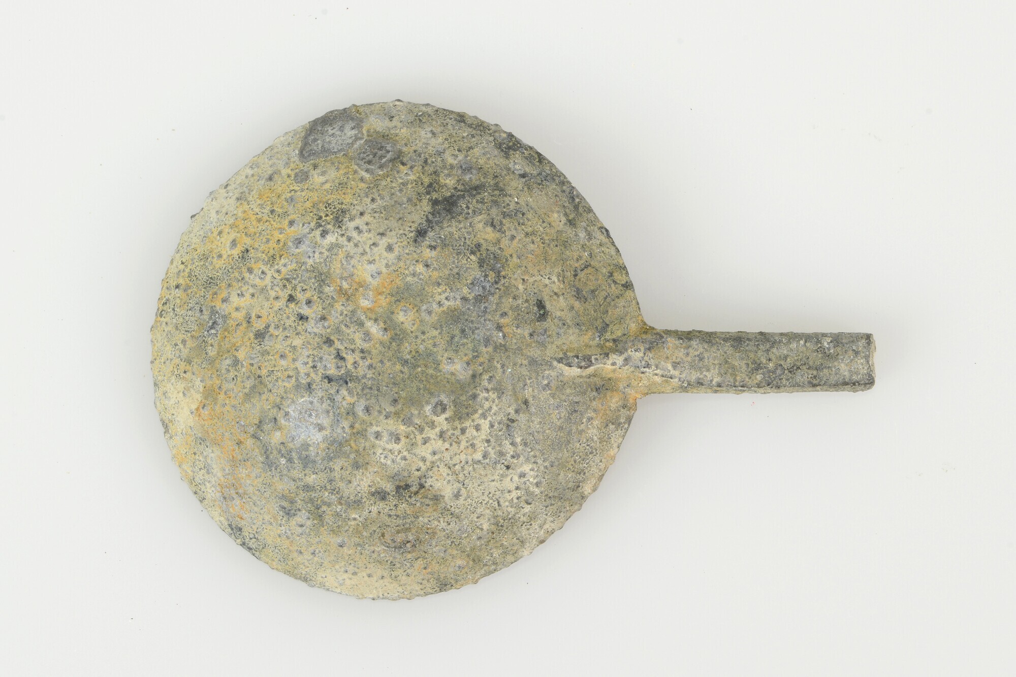 Lepel; ronde bak; platte zeskantige steel; merkteken in de bak: gekroonde Tudorroos