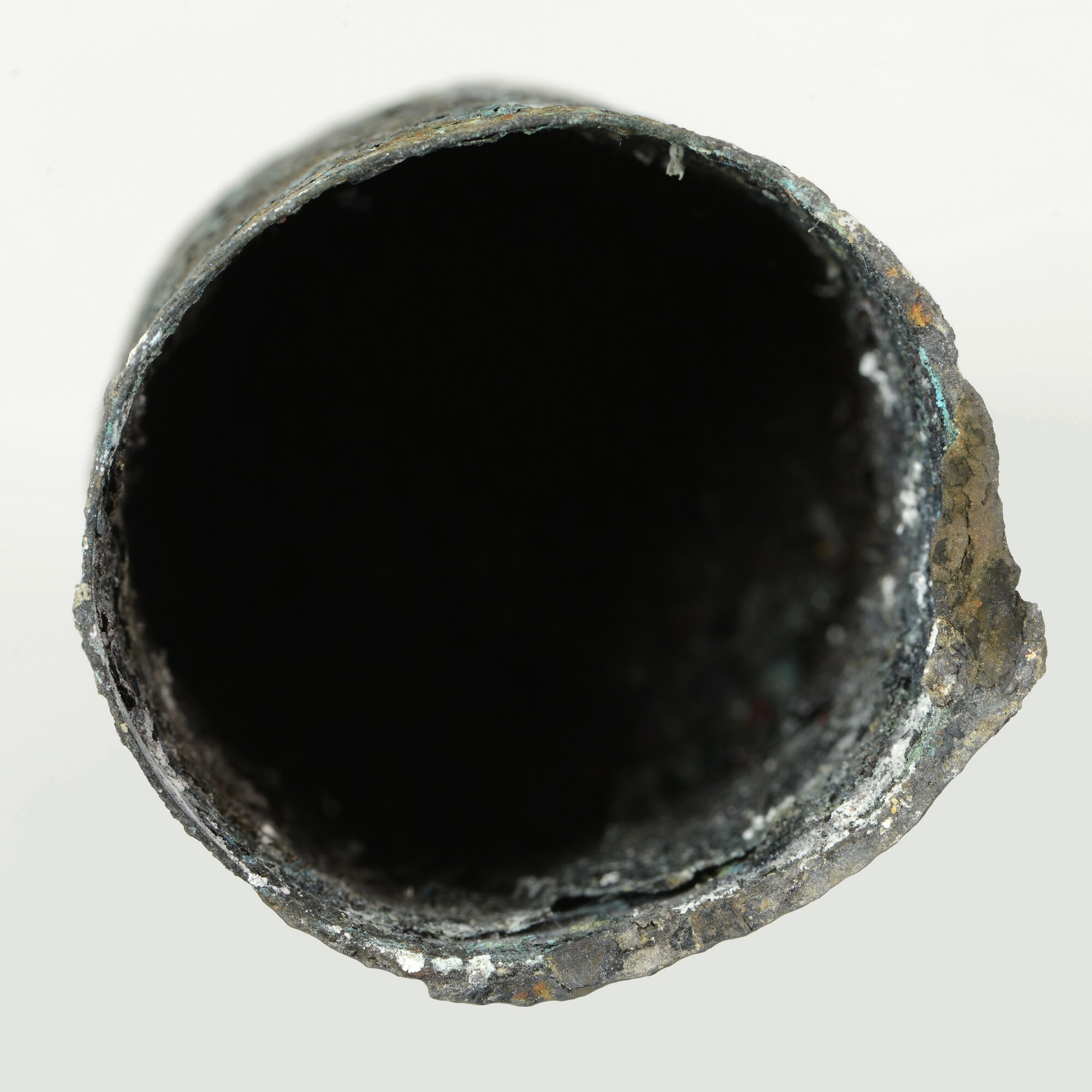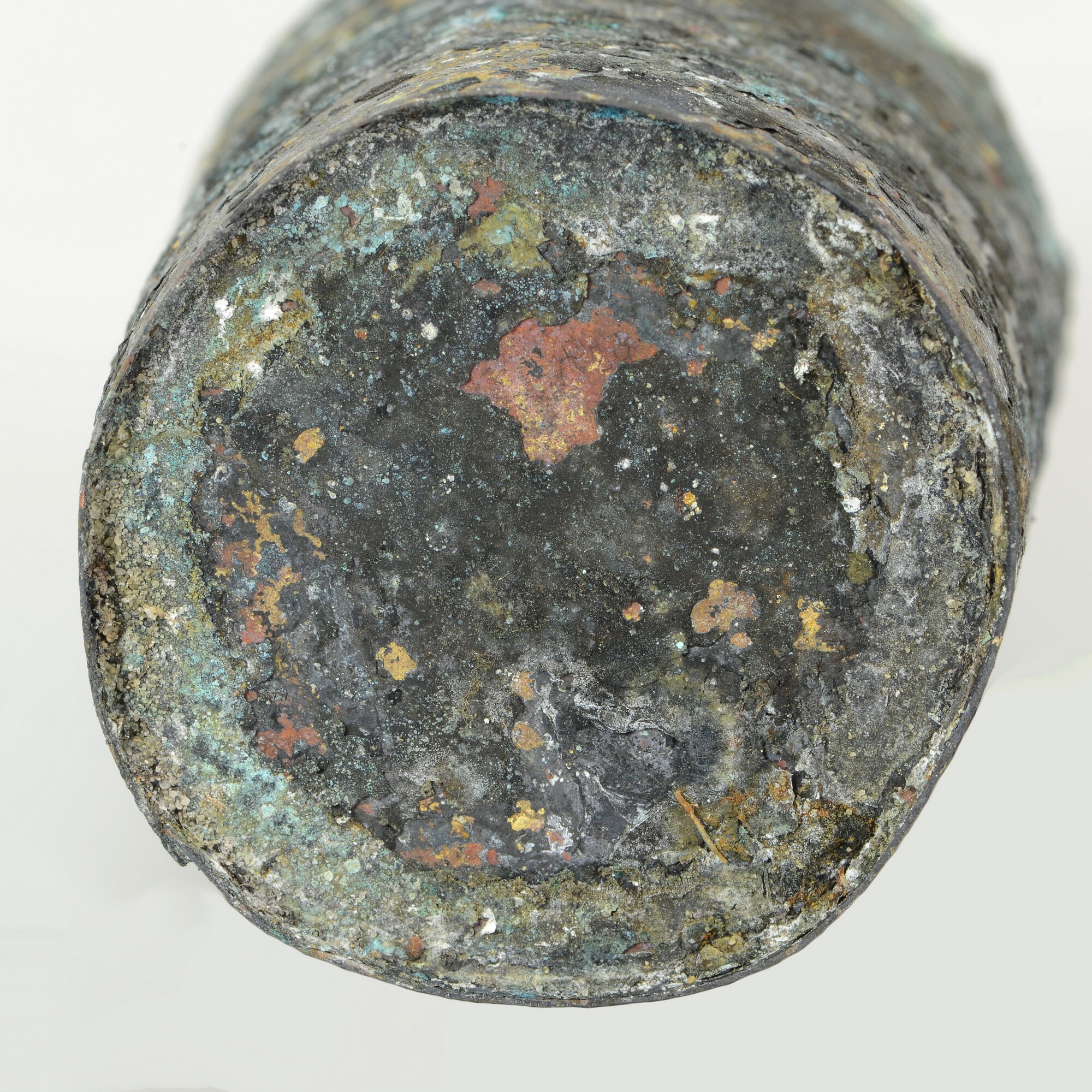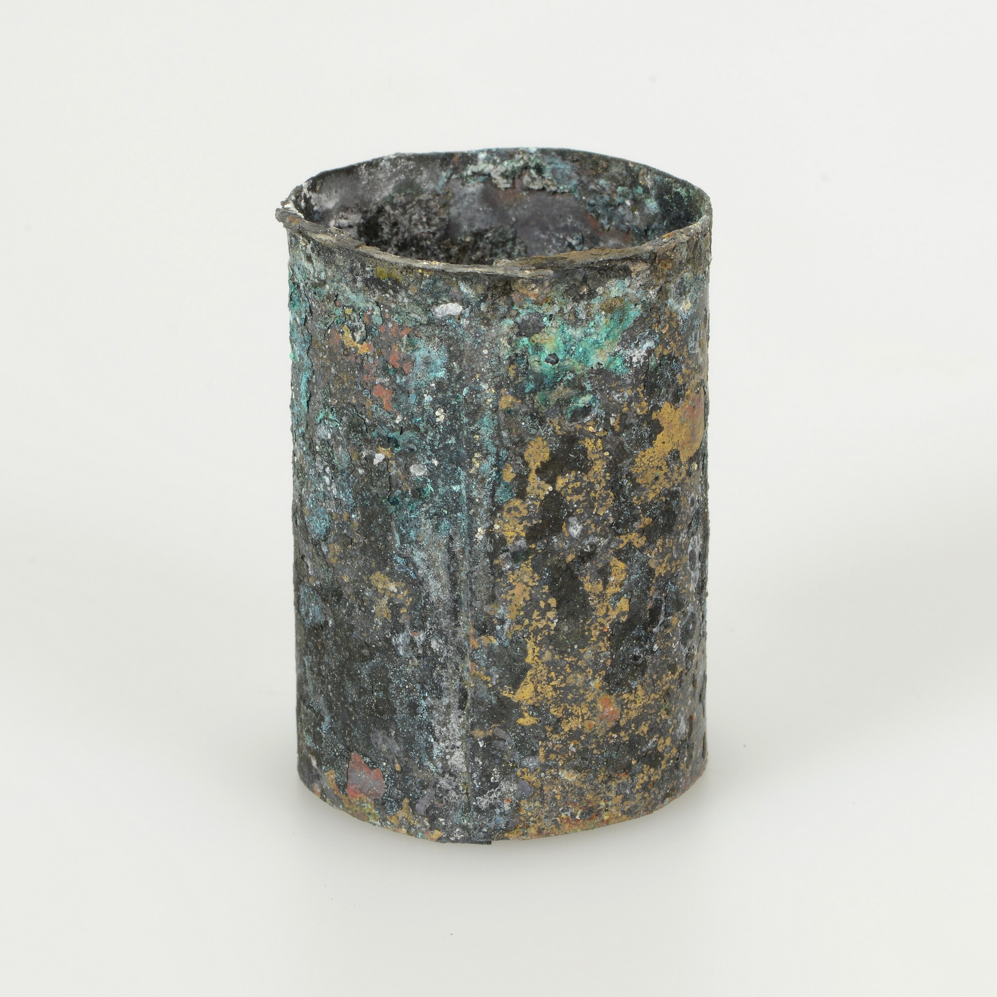 Beker of huls? Standring; heeft mogelijk een deksel gehad of er is een ander object aan vastgecorrodeerd geweest