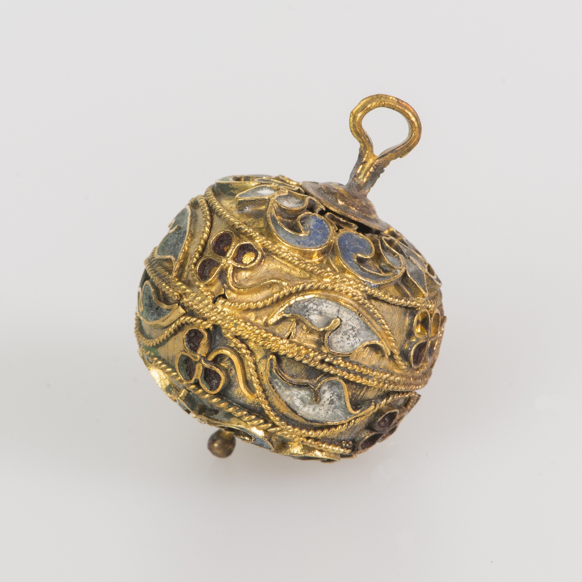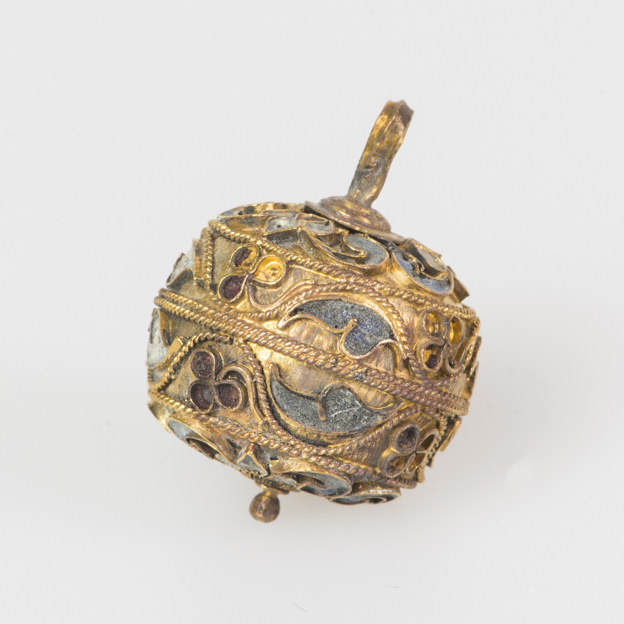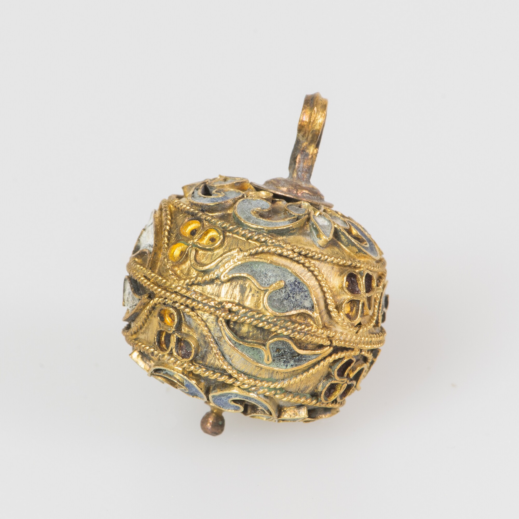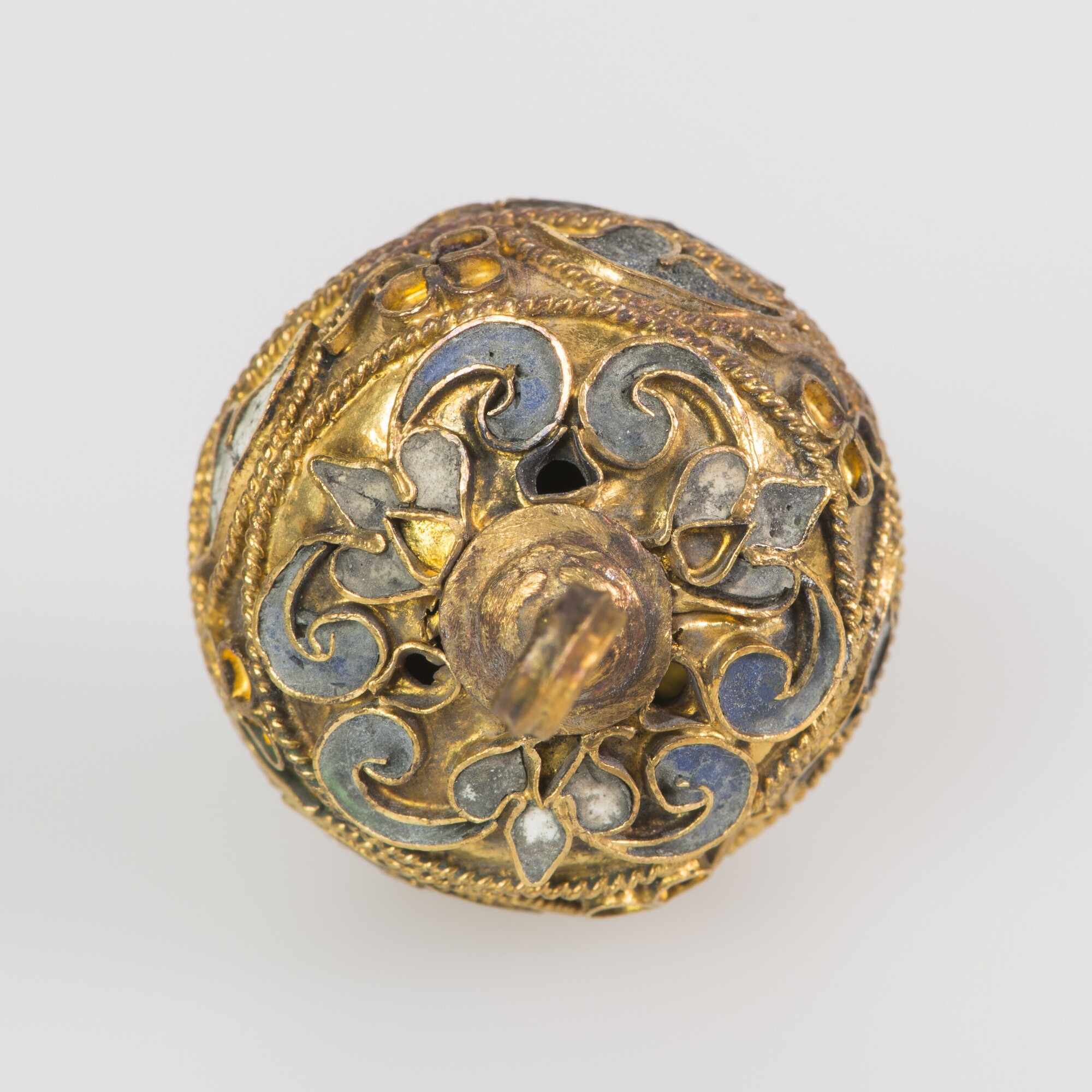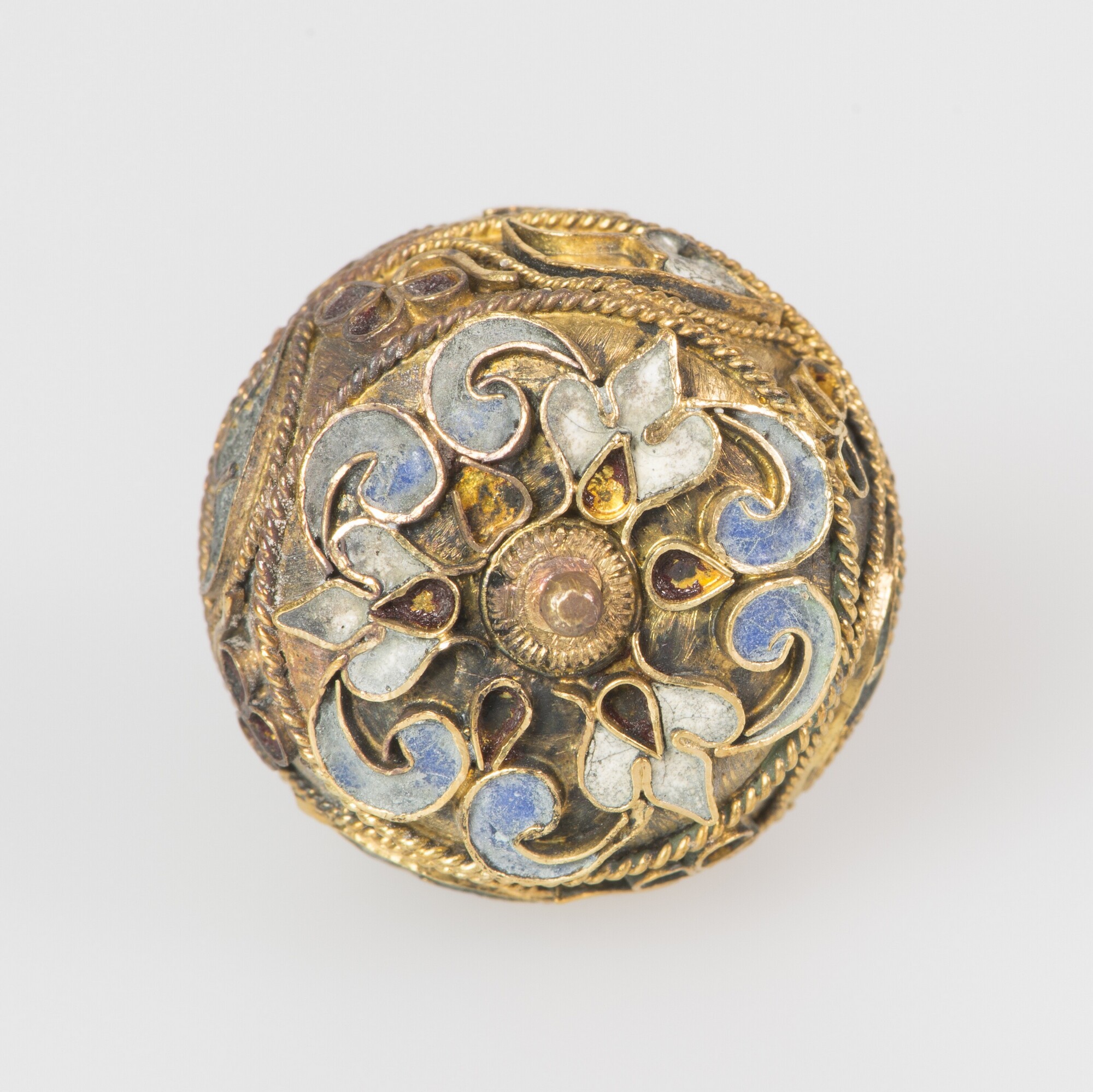 Knoop; draadoog; bolle knop aan onderzijde; filigraandraad; blauw, rood en wit email; knoop heeft een oude reparatie herkenbaar aan het schijfje onder de lus, verstevigd met pen dwars door de knoop; gewicht: 7.19 gram