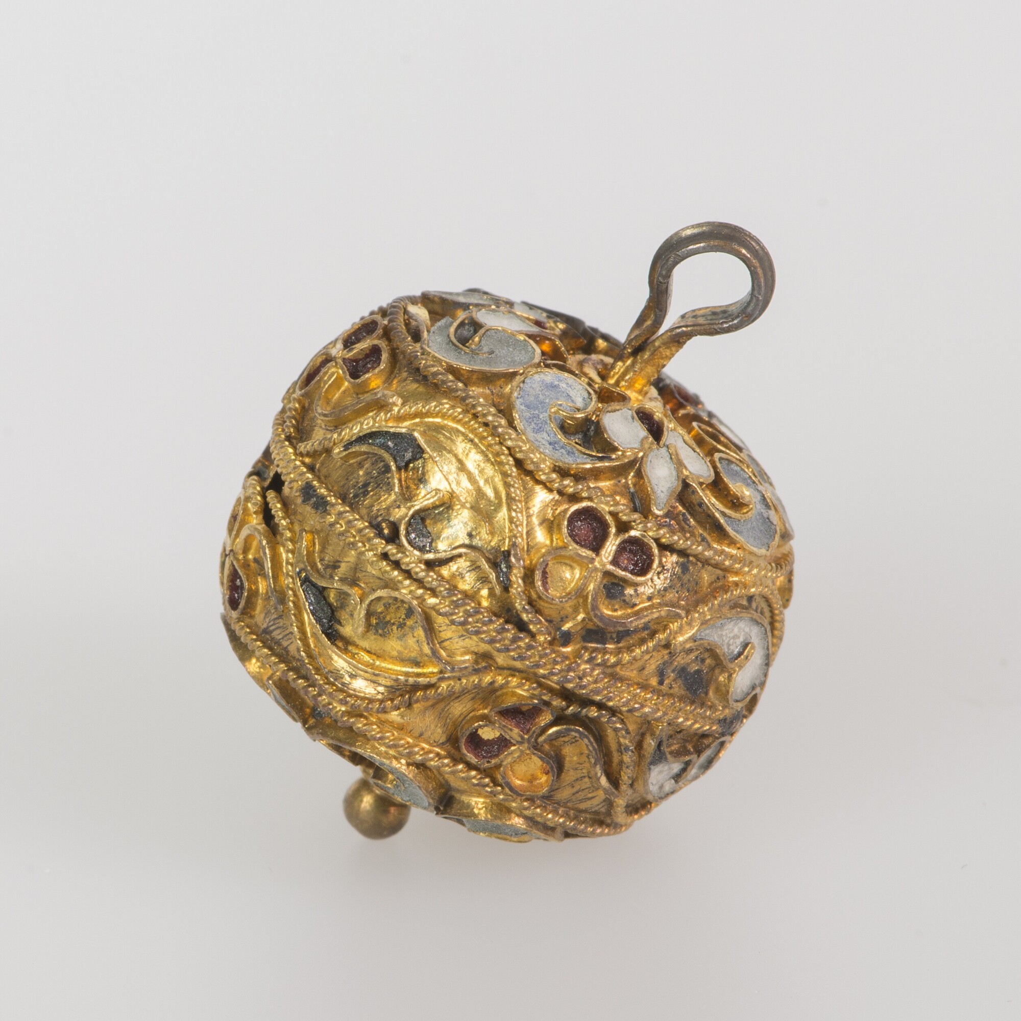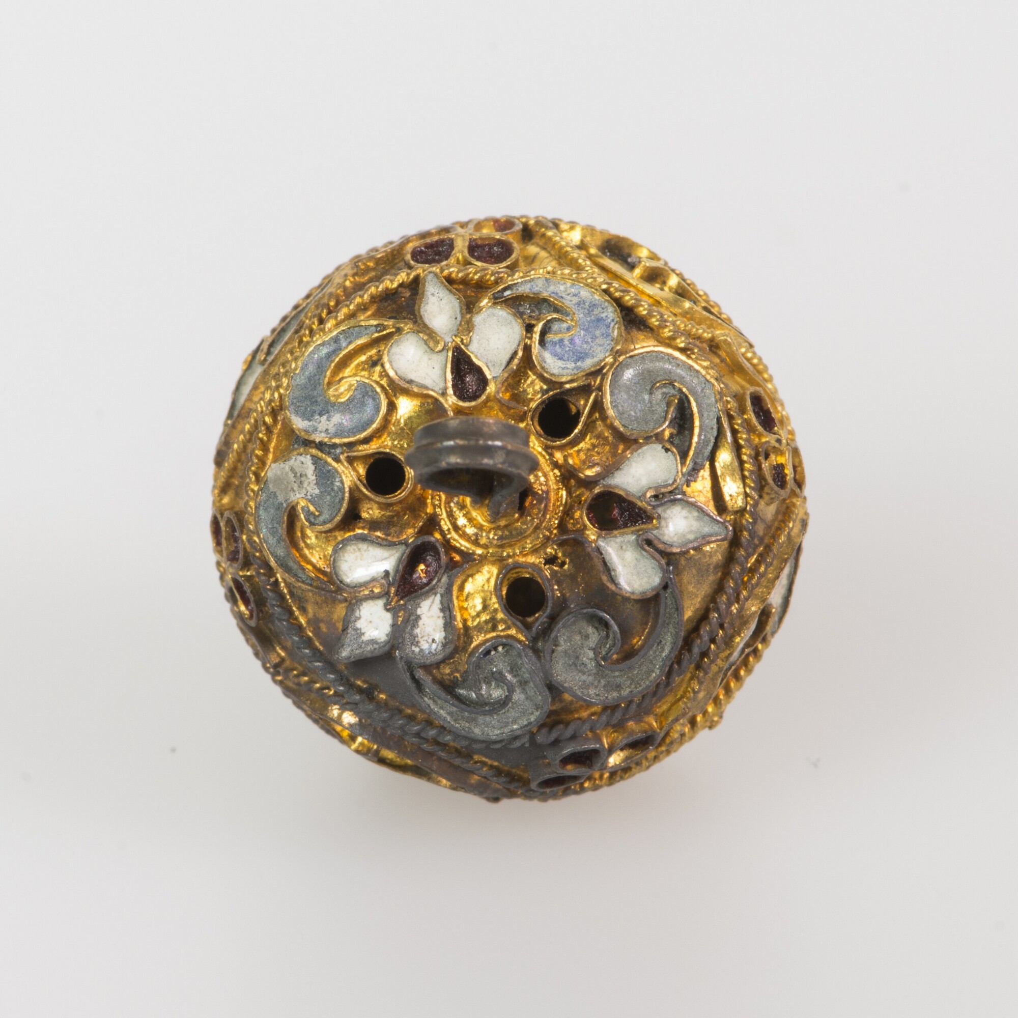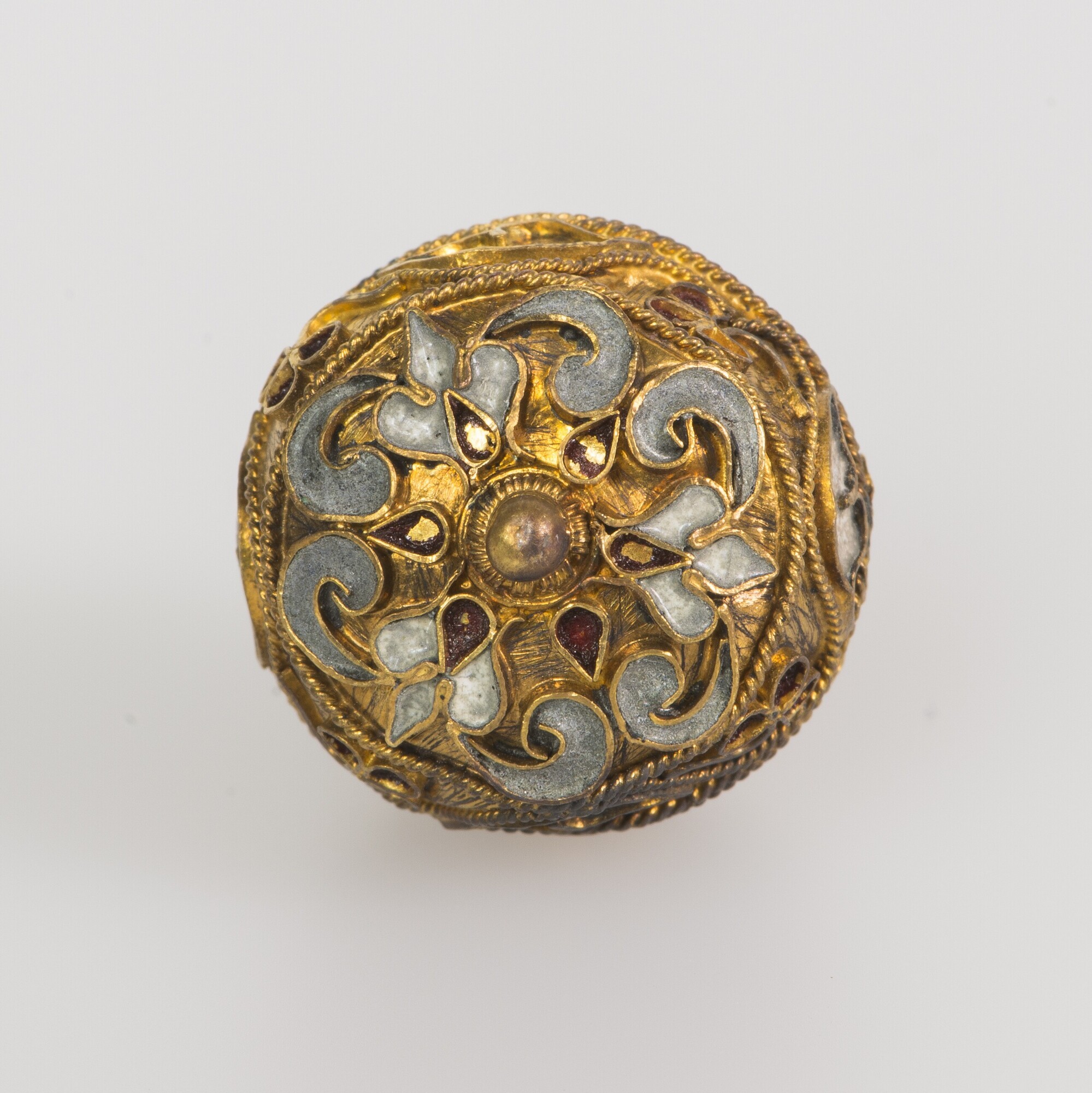 Knoop; draadoog; bolle knop aan onderzijde; filigraandraad; blauw, rood en wit email; gewicht: 6.06 gram