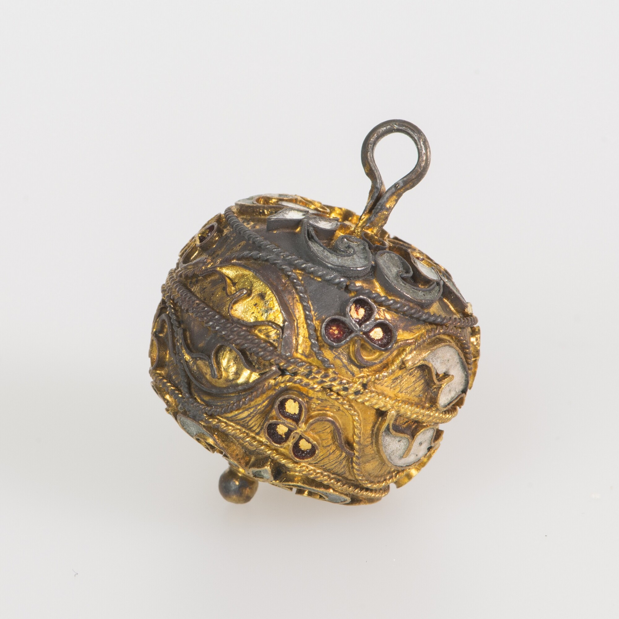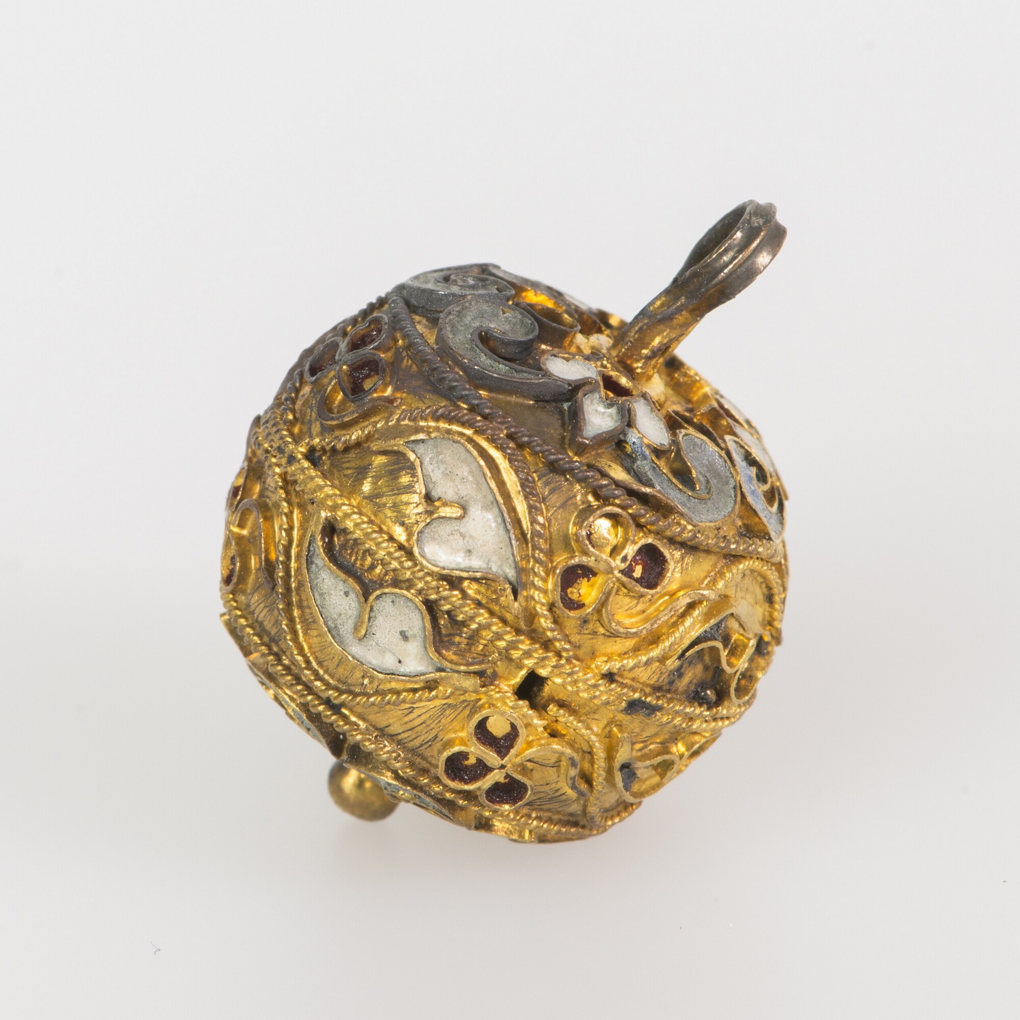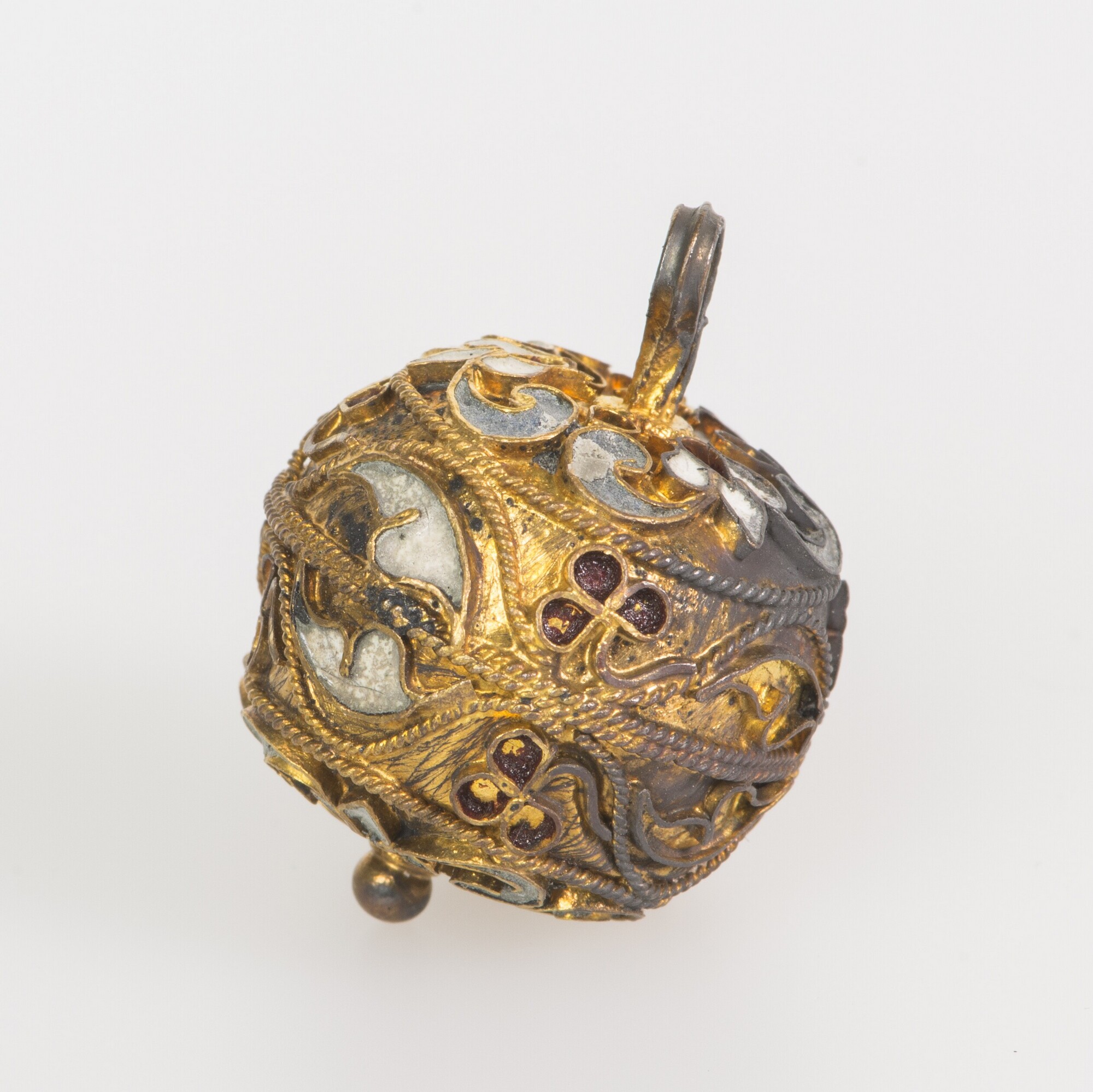Knoop; draadoog; bolle knop aan onderzijde; filigraandraad; blauw, rood en wit email; gewicht: 6.06 gram