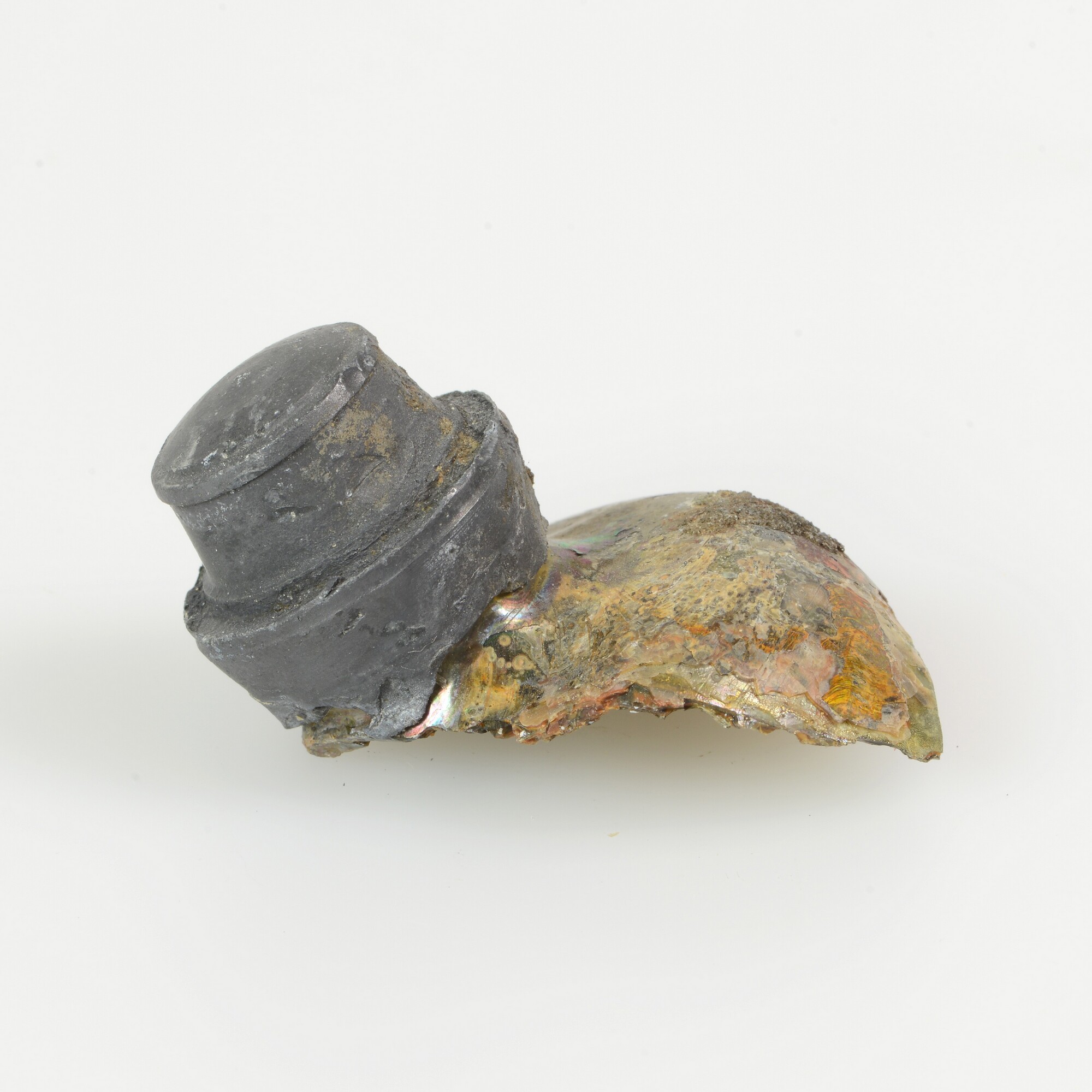 Kelderfles; gl-fle-7; hoge vierzijdige fles, groter dan 13 cm, met korte hals, standvlak op licht opgestoken bodem met pontilmerk; groen glas; geprofileerde sluitdop van lood-tinlegering; herkomst: Nederland of Duitsland