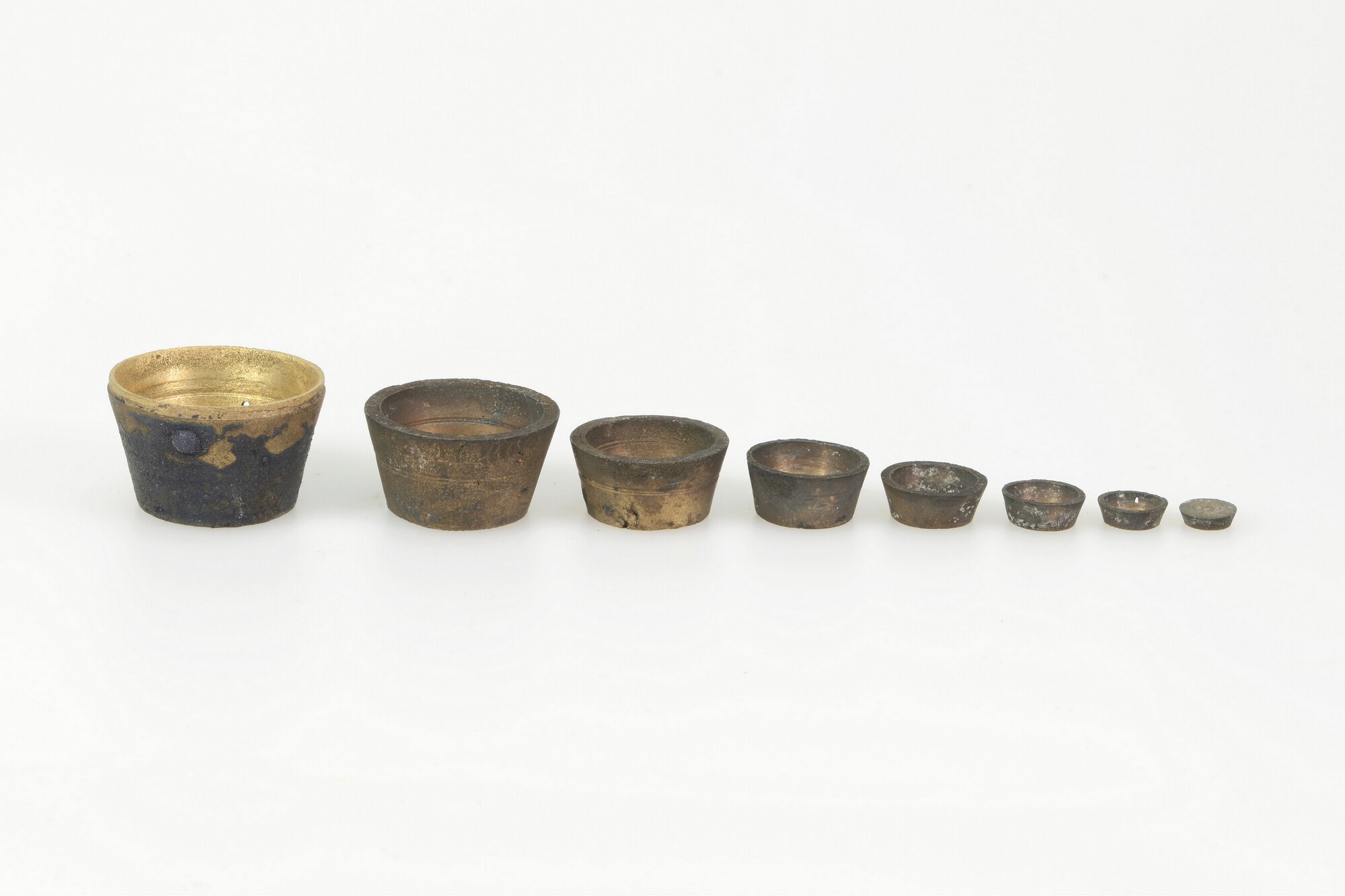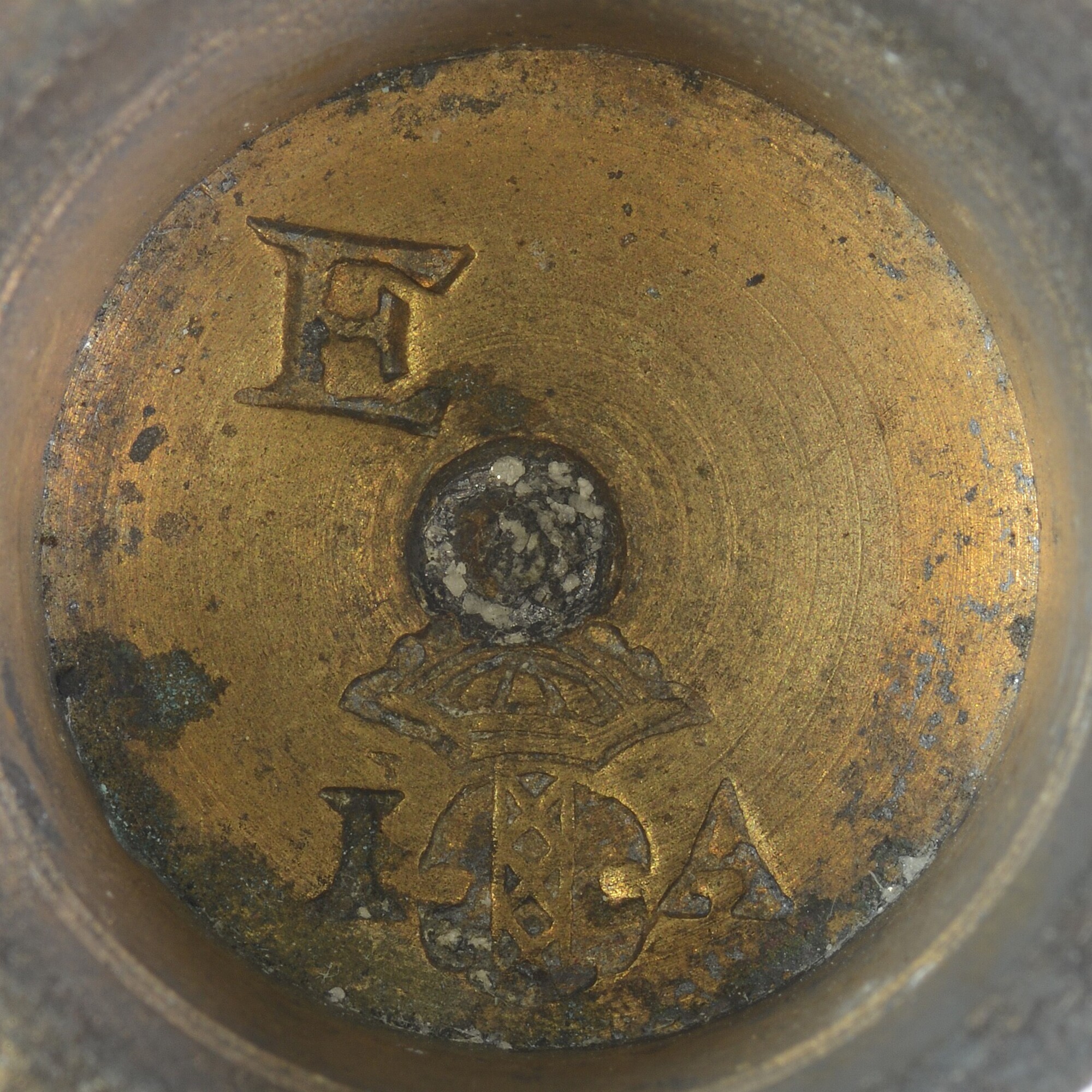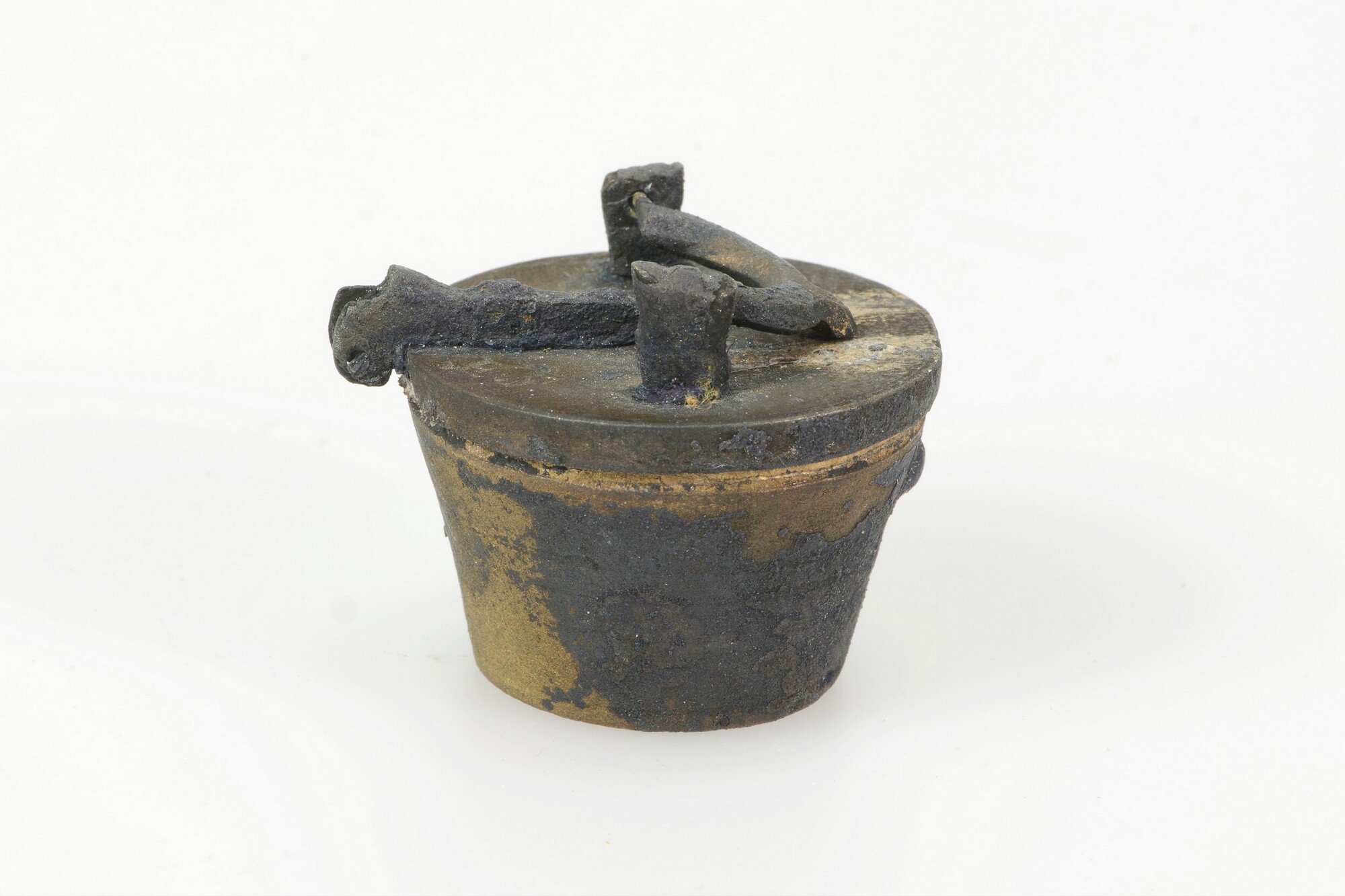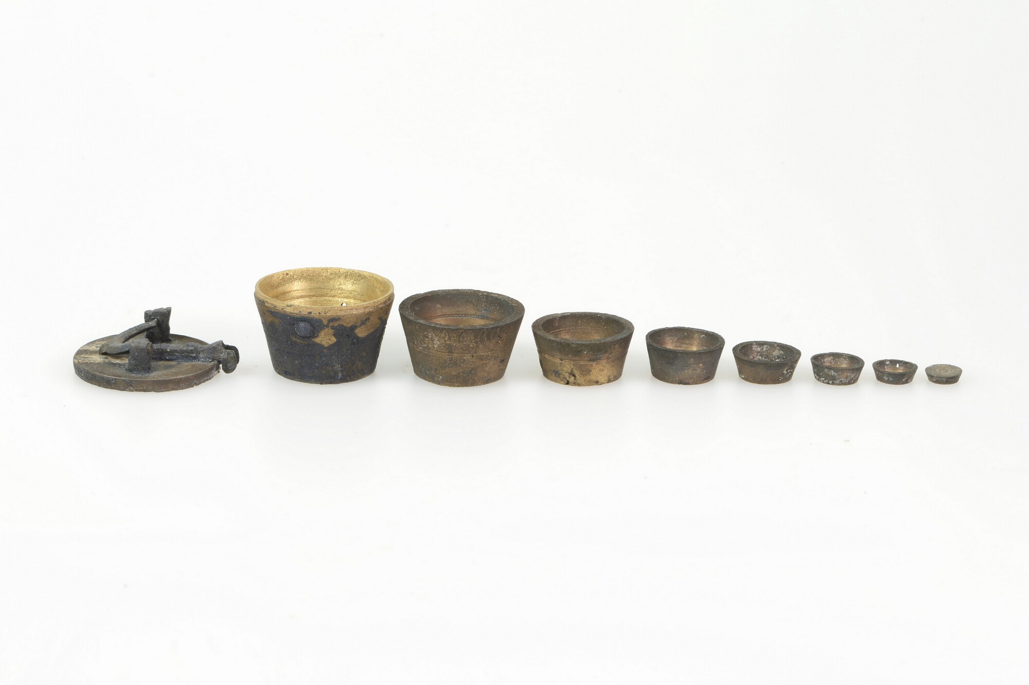 Sluitgewicht/pijlgewicht voor een half Amsterdams pond; type van voor 1650; zeven bakjes en een kleinste, massief gewichtje (sluitstuk); deksel met sluiting en handvat aan de bovenkant; (gieters)merk op het deksel; het buitenste bakje is binnenin geijkt met het wapen van Amsterdam met aan weerszijden de letters I en A; het tweede bakje idem met een ...