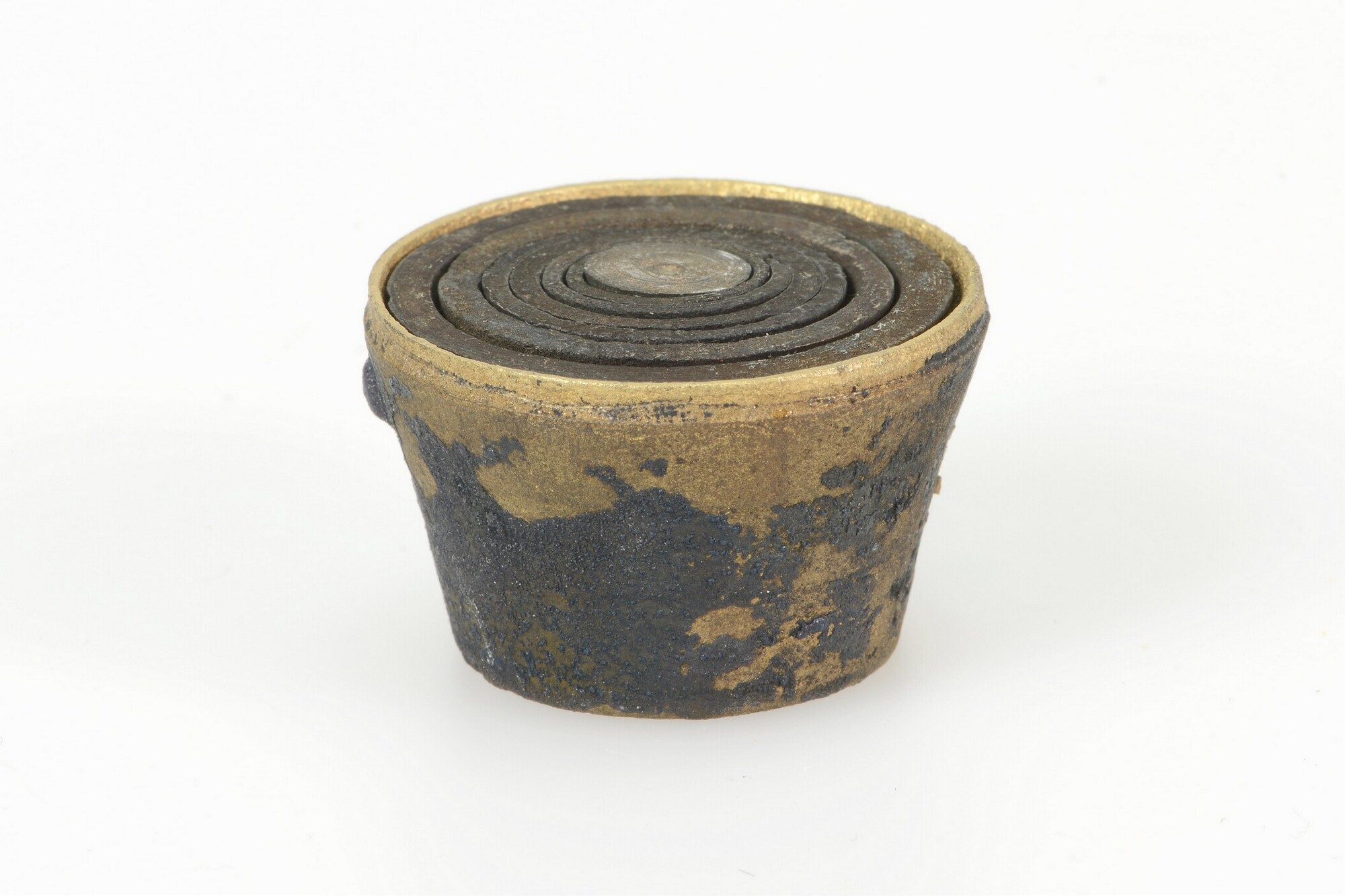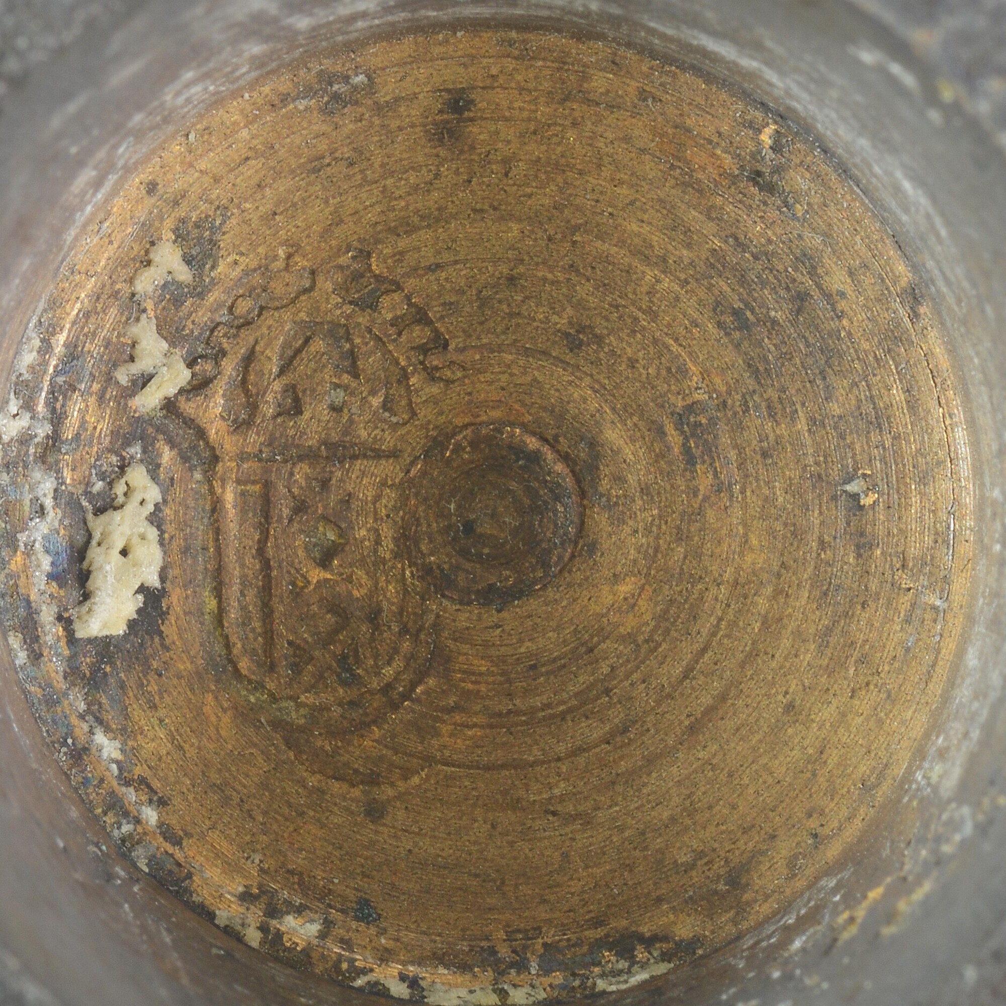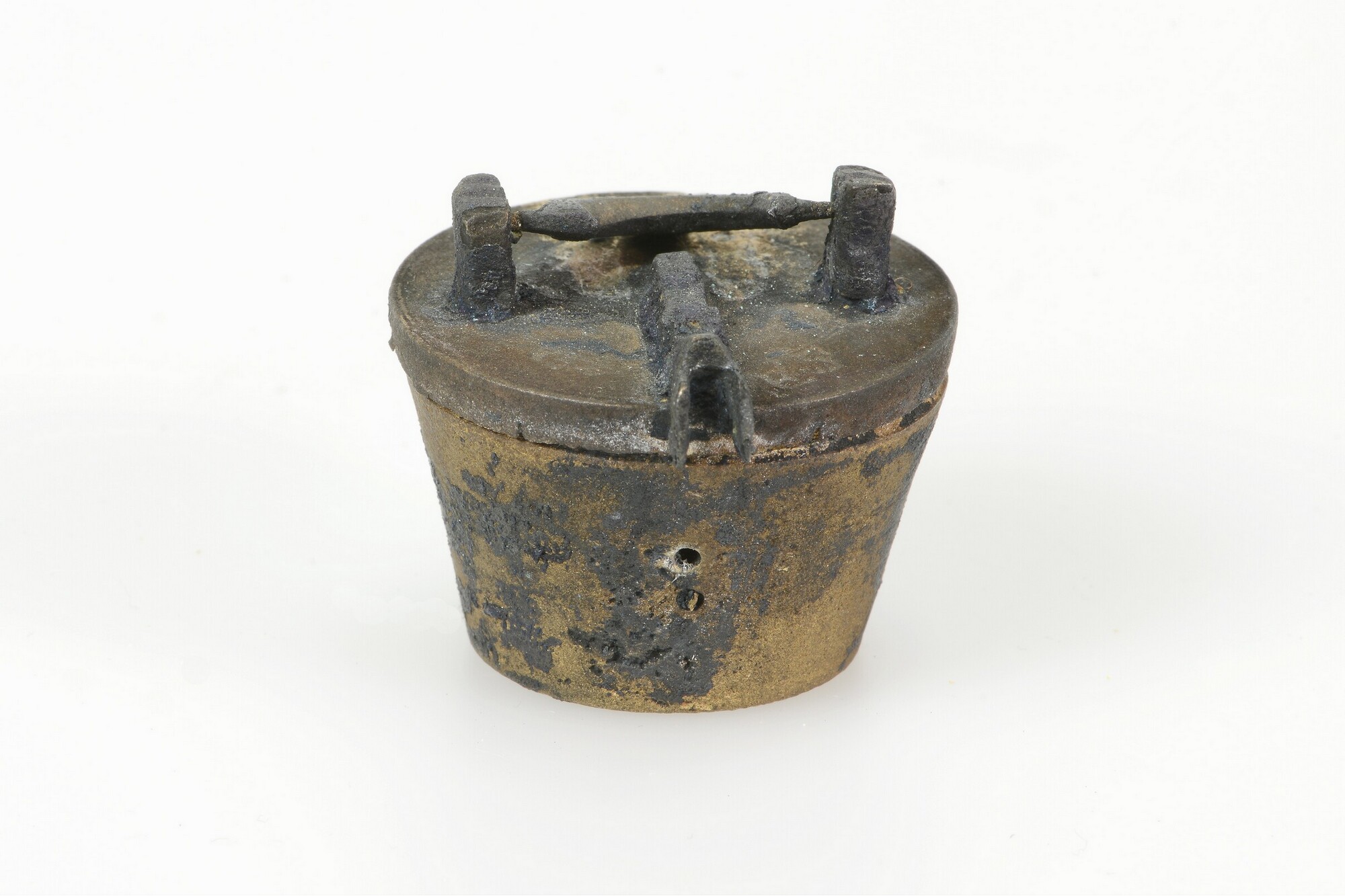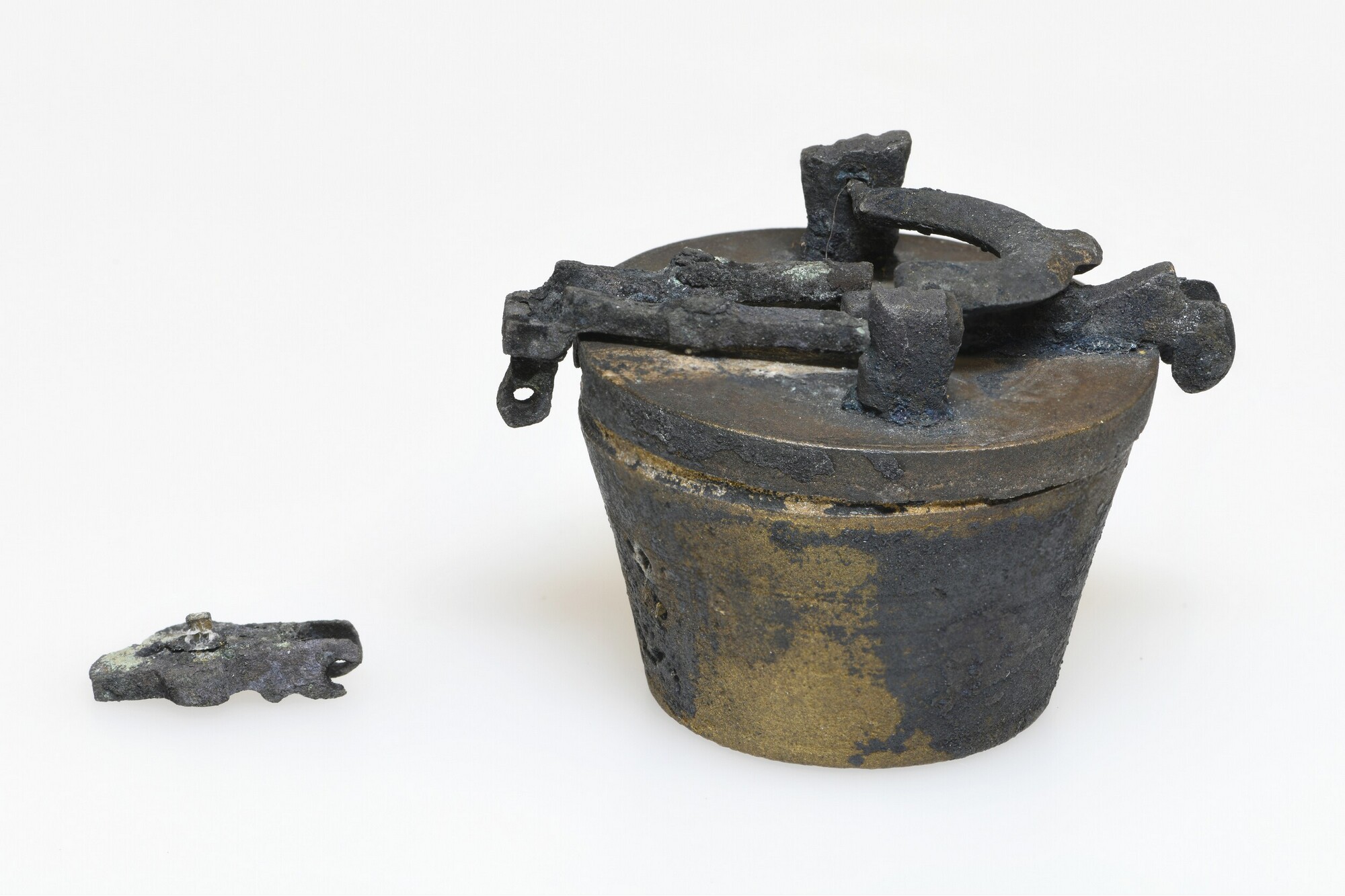 Sluitgewicht/pijlgewicht voor een half Amsterdams pond; type van voor 1650; zeven bakjes en een kleinste, massief gewichtje (sluitstuk); deksel met sluiting en handvat aan de bovenkant; (gieters)merk op het deksel; het buitenste bakje is binnenin geijkt met het wapen van Amsterdam met aan weerszijden de letters I en A; het tweede bakje idem met een ...
