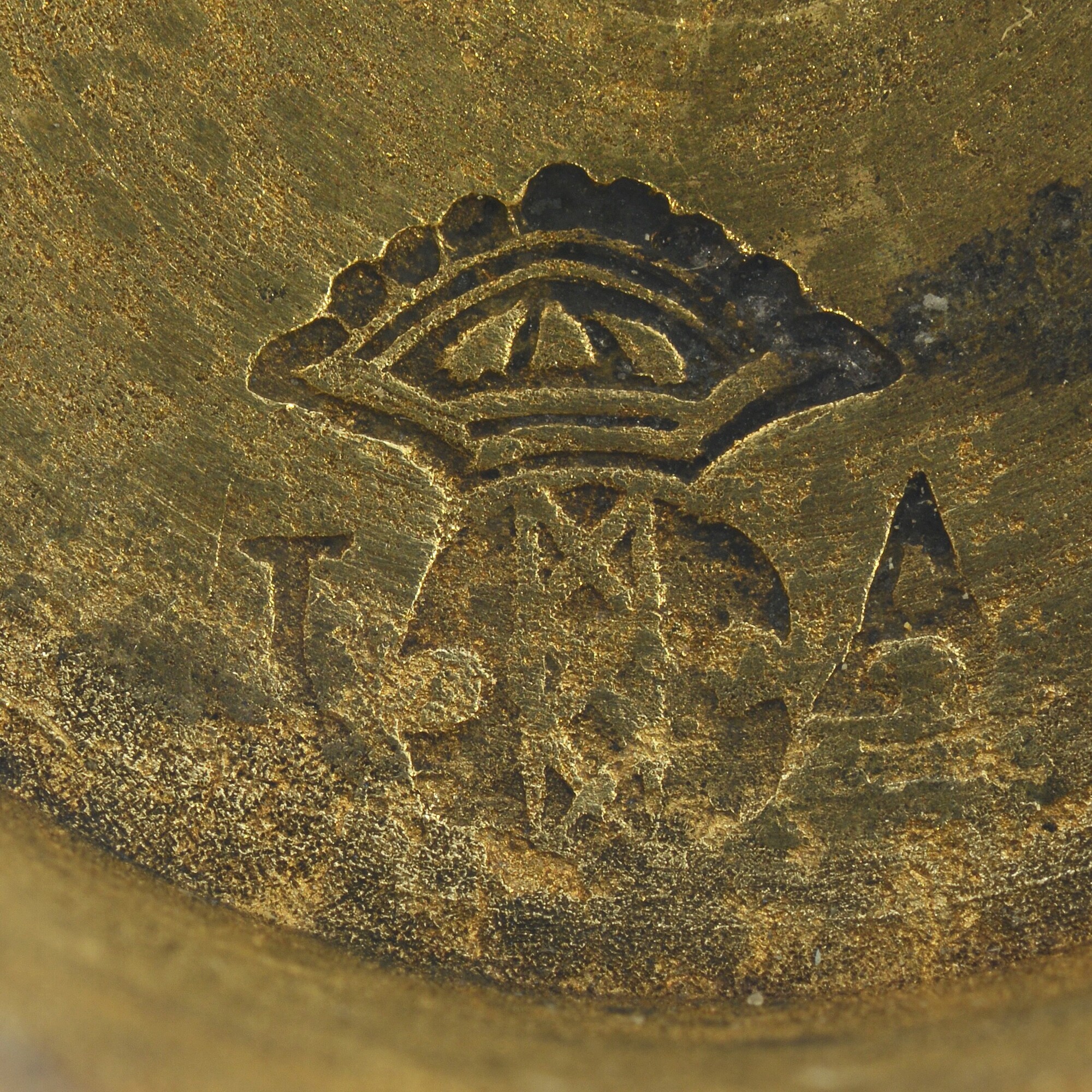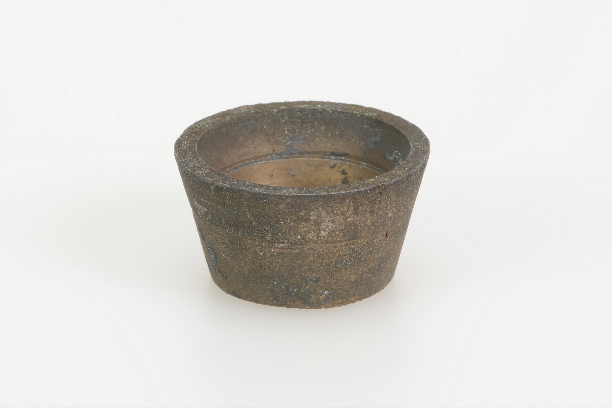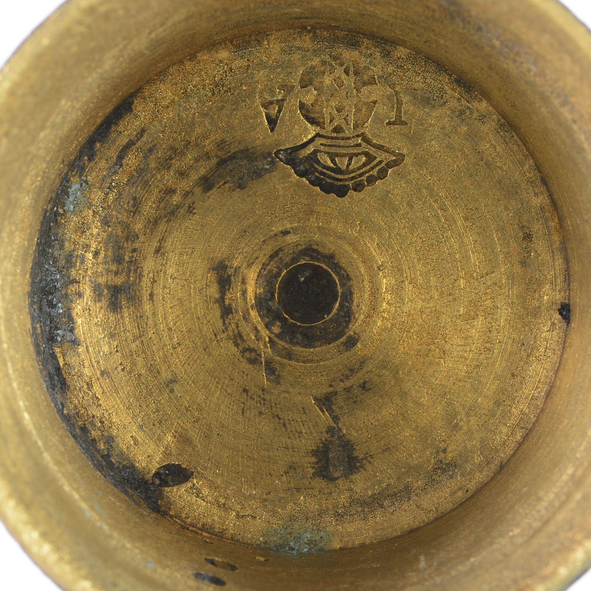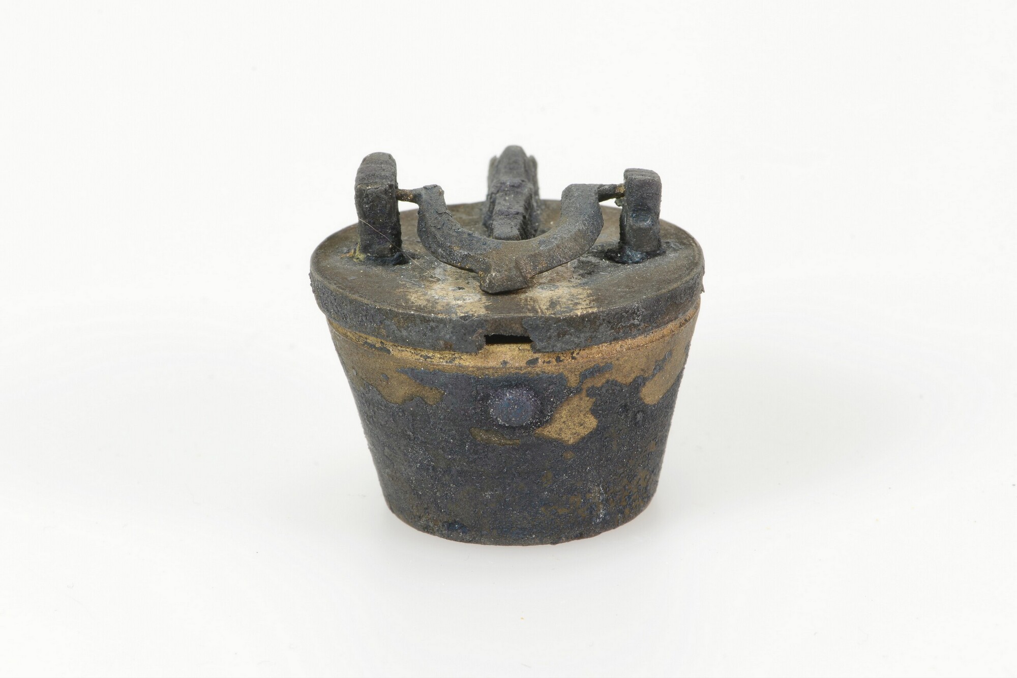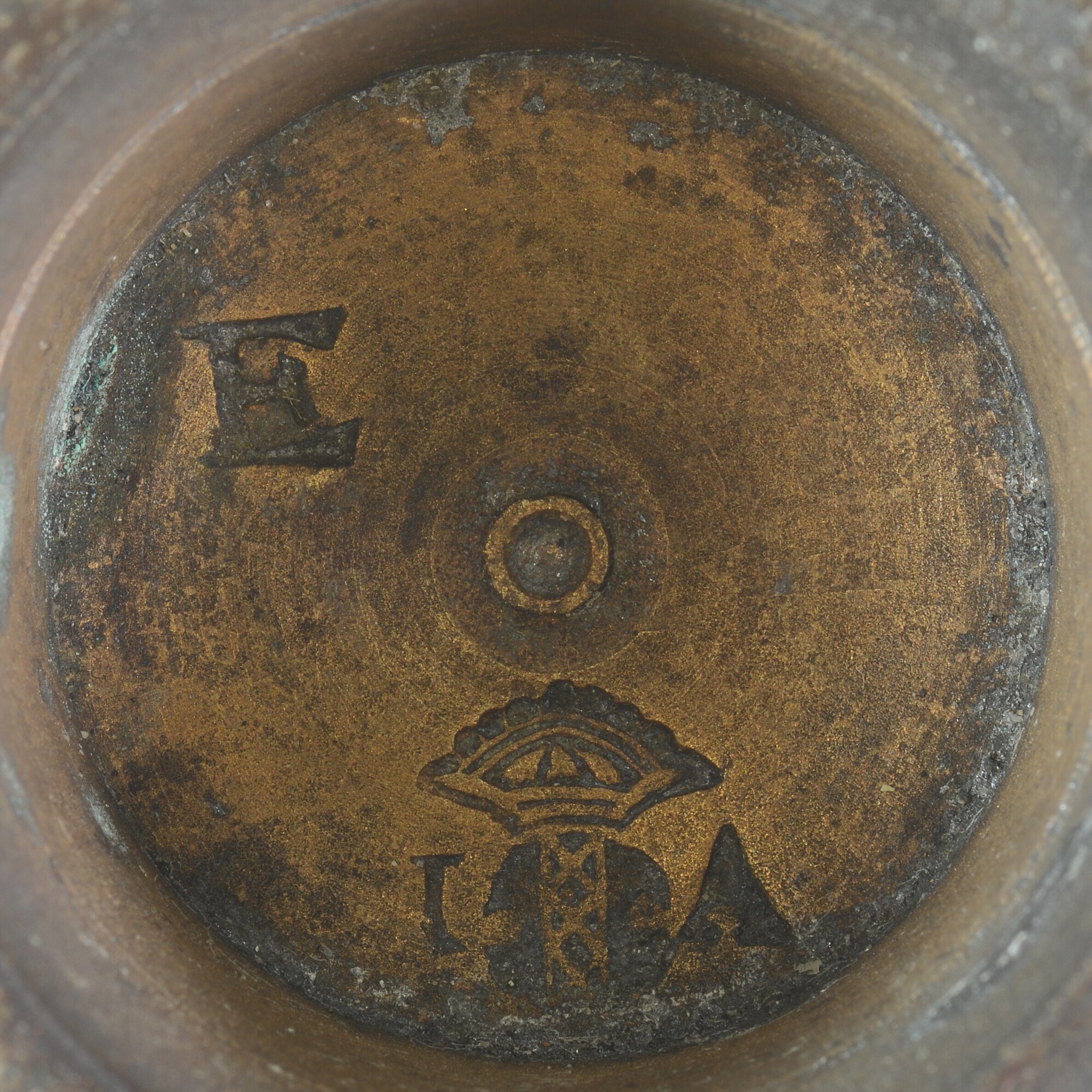 Sluitgewicht/pijlgewicht voor een half Amsterdams pond; type van voor 1650; zeven bakjes en een kleinste, massief gewichtje (sluitstuk); deksel met sluiting en handvat aan de bovenkant; (gieters)merk op het deksel; het buitenste bakje is binnenin geijkt met het wapen van Amsterdam met aan weerszijden de letters I en A; het tweede bakje idem met een ...